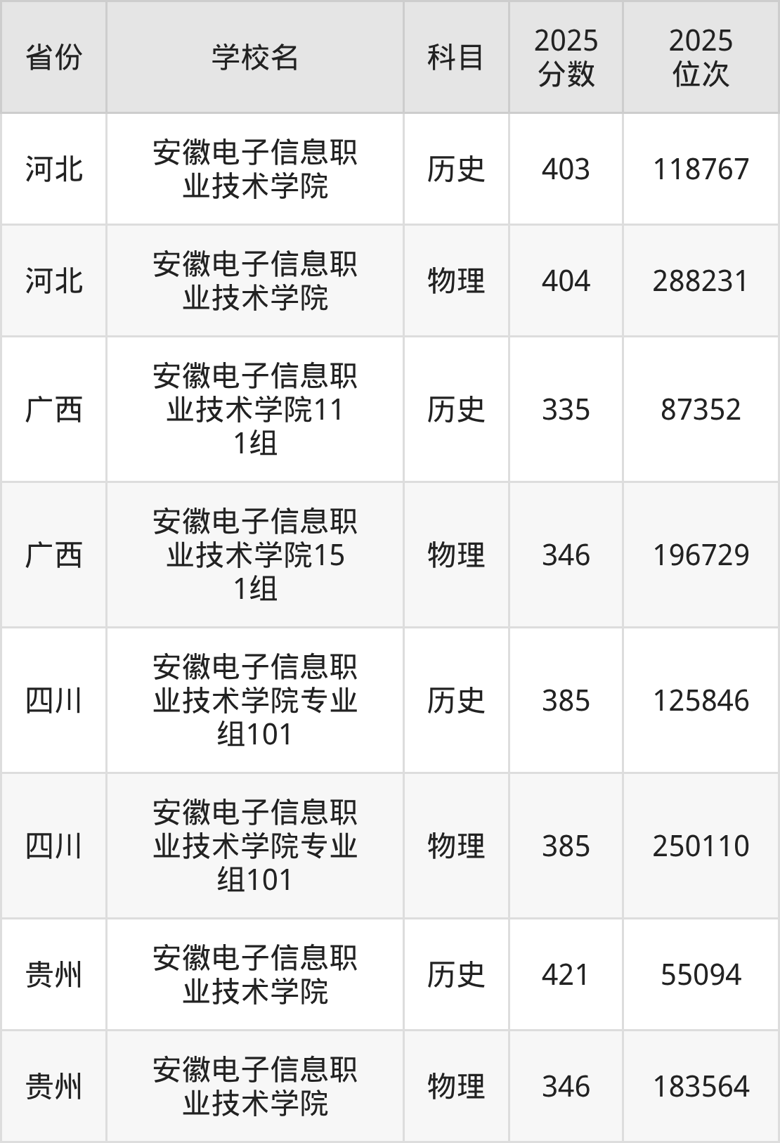 2025年安徽电子信息职业技术学院在省内分历史物理科目类录取,其中历史类最低分是379分、对应位次是95443名;物理类最低分是384分,对应位次是269037名。