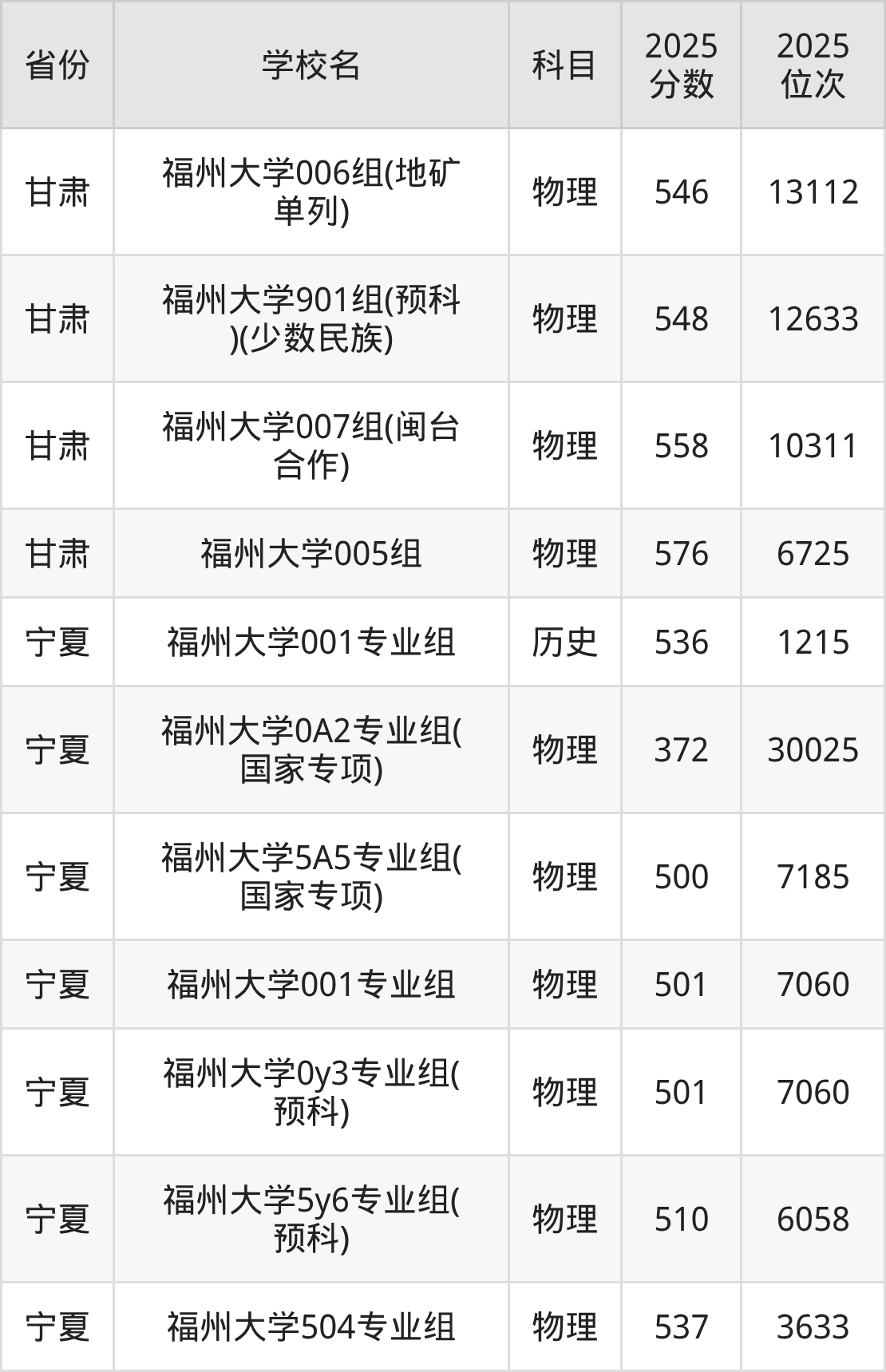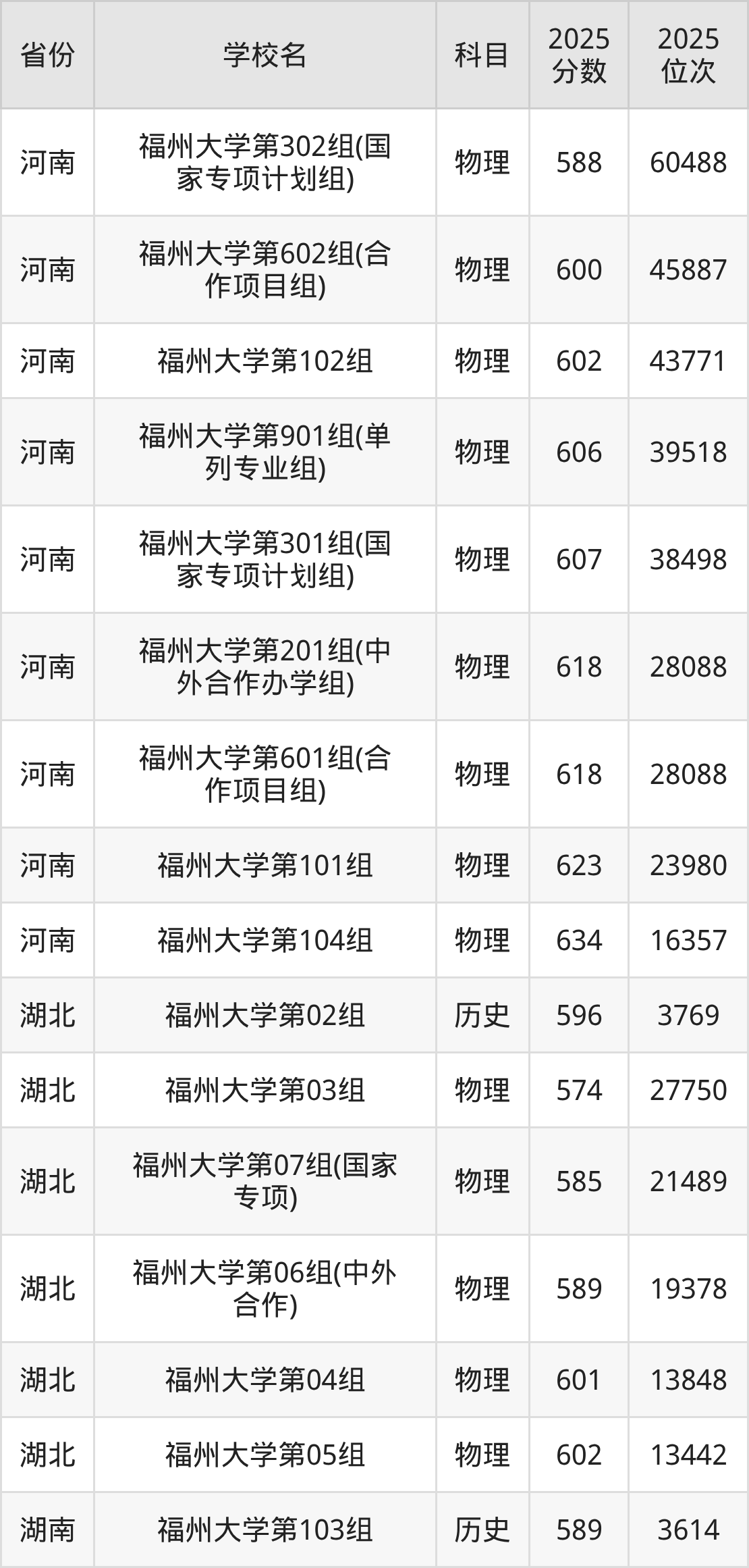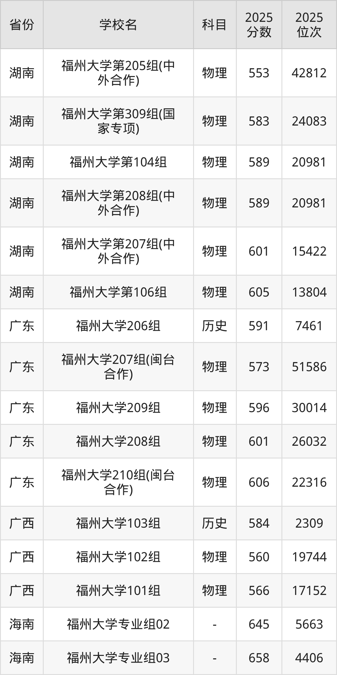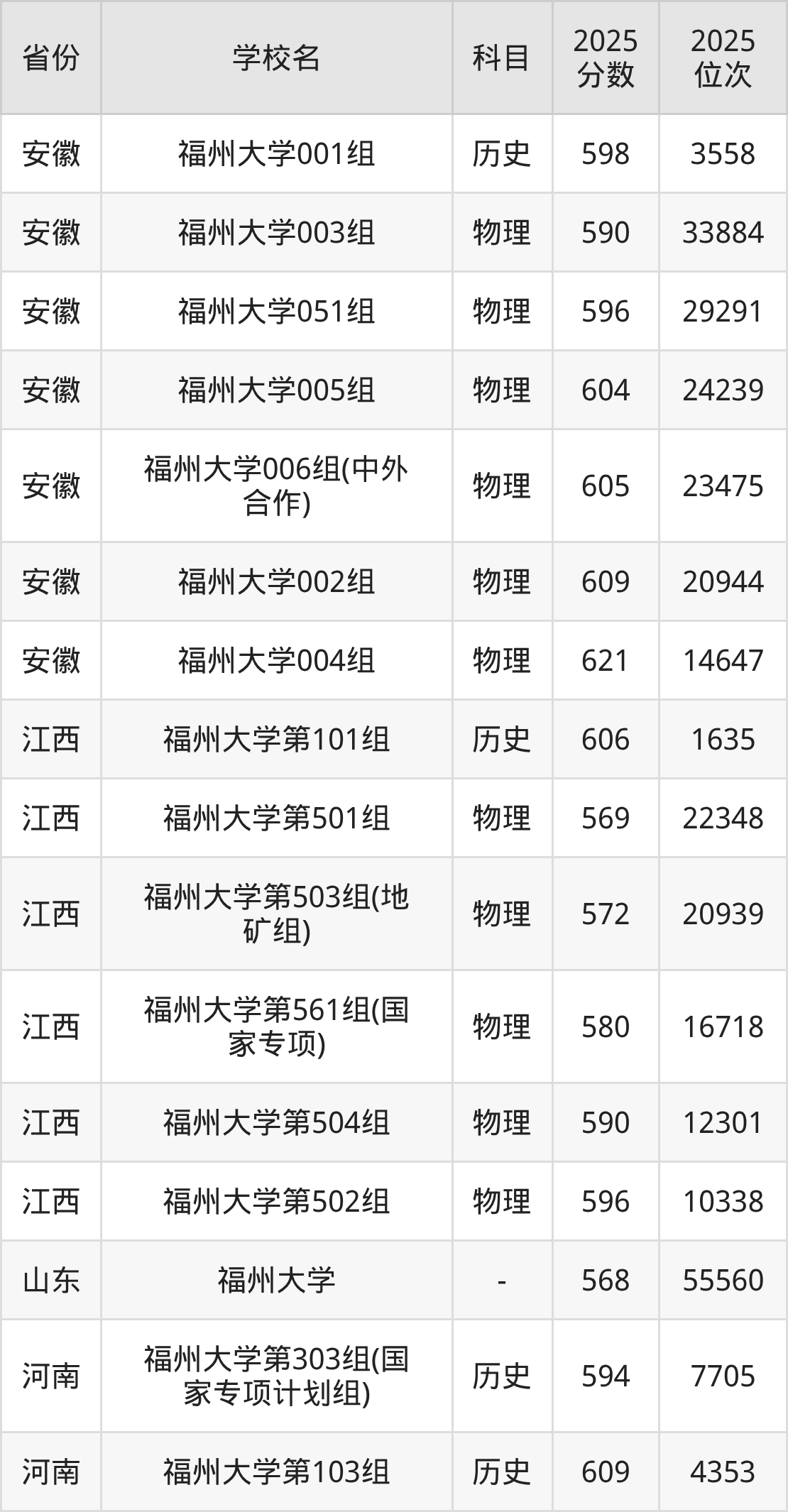 | 福州大学(地矿 类)专业组:5 00 | 物理 | 580 | 20313 |