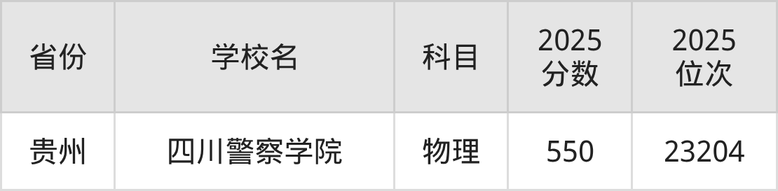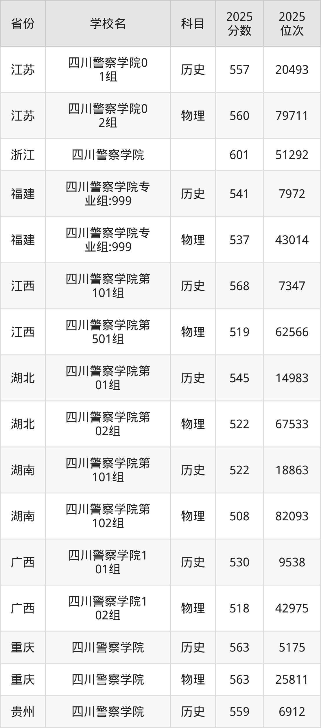 2025年四川警察学院在省内分历史物理科目类录取,其中历史类最低分是575分、对应位次是10596名;物理类最低分是556分,对应位次是59373名。
