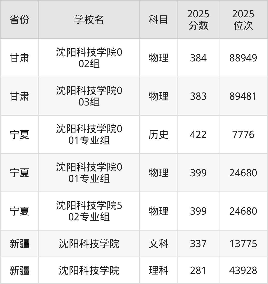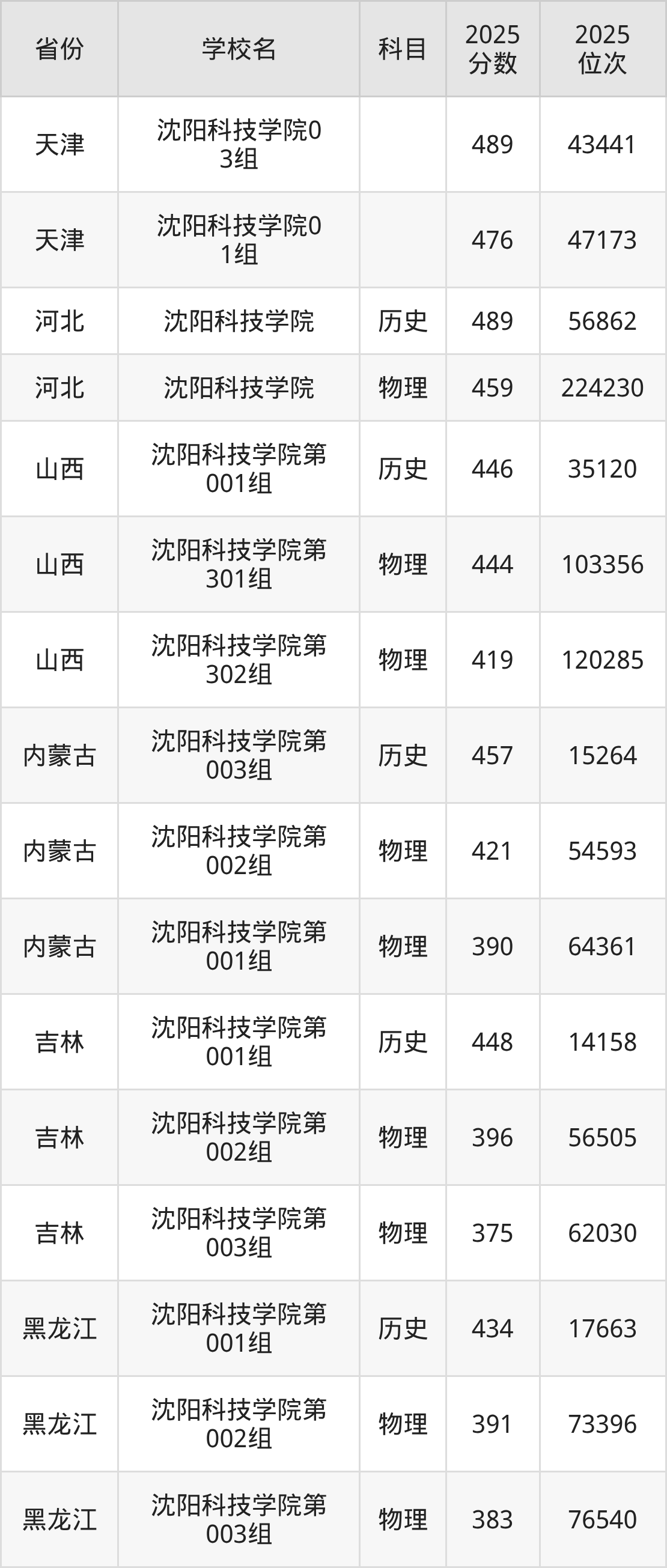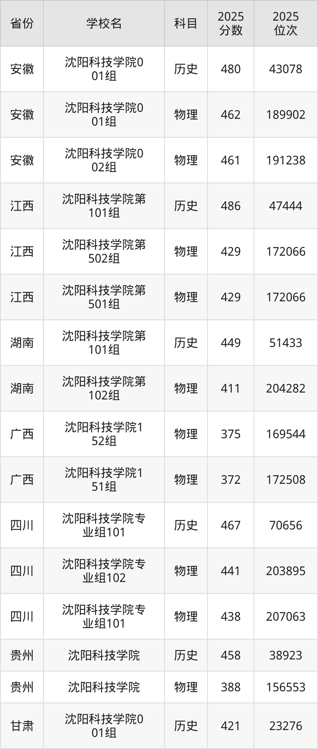 2025年沈阳科技学院历史类最低分437分(26916名)、物理类最低分378分(113948名)。