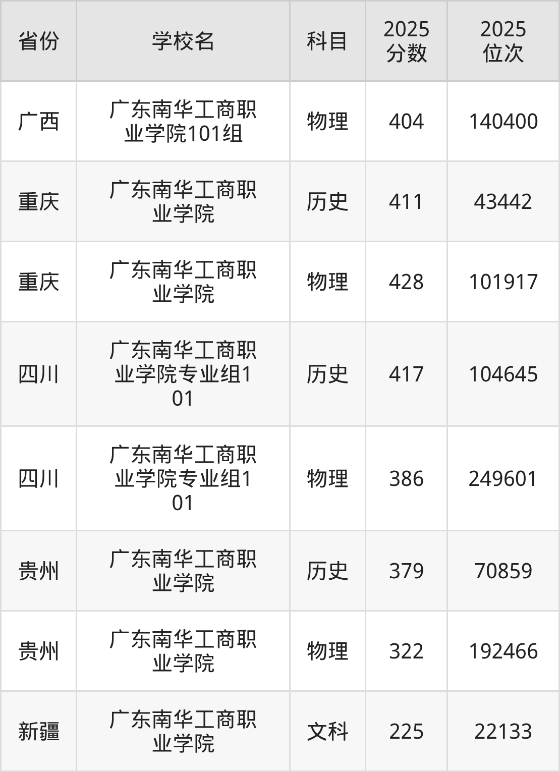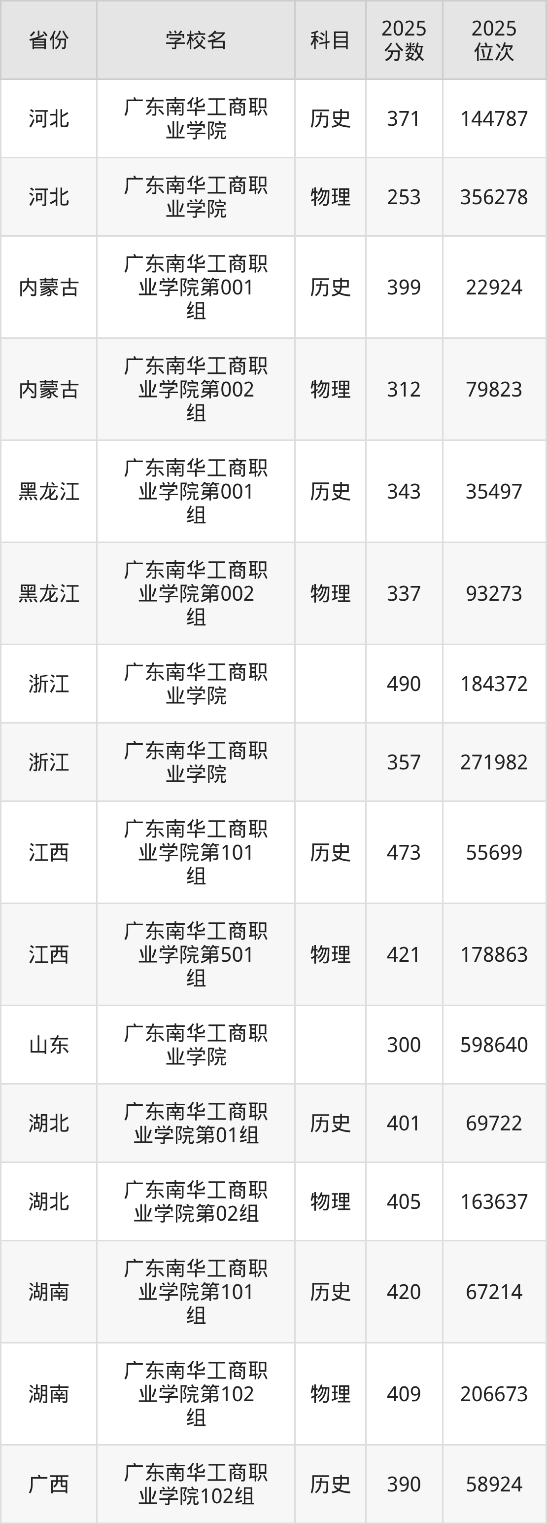 2025年广东南华工商职业学院历史类最低分420分(138665名)、物理类最低分357分(368223名)。