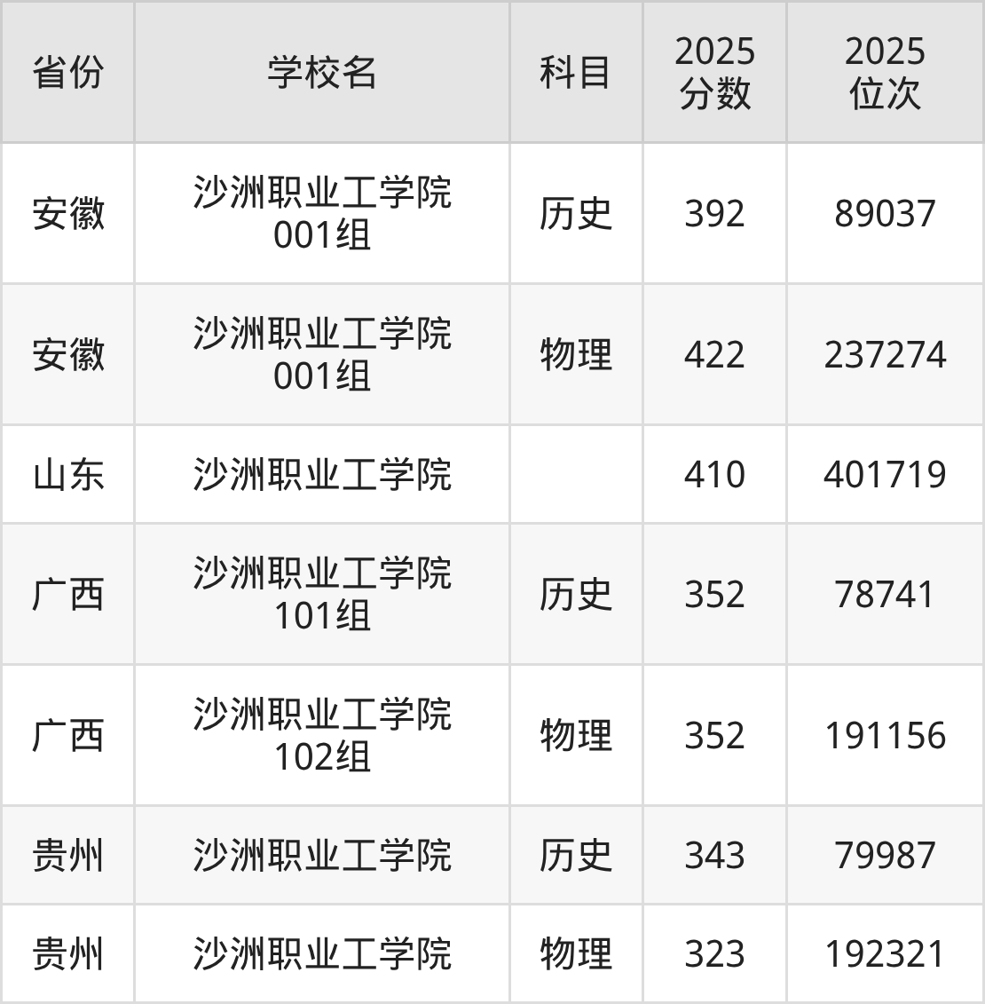 2025年沙洲职业工学院在省内分历史物理科目类录取,其中历史类最低分是407分、对应位次是22997名;物理类最低分是384分,对应位次是51845名。