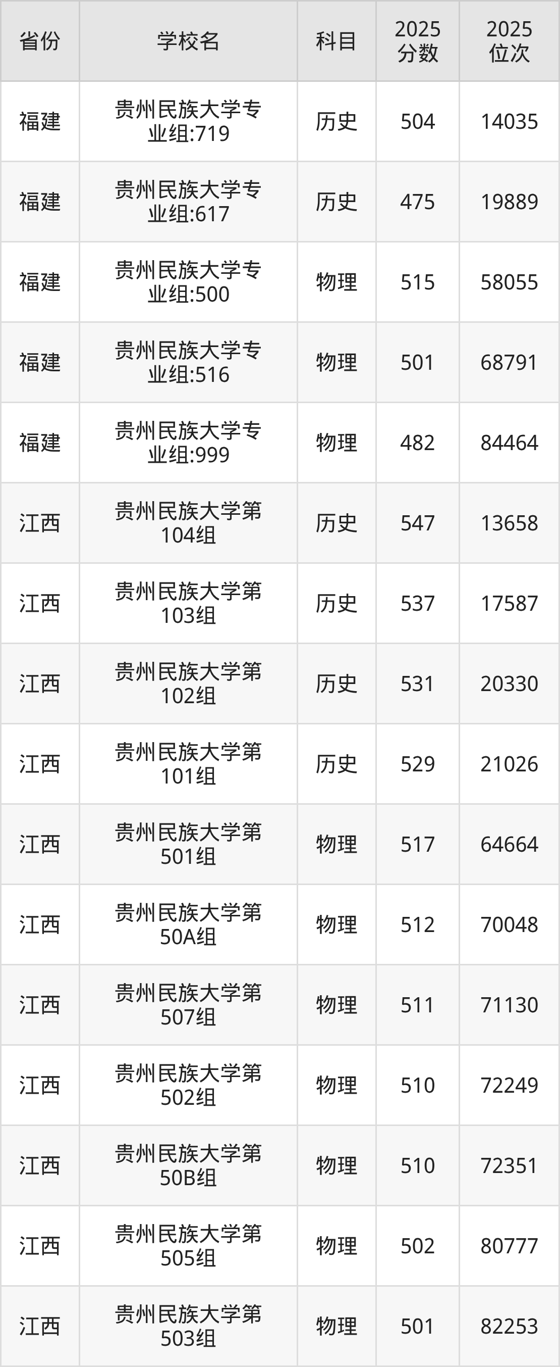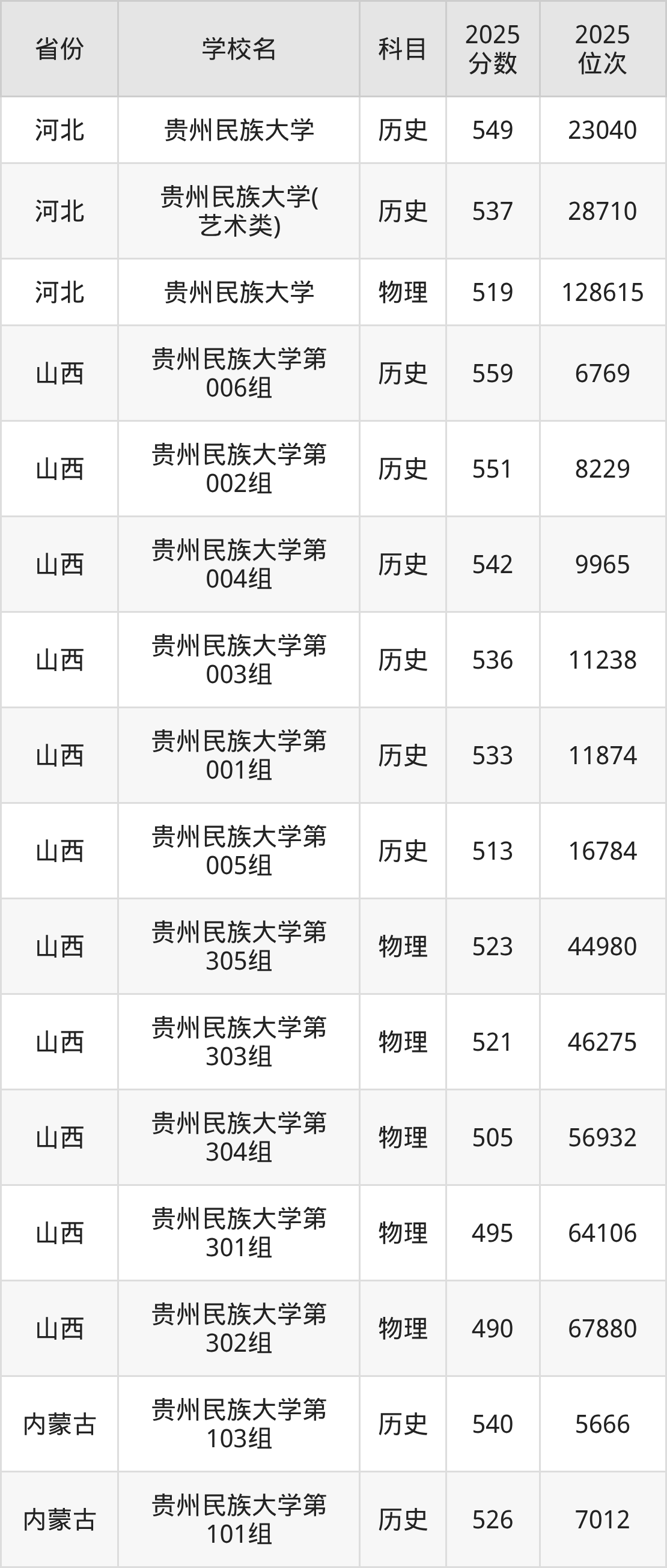 | 贵州民族大学( 地方专项计划) | 历史 | 519 | 15495 |