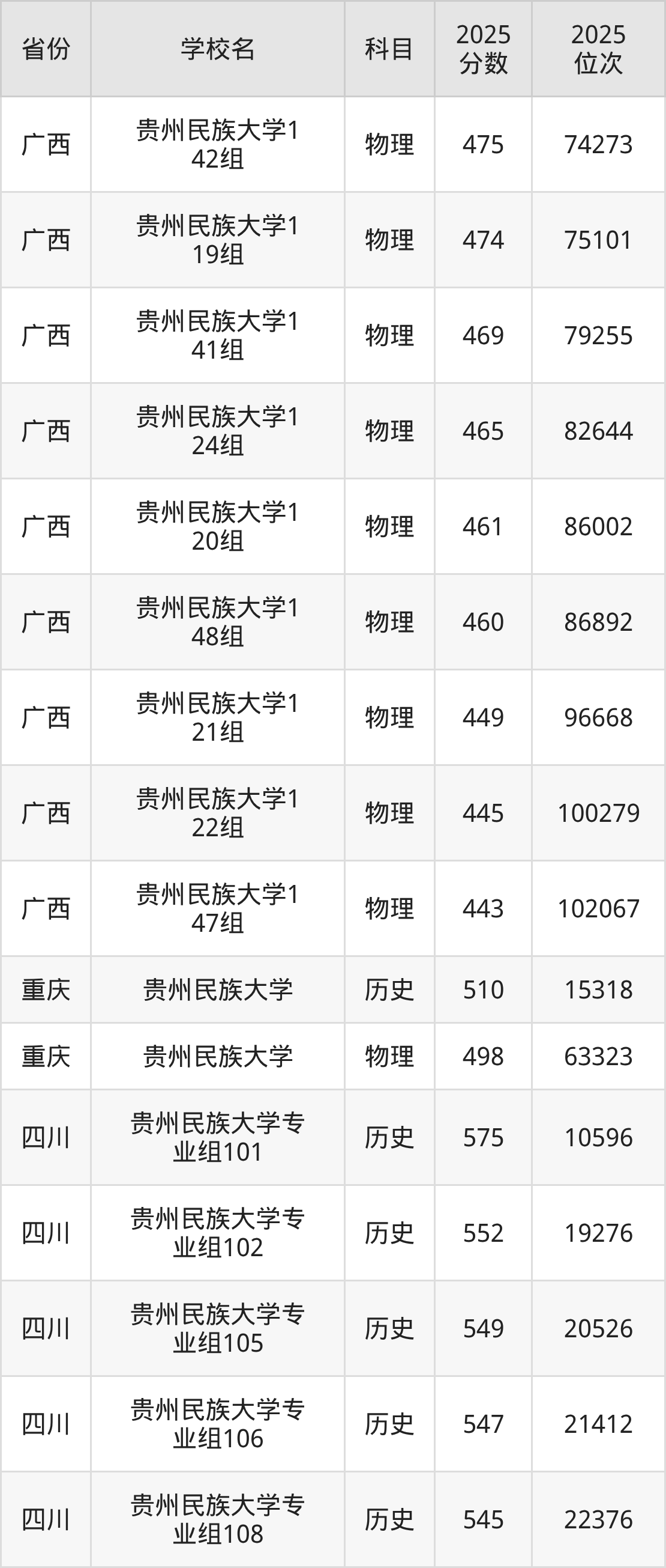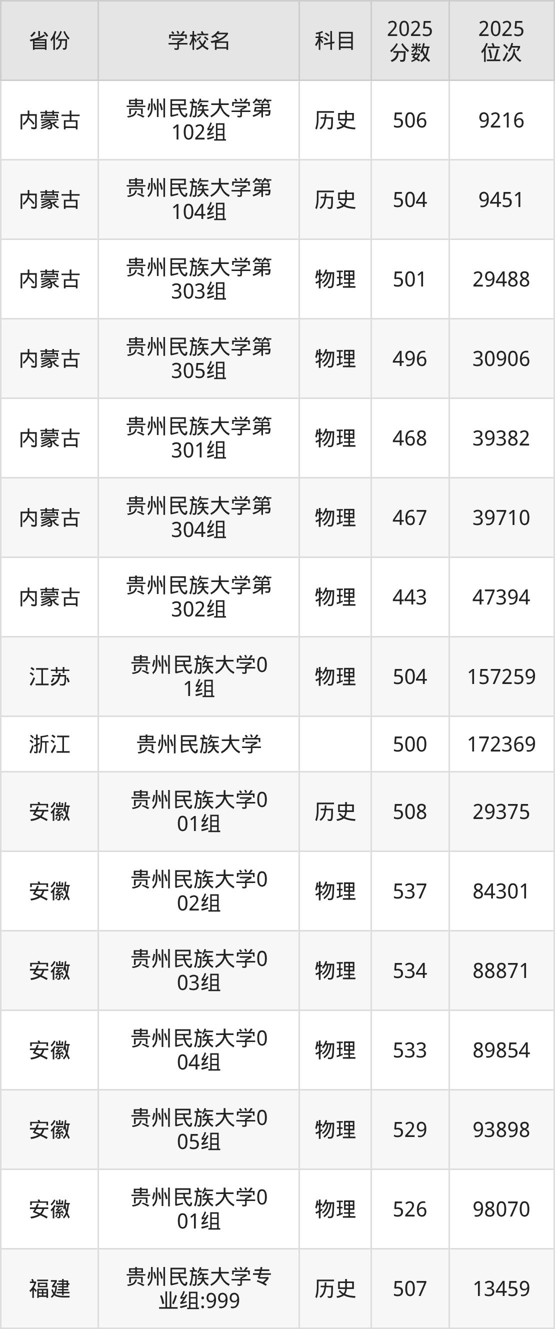 | 贵州民族大学( 民族班) | 物理 | 460 | 87149 |