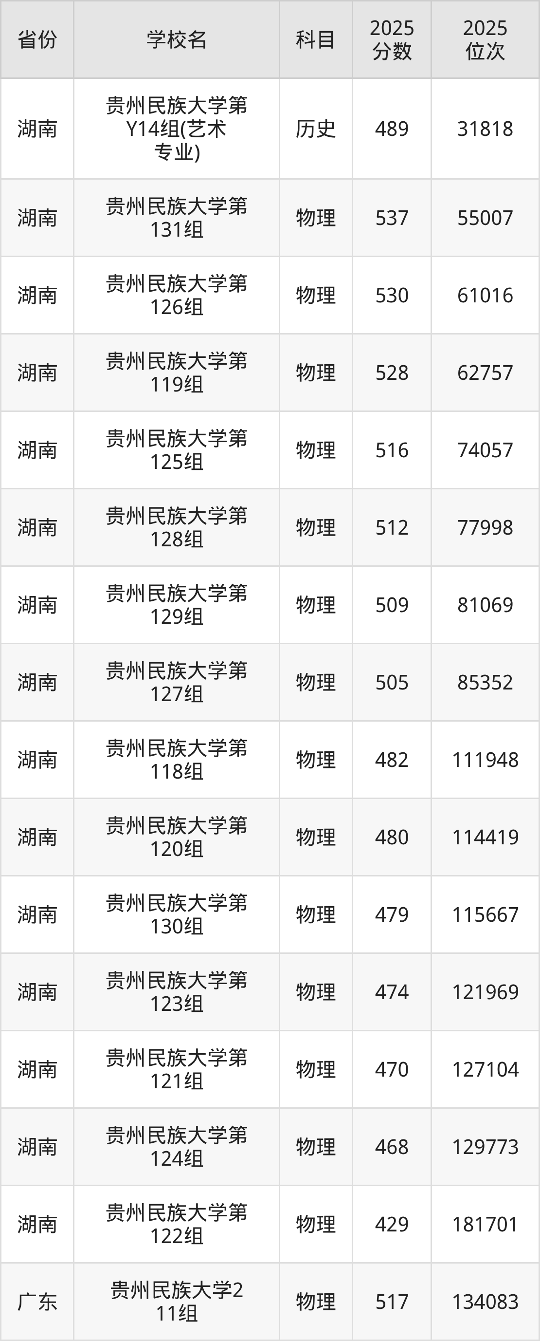 | 贵州民族大学( 国家专项计划) | 物理 | 425 | 122564 |