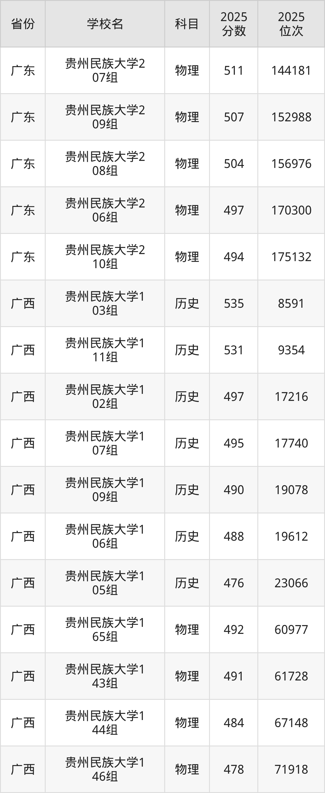 | 贵州民族大学( 预科班) | 历史 | 503 | 20614 |