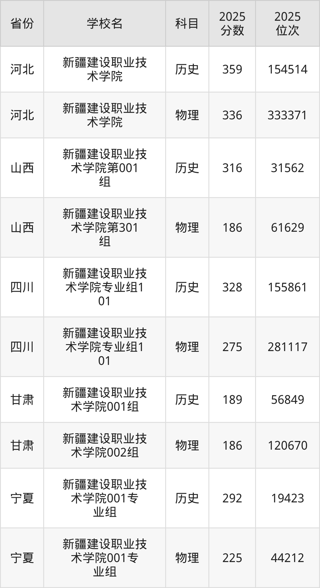2026年新疆建设职业技术学院录取分数线预计在260分及以上,在各省录取最低分存在一定差异,如:2025年新疆建设职业技术学院在四川录取最低历史类328分、物理类275分,在甘肃录取最低历史类189分、物理类186分,在宁夏录取最低历史类292分、物理类225分。
