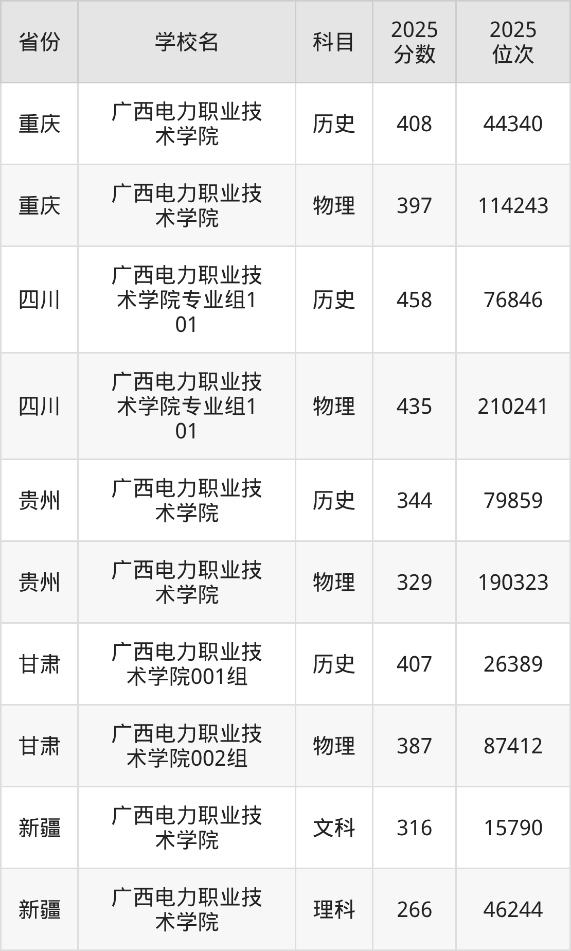 2025年广西电力职业技术学院历史类最低分356分(76690名)、物理类最低分367分(177266名)。