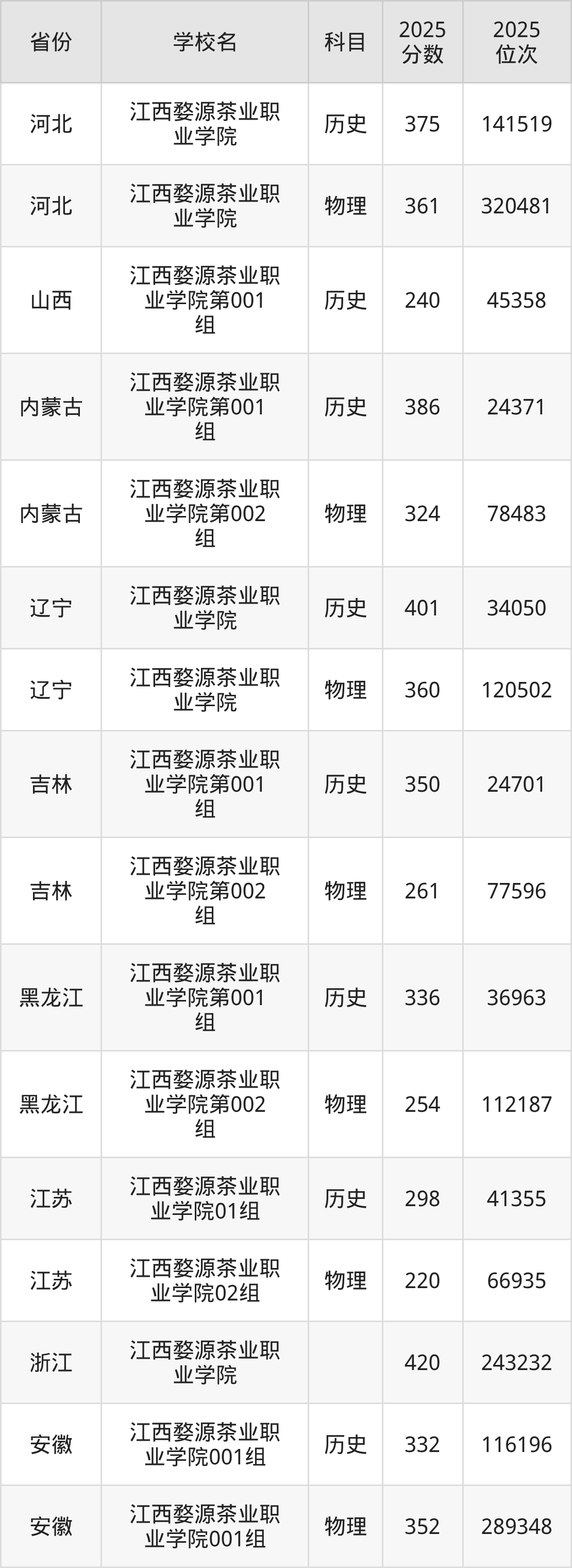 2025年江西婺源茶业职业学院在省内分历史物理科目类录取,其中历史类最低分是374分、对应位次是122749名;物理类最低分是240分,对应位次是259802名。