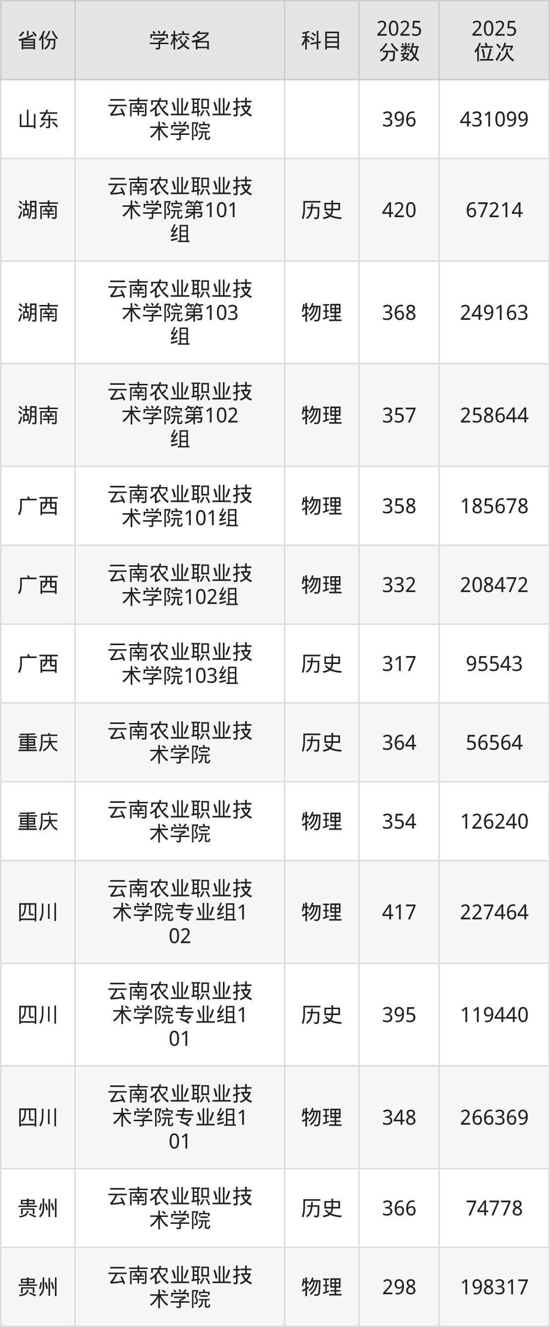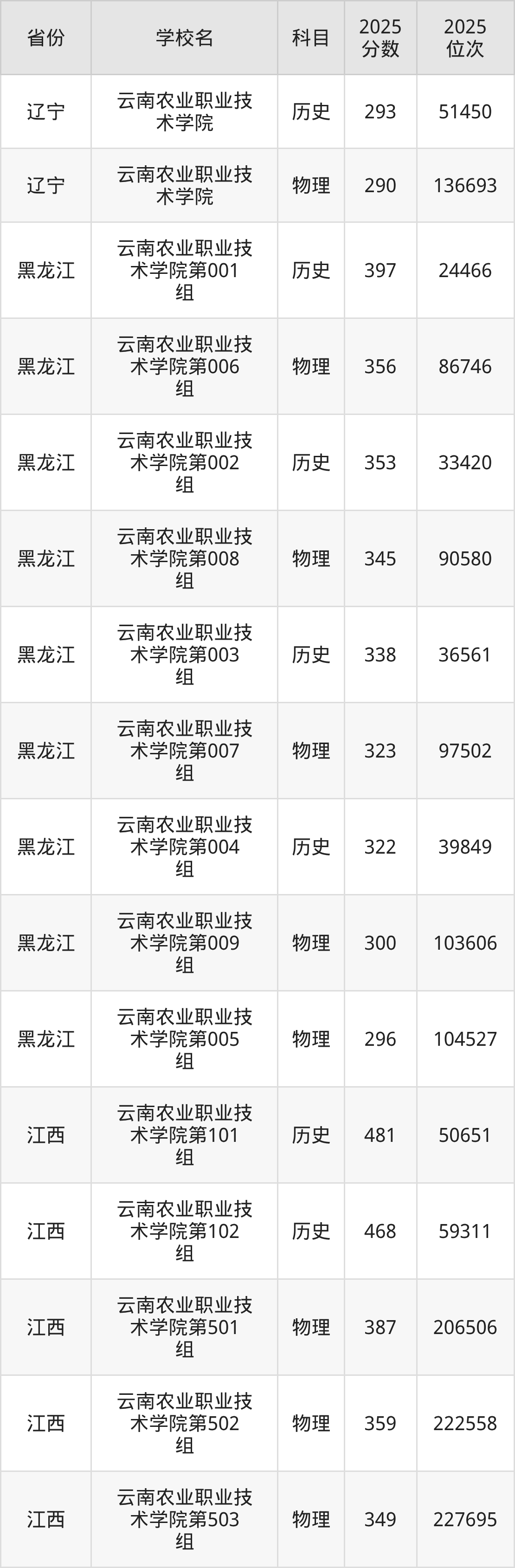 2025年云南农业职业技术学院历史类最低分366分(74778名)、物理类最低分298分(198317名)。