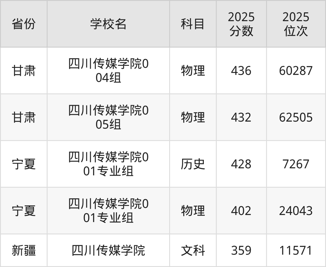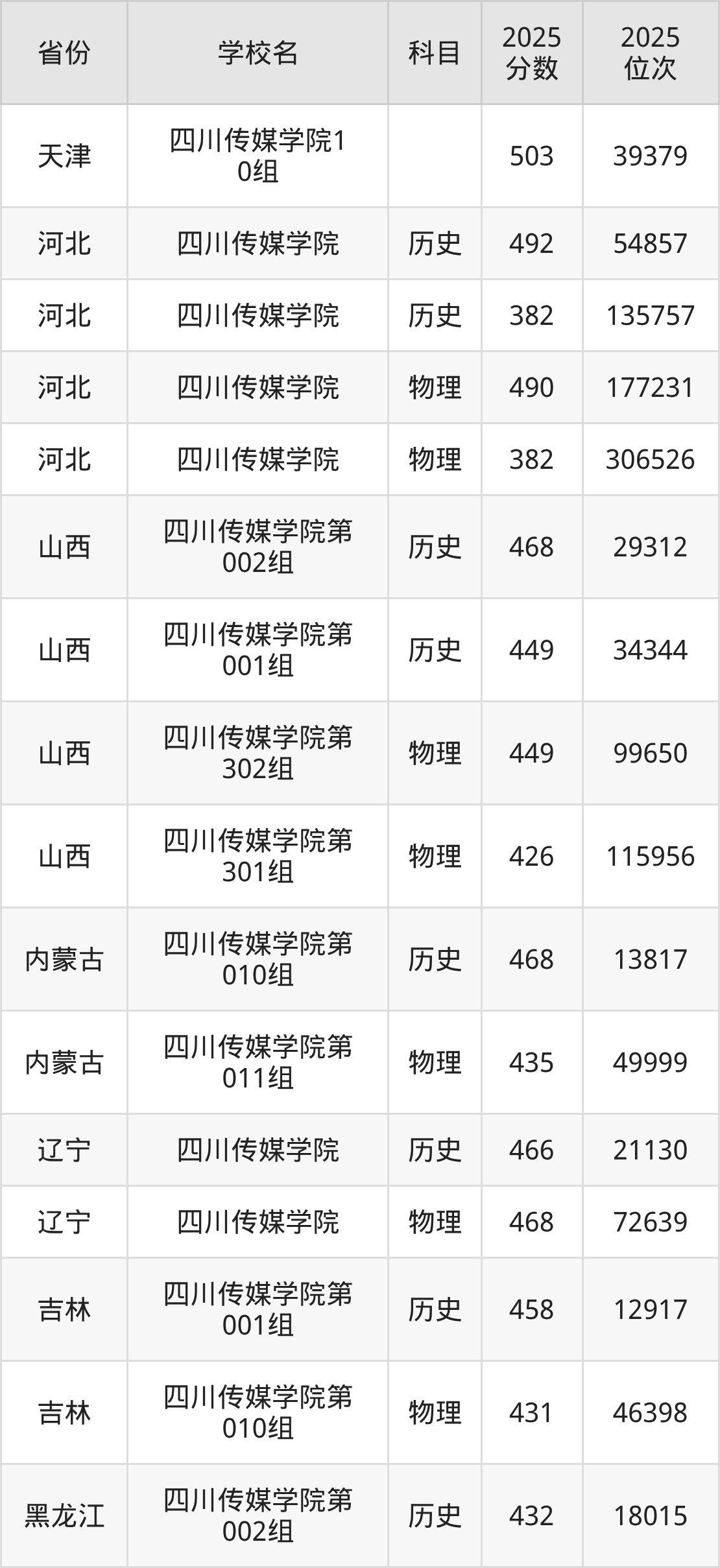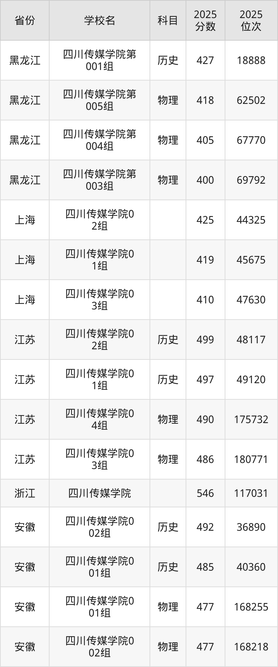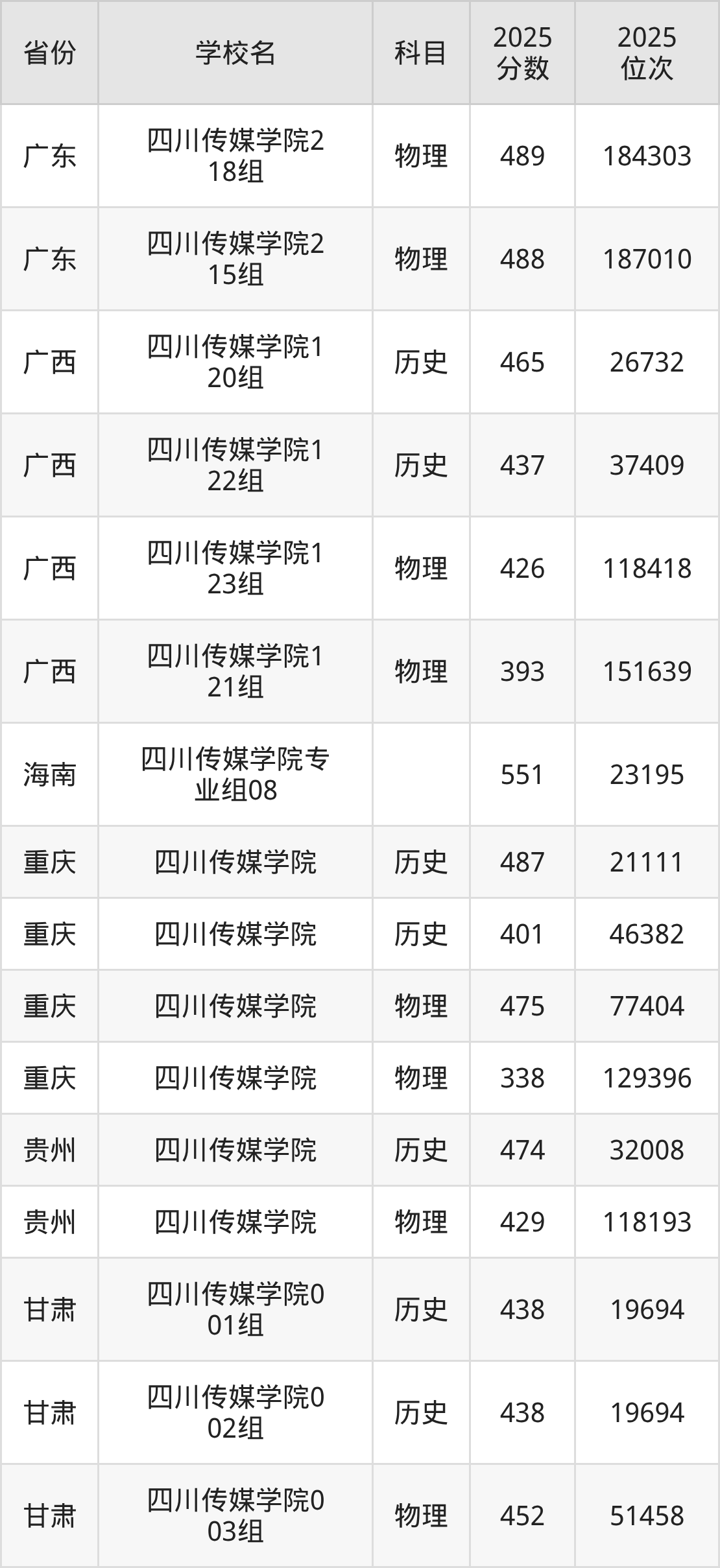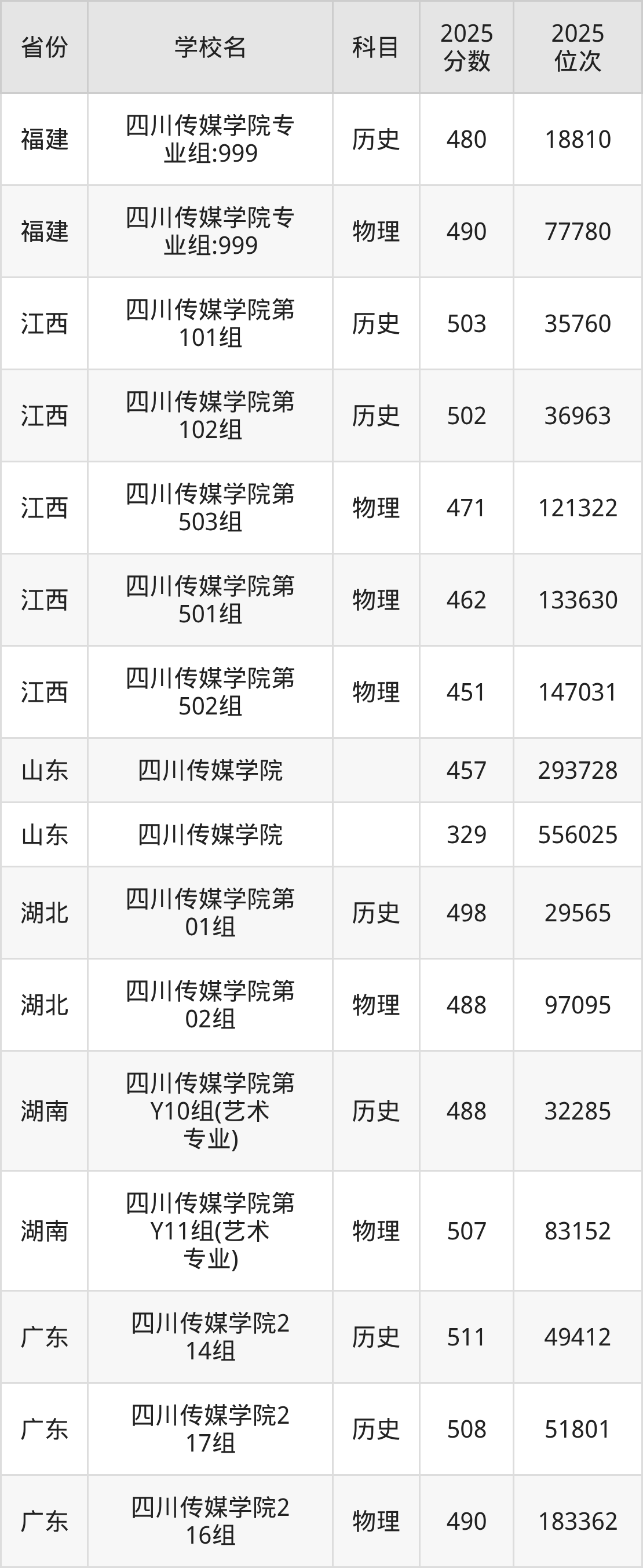 2025年四川传媒学院在省内分历史物理科目类录取,其中历史类最低分是426分、对应位次是98461名;物理类最低分是412分,对应位次是231707名。