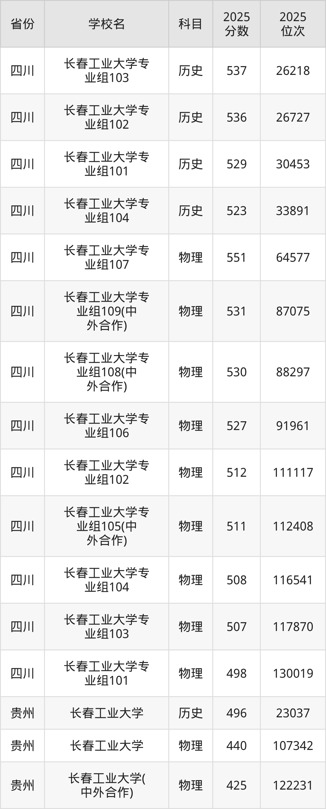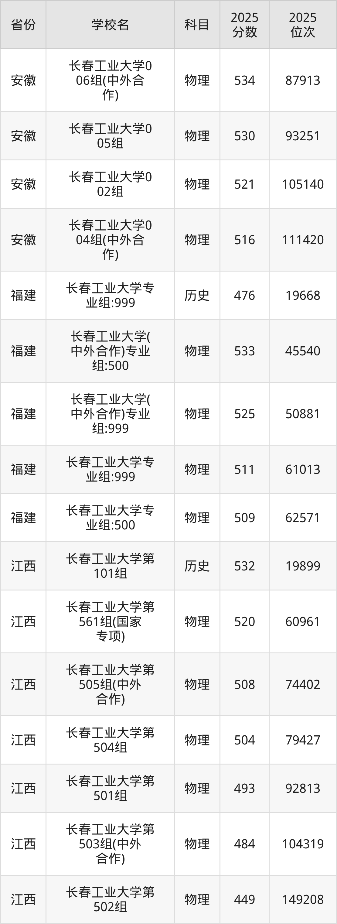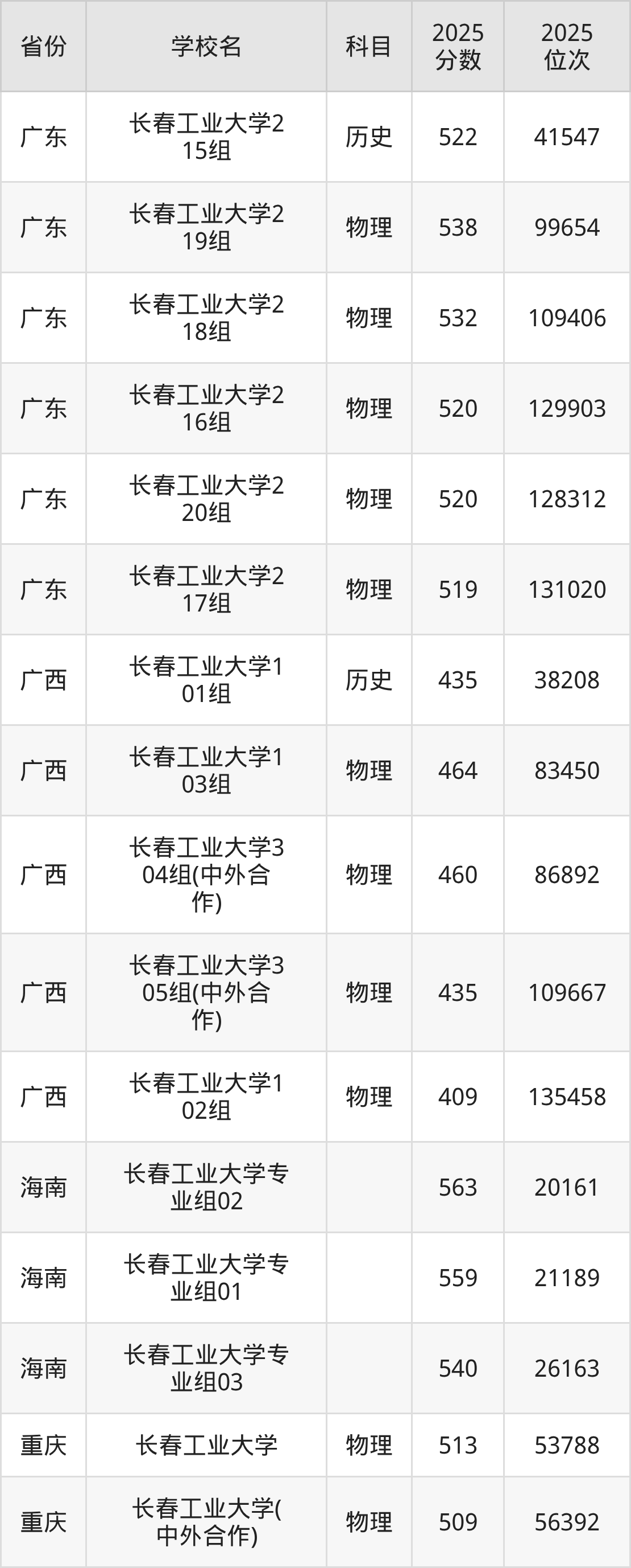 2025年长春工业大学历史类最低分466分(12015名)、物理类最低分434分(45451名)。