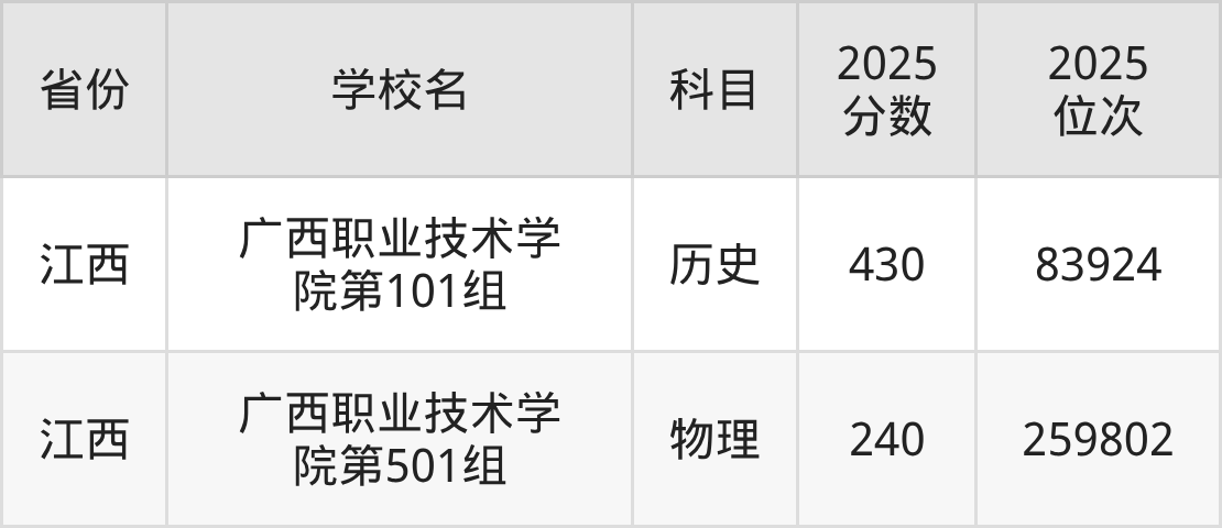 2025年广西职业技术学院历史类最低分384分(61888名)、物理类最低分360分(183888名)。