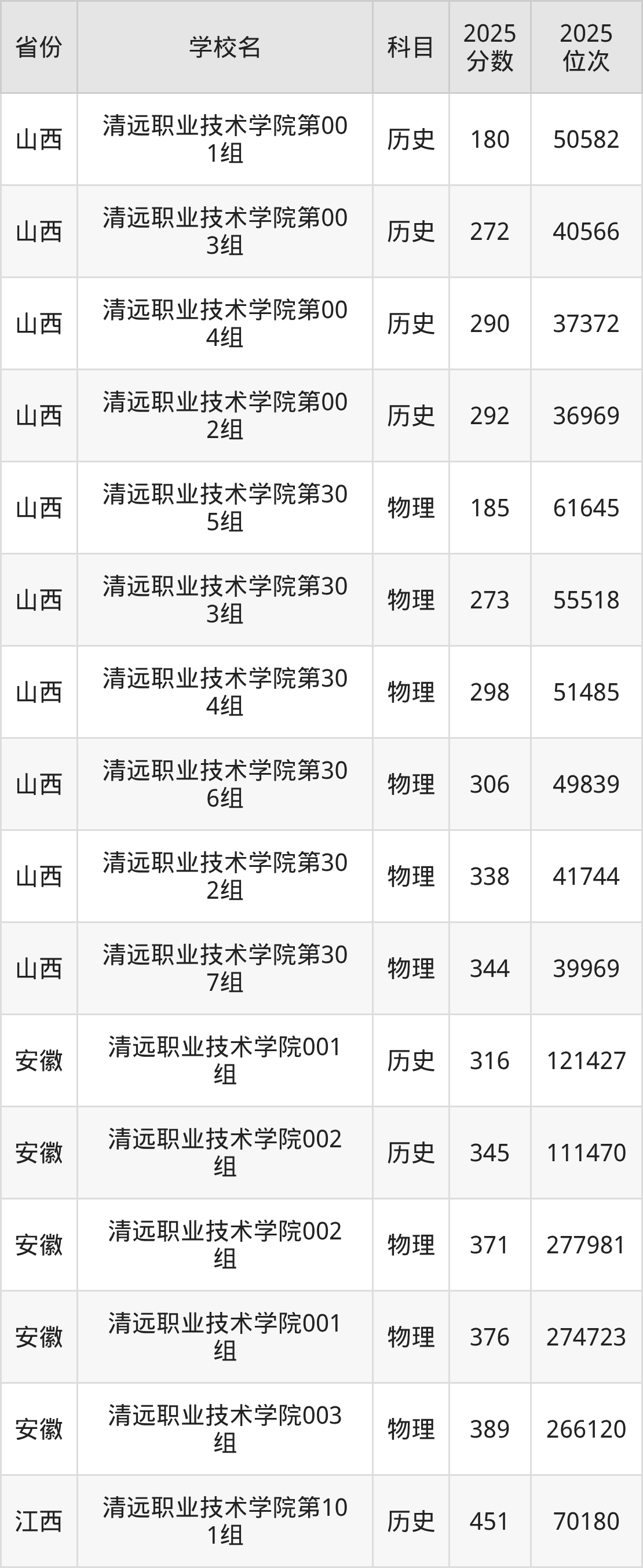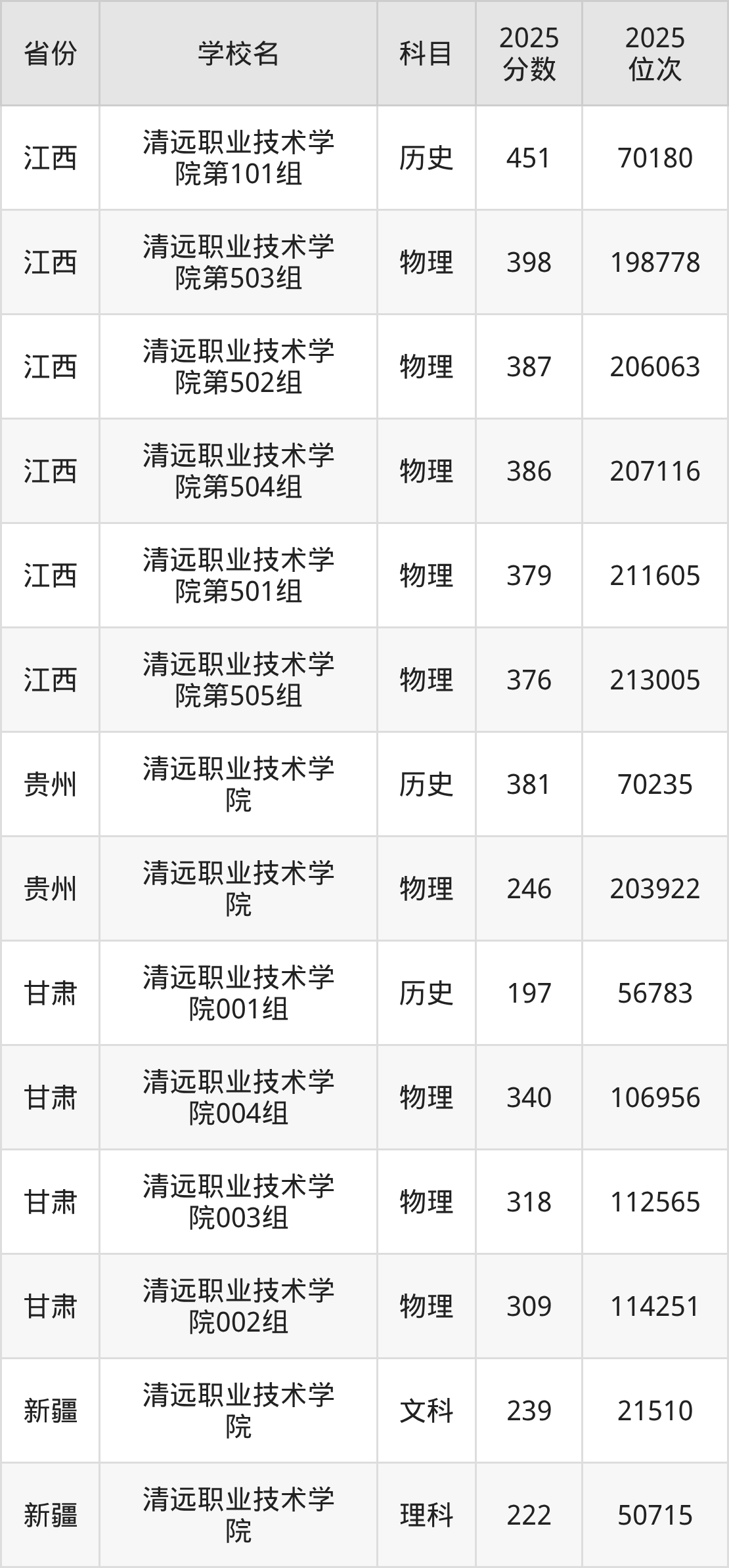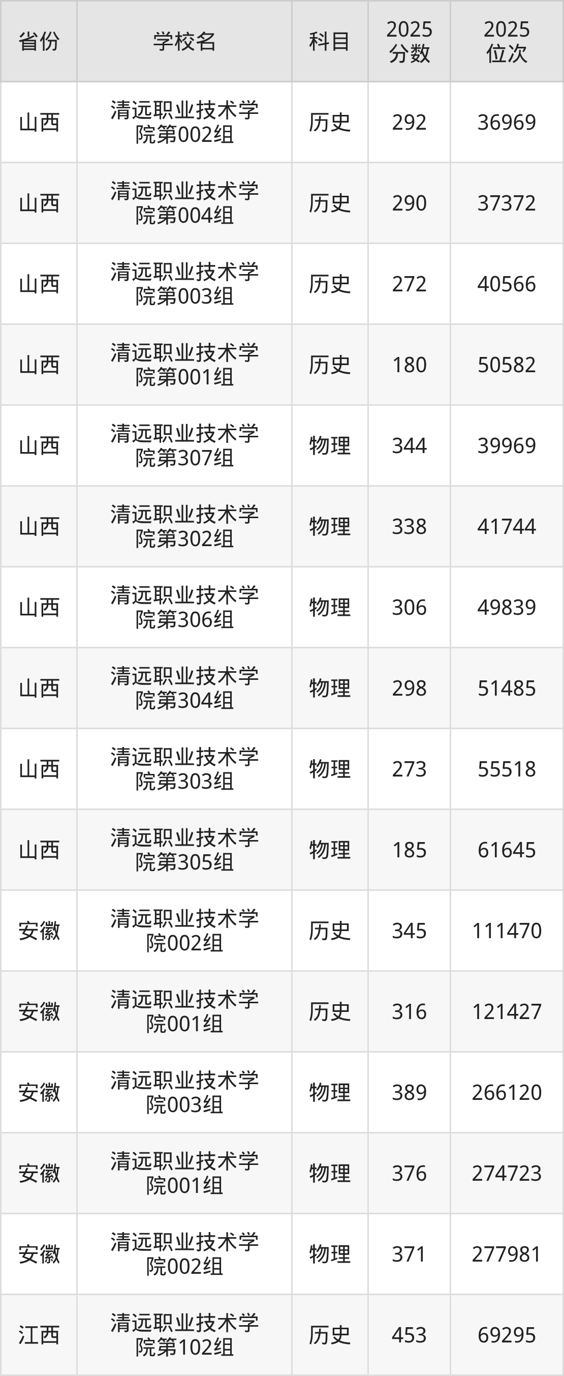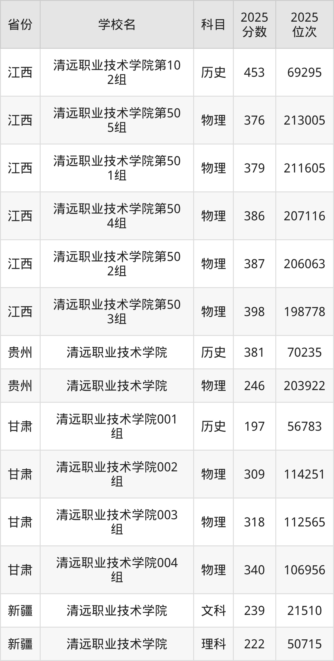 2025年清远职业技术学院在省外录取分数线范围整体位于180分到453分之间,录取分数线最低在山西历史(第001组)、录取分数线最高在江西历史(第102组)。
