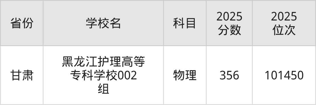 | 黑龙江护理高等 专科学校第01 4组(振兴龙江 计划) | 物理 | 450 | 50020 |