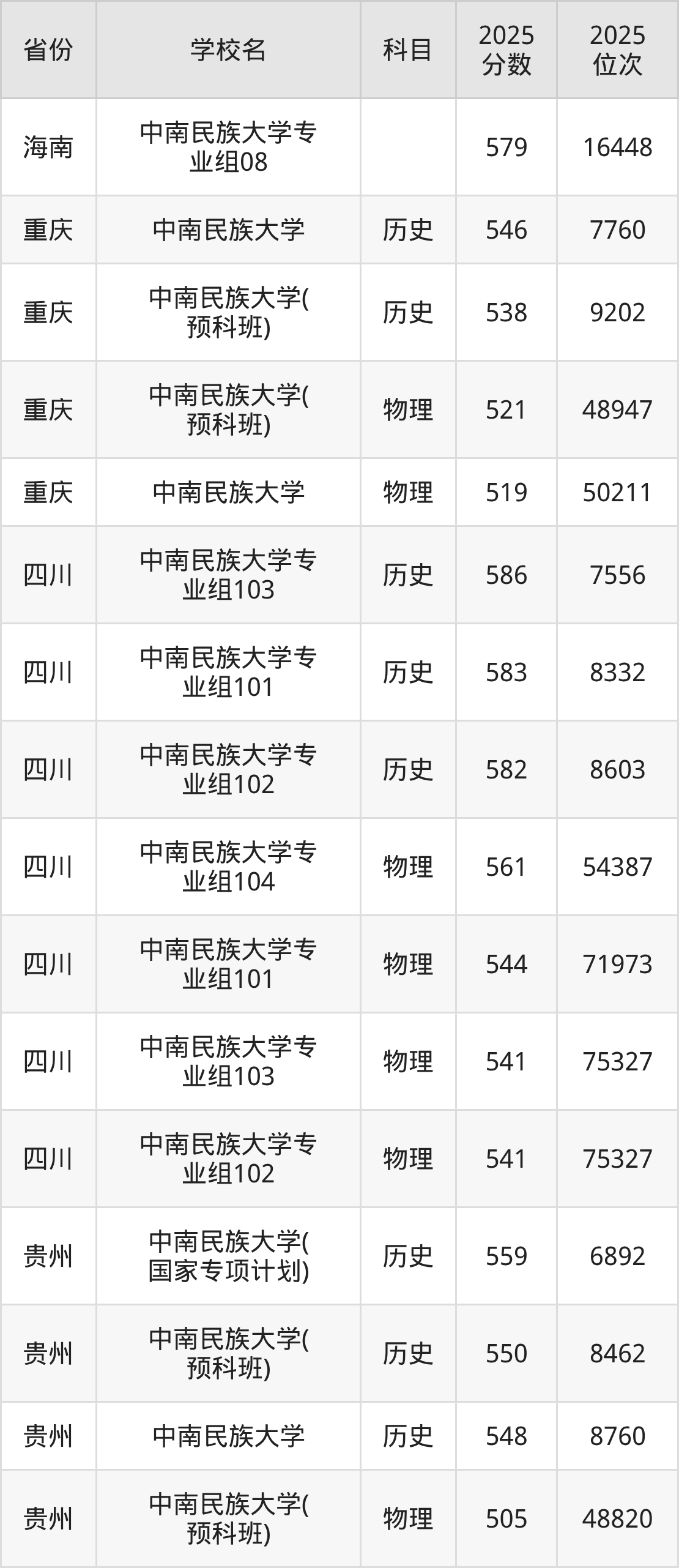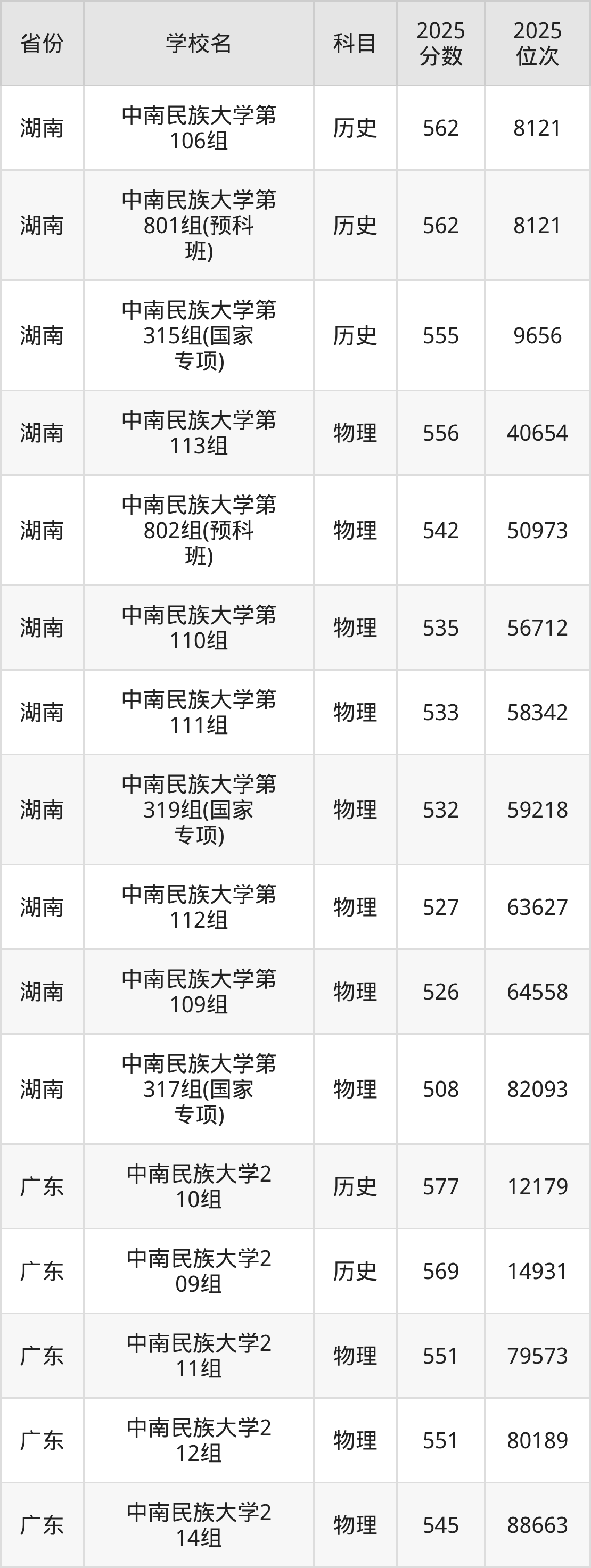 2025年中南民族大学历史类最低分578分(6912名)、物理类最低分550分(44422名)。