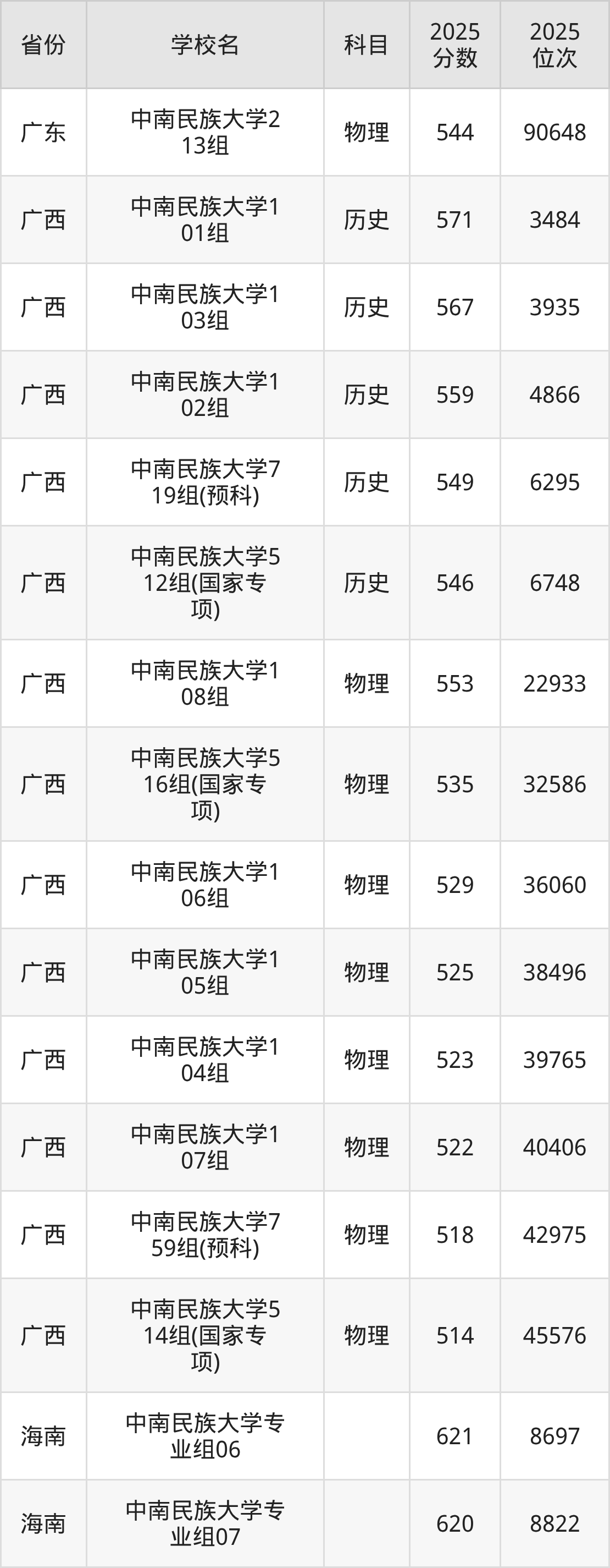 2025年中南民族大学在省内分历史物理科目类录取,其中历史类最低分是578分、对应位次是6912名;物理类最低分是550分,对应位次是44422名。