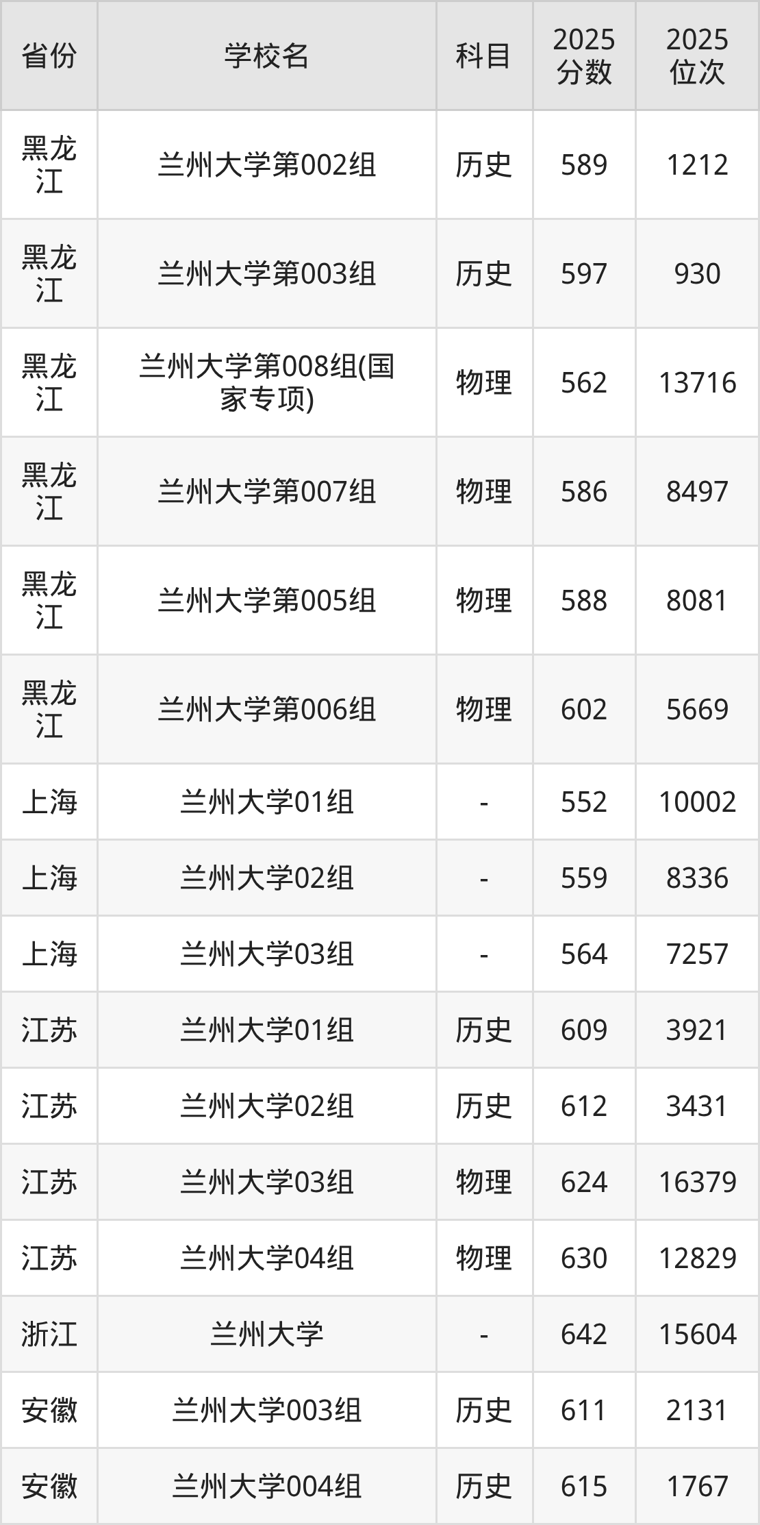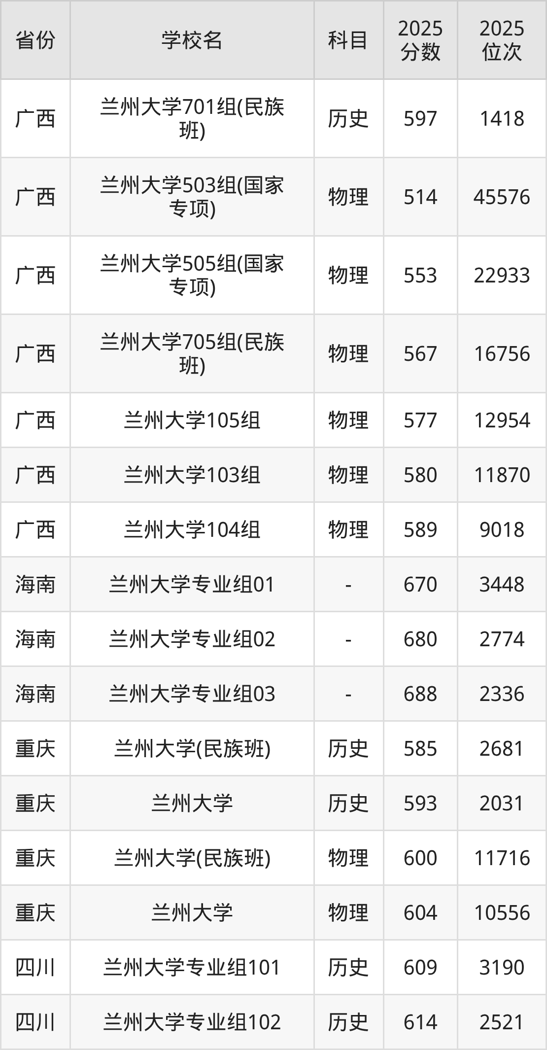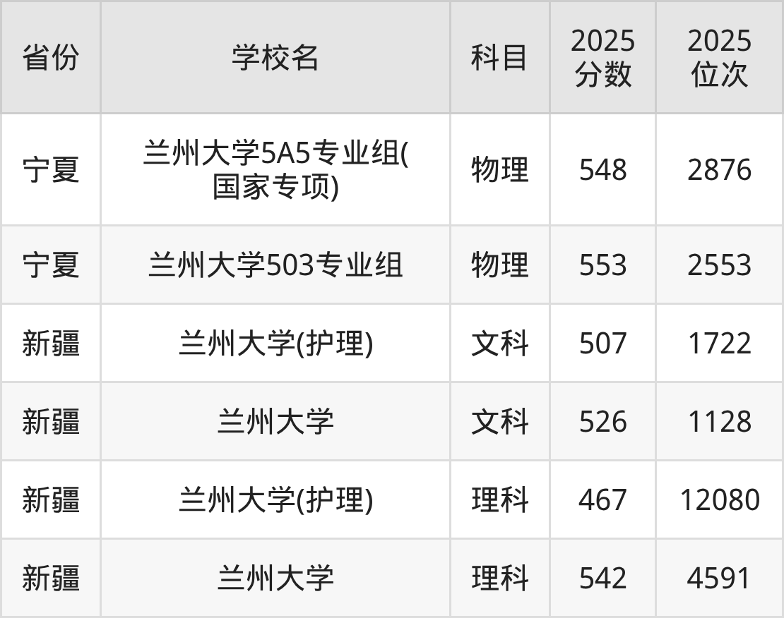2025年兰州大学在省外录取分数线范围整体位于467分到688分之间,录取分数线最低在新疆理科、录取分数线最高在海南(专业组03)。