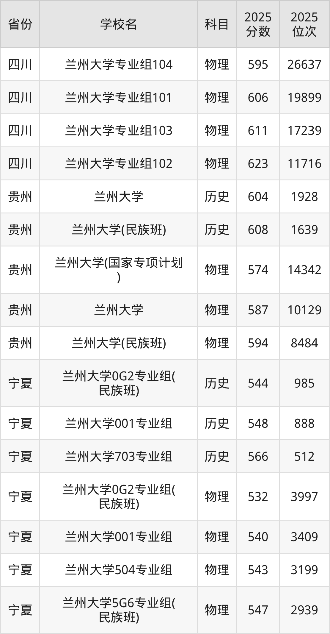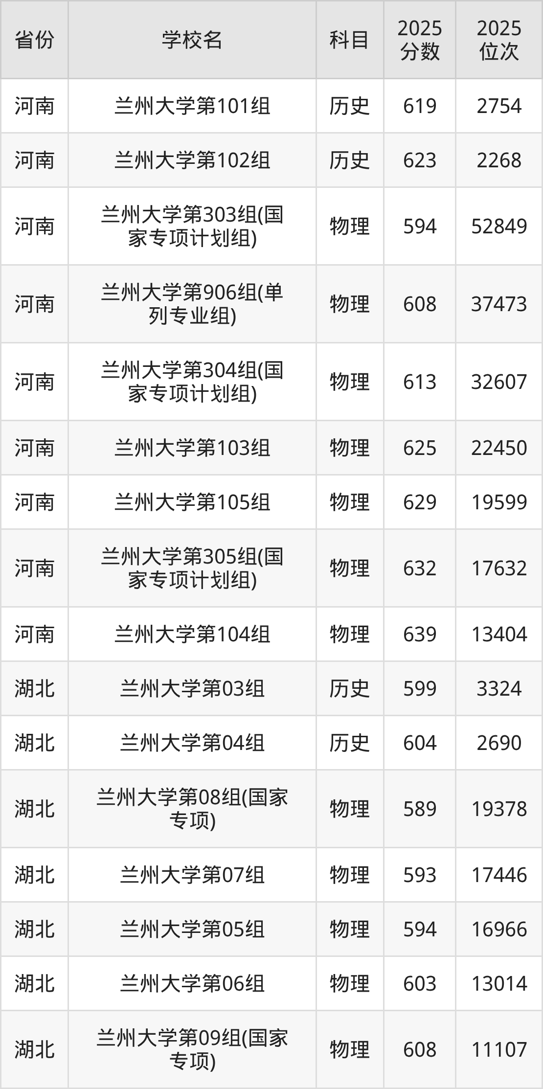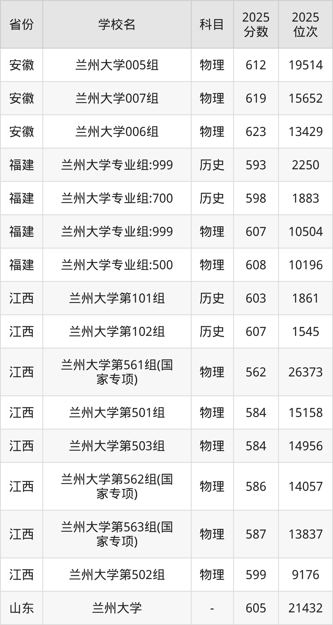 | 兰州大学036 组(国家专项) | 物理 | 582 | 5756 |