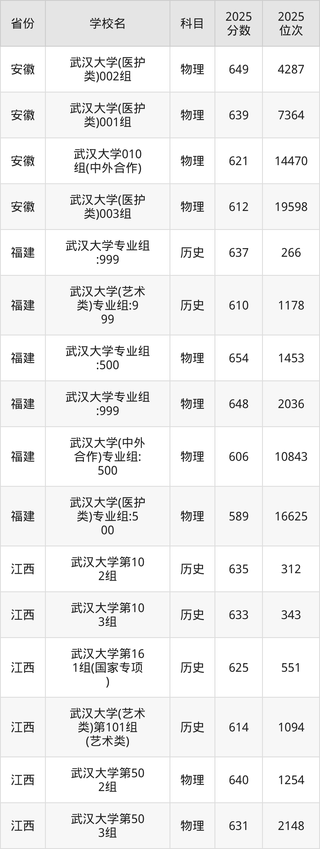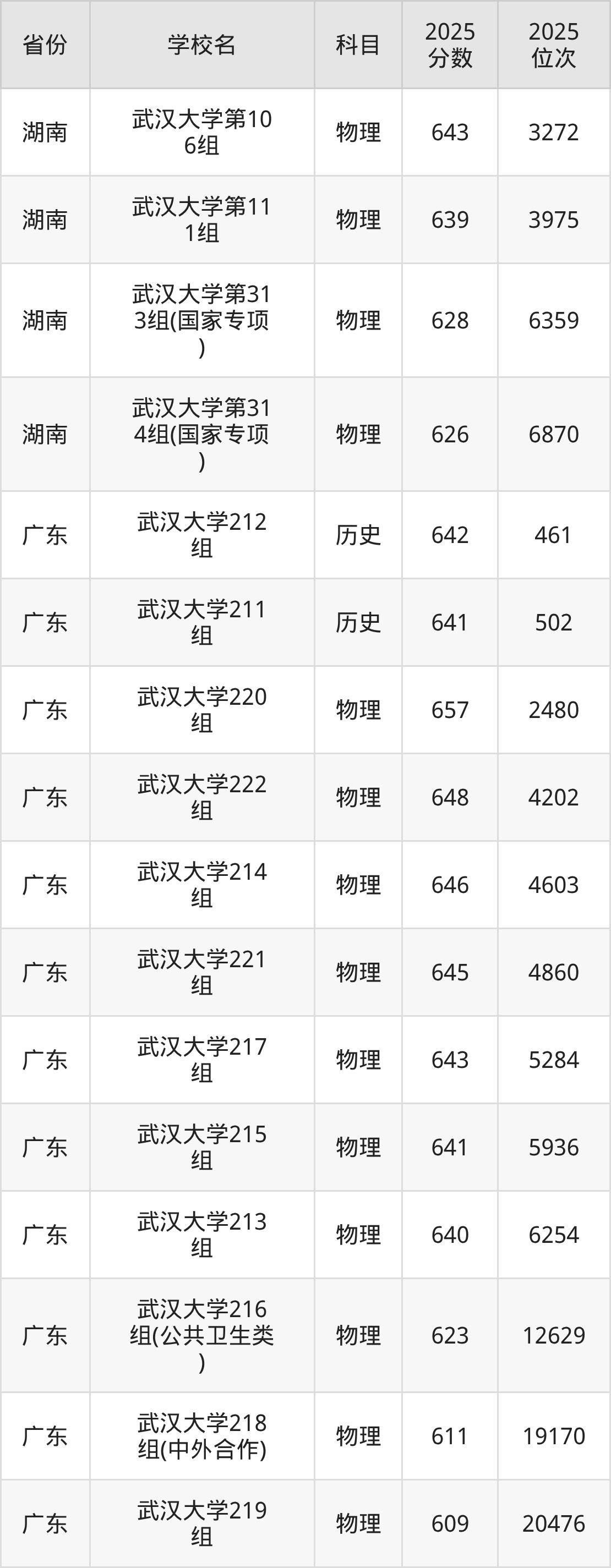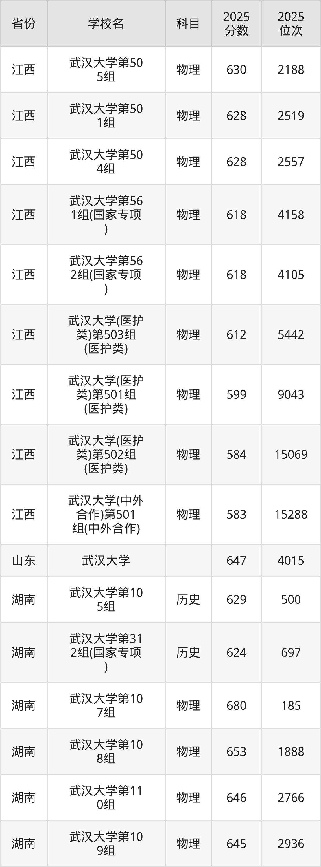 2025年武汉大学在省内分历史物理科目类录取,其中历史类最低分是628分、对应位次是797名;物理类最低分是619分,对应位次是7700名。