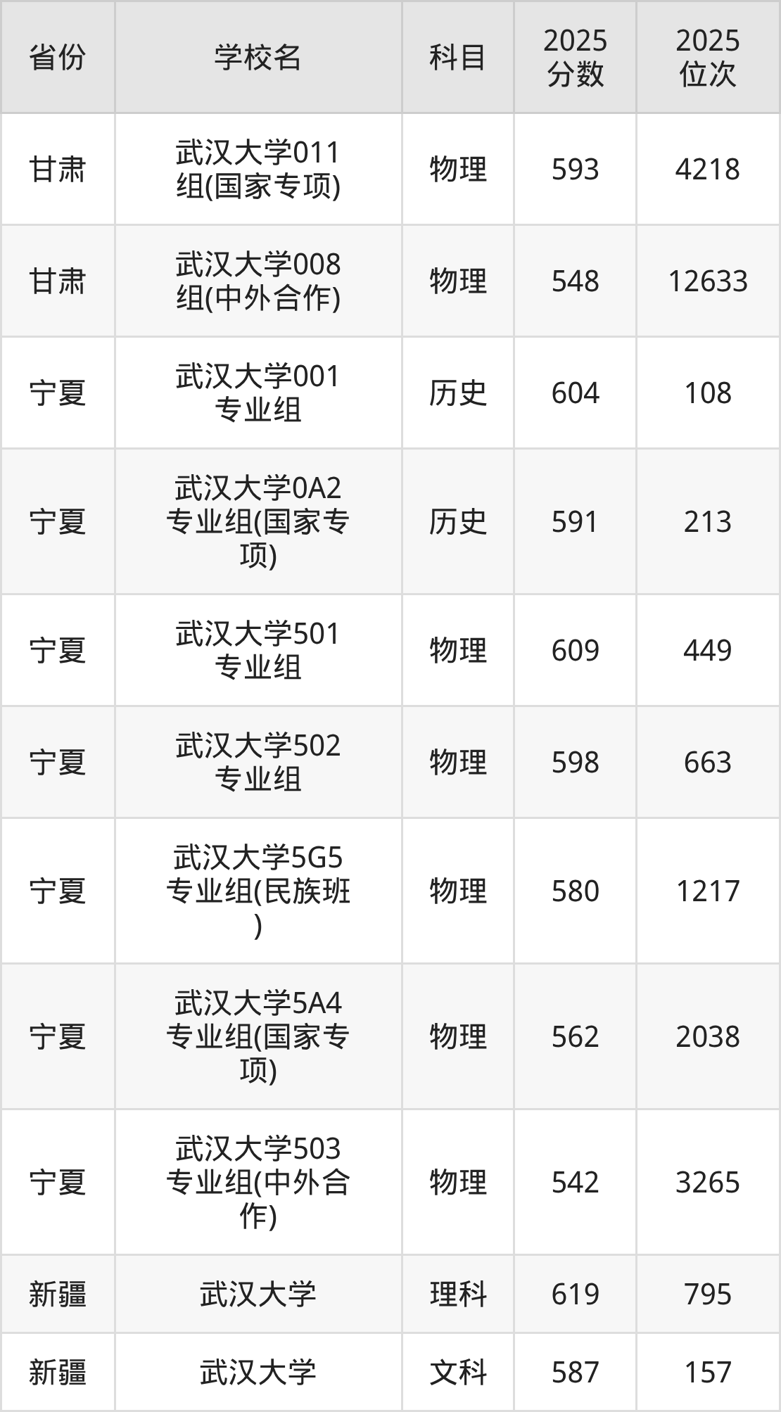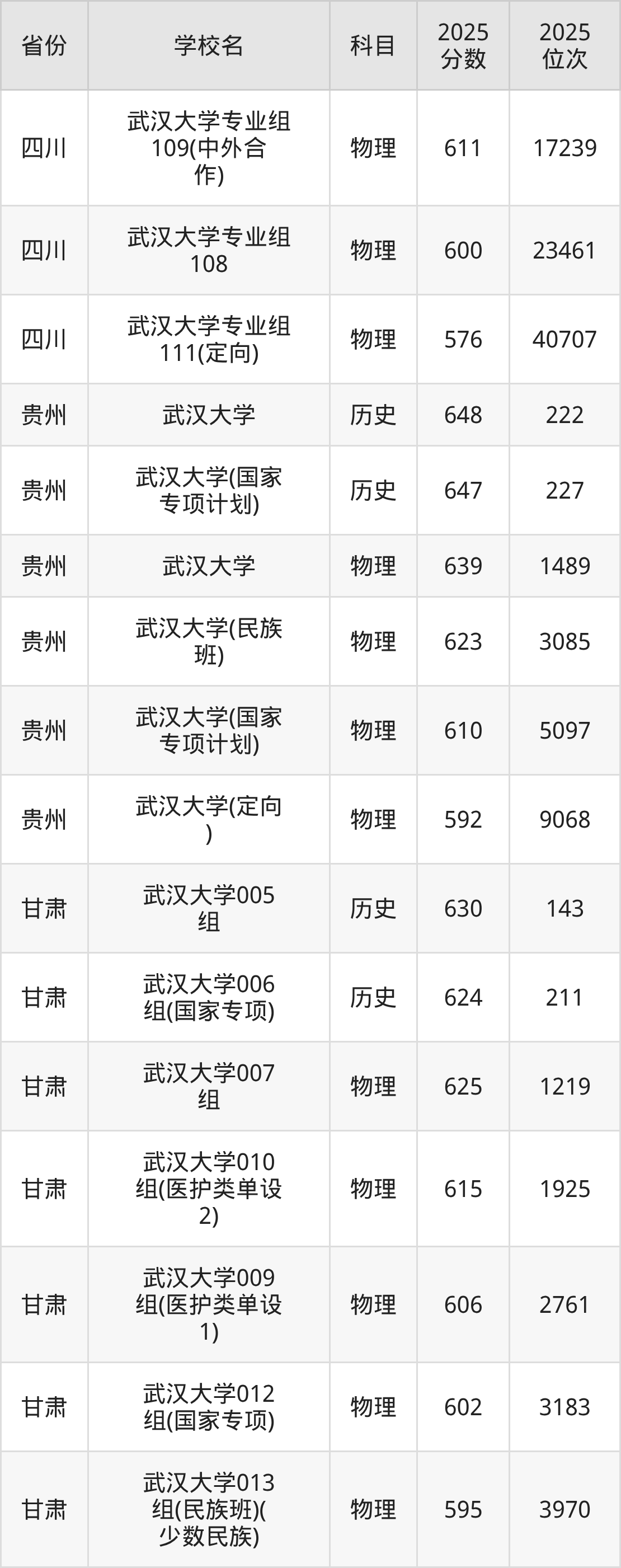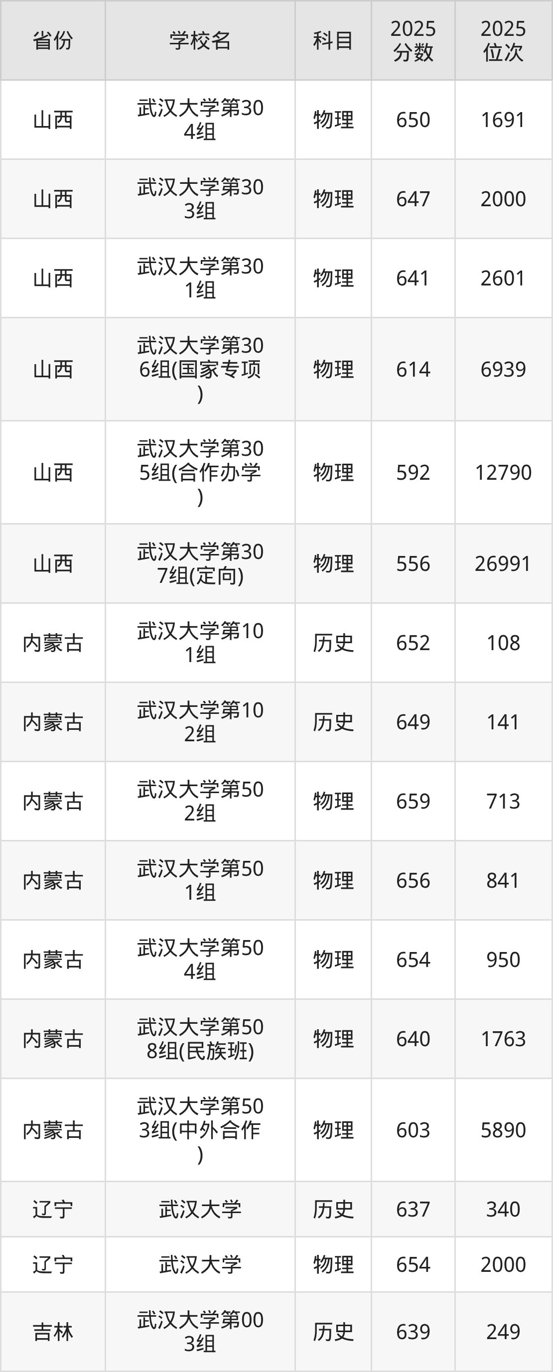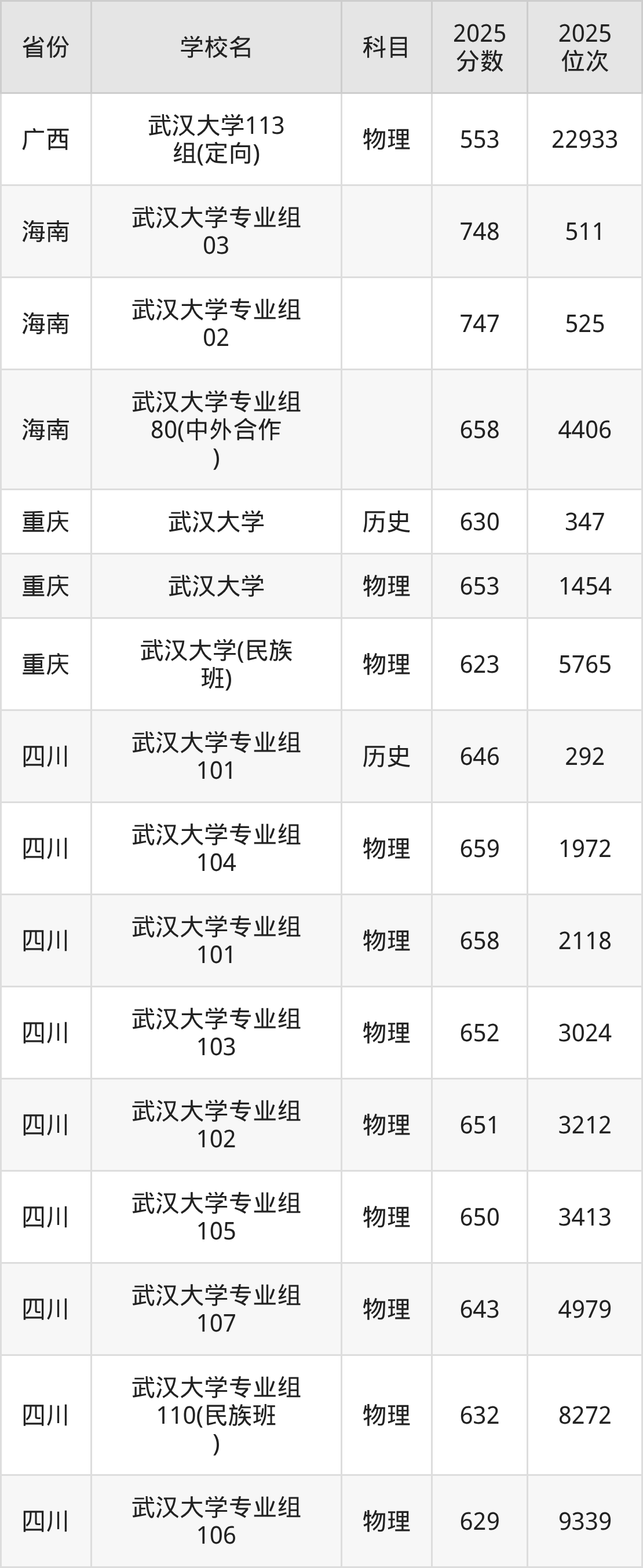 2025年武汉大学在省内分历史物理科目类录取,其中历史类最低分是628分、对应位次是797名;物理类最低分是619分,对应位次是7700名。