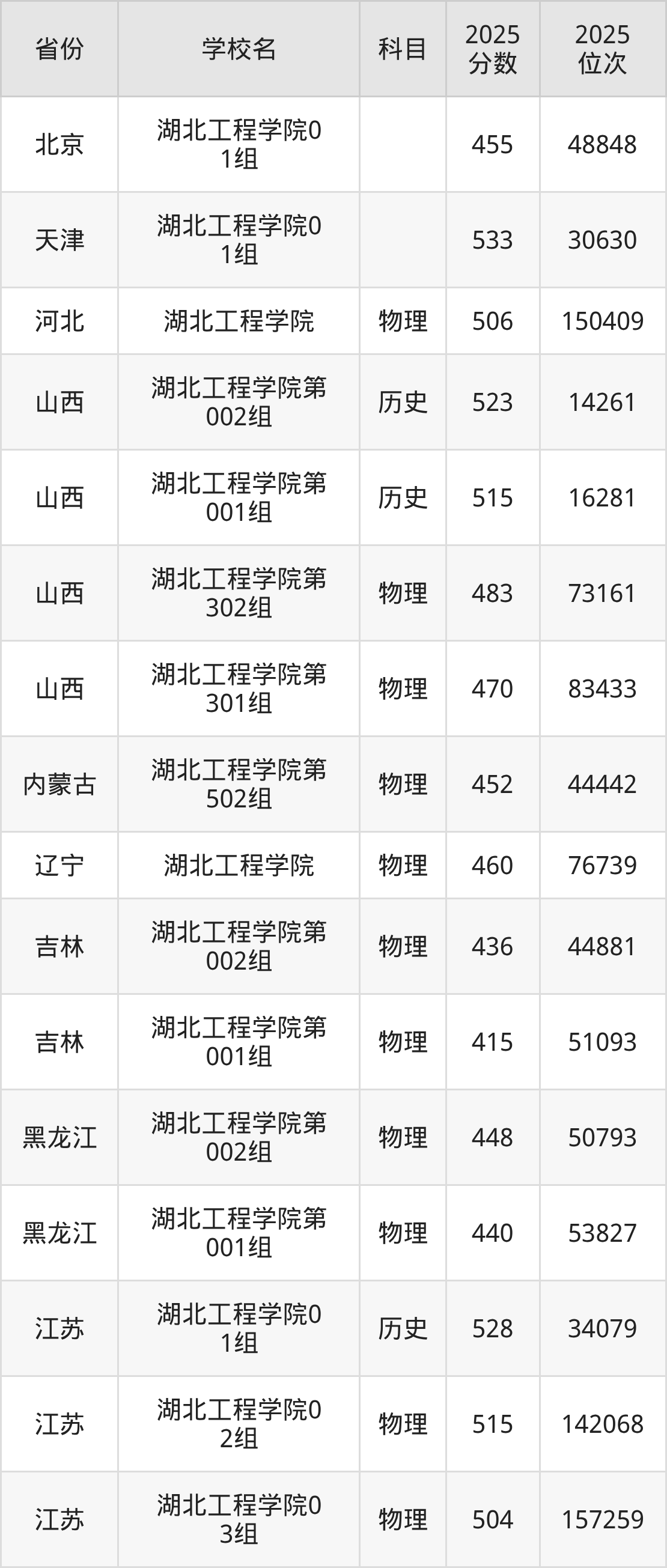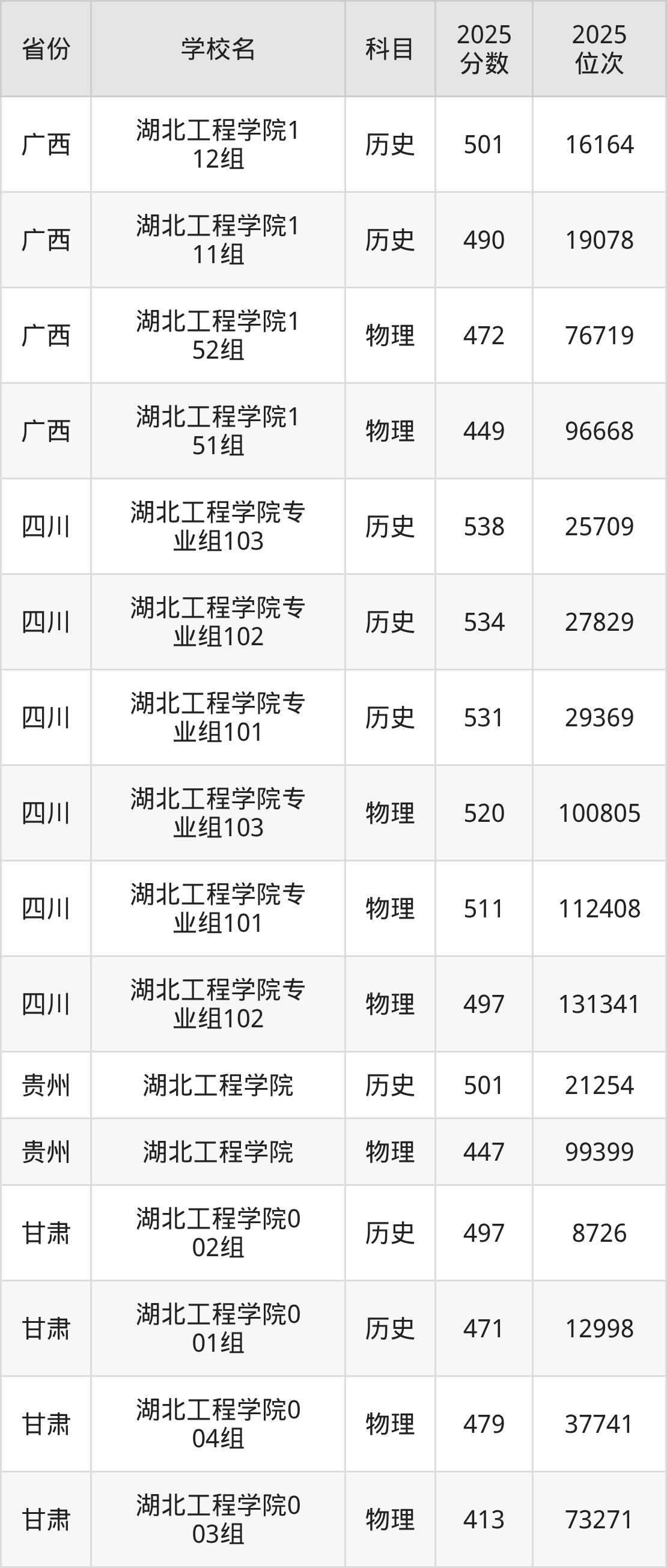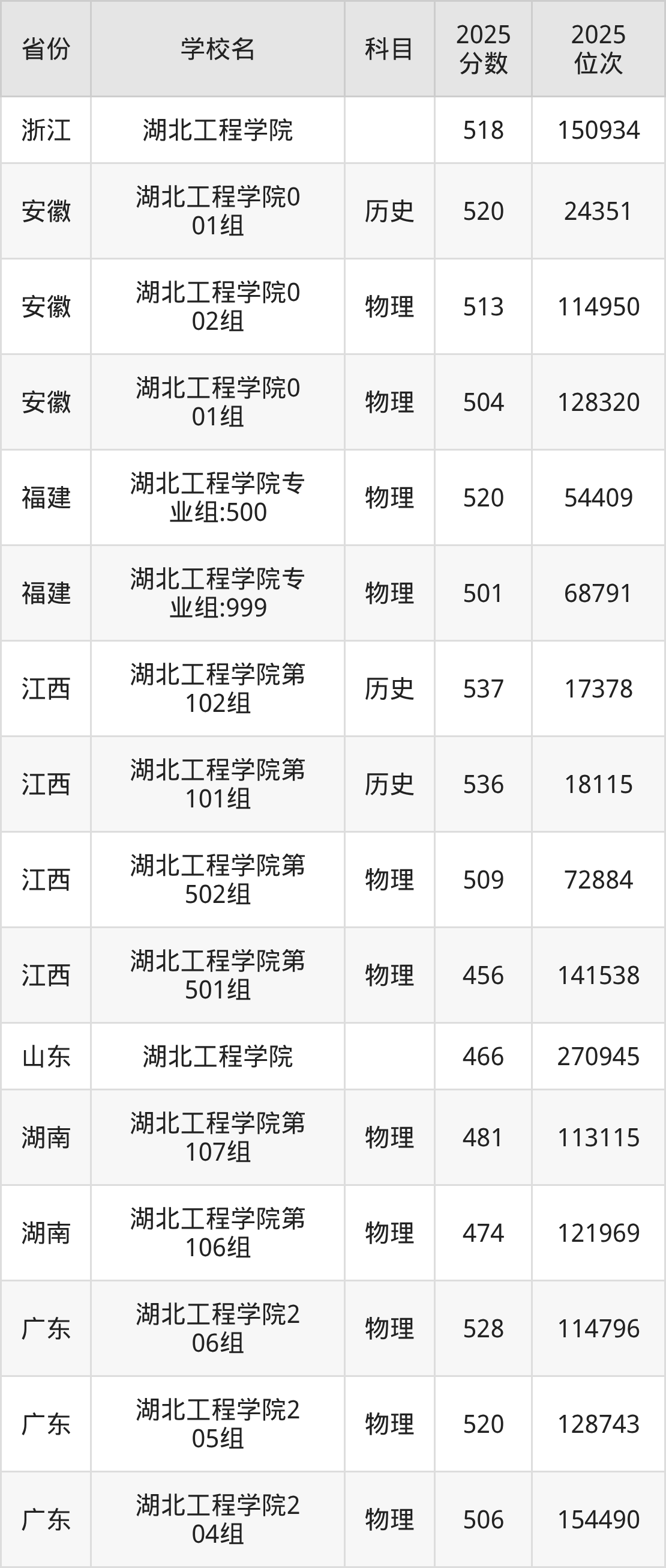 2025年湖北工程学院历史类最低分515分(23923名)、物理类最低分473分(110381名)。