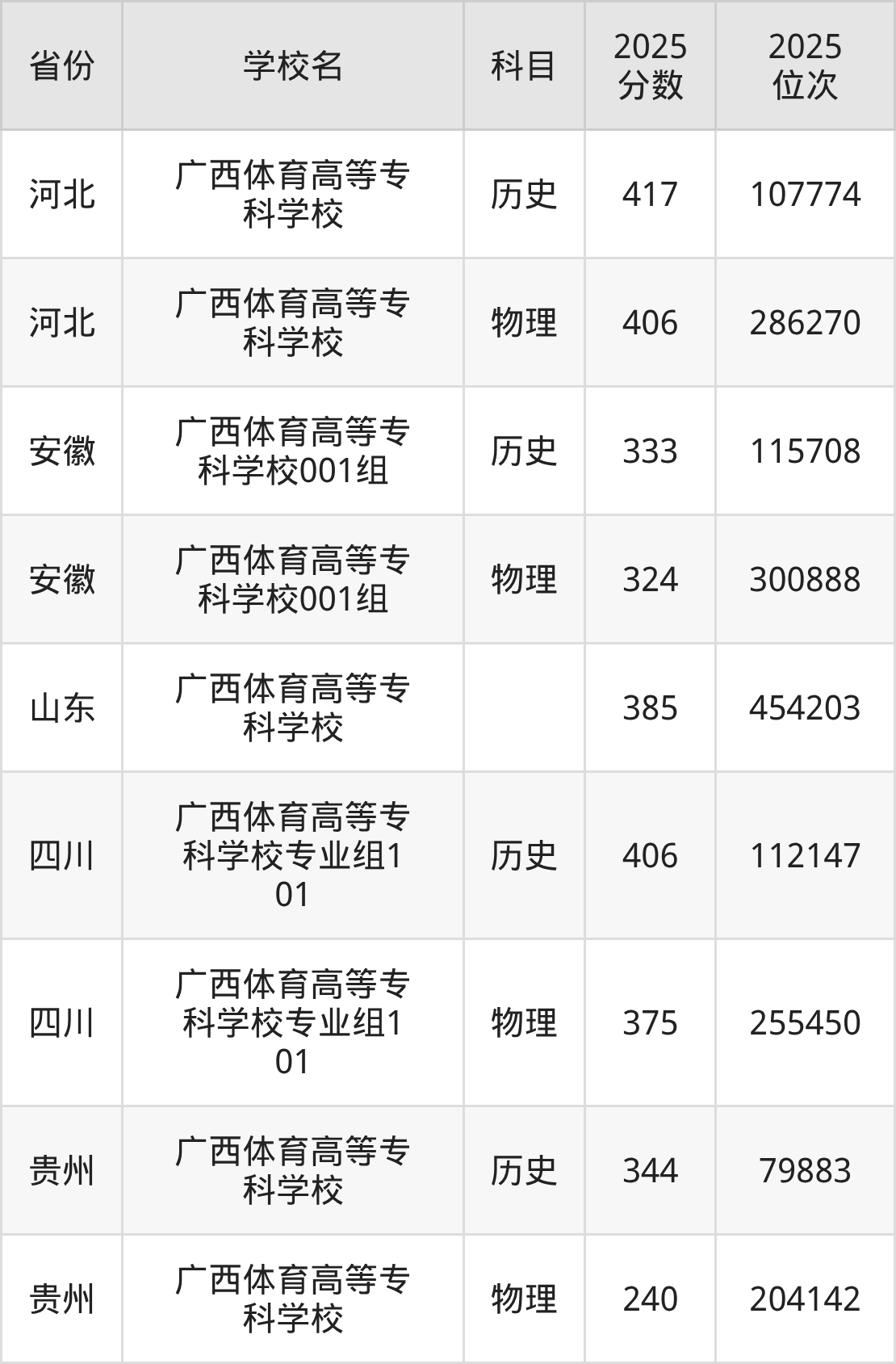 2025年广西体育高等专科学校在壮族自治区外录取分数线范围整体位于240分到417分之间,录取分数线最低在贵州物理、录取分数线最高在河北历史。