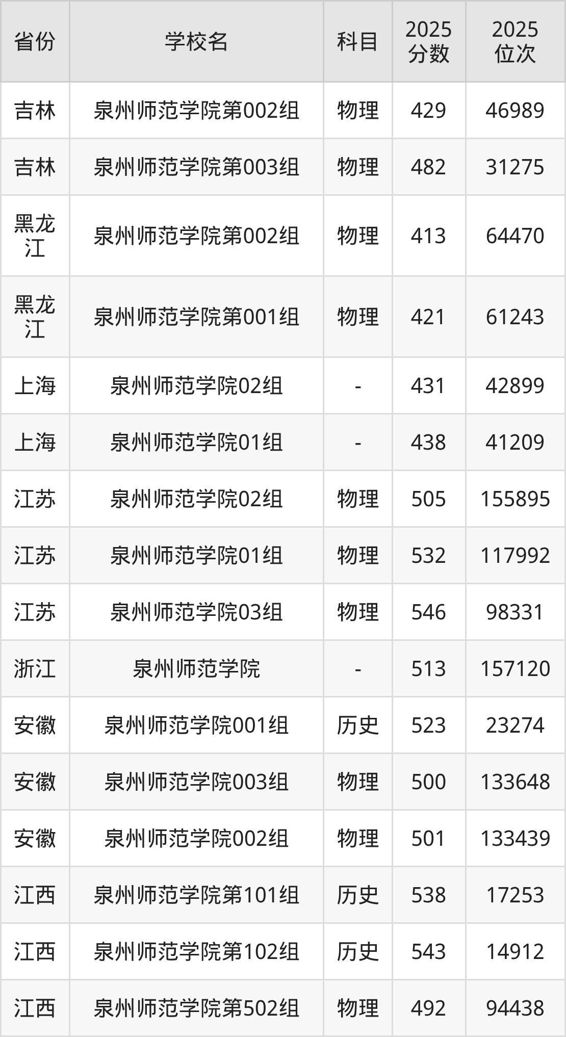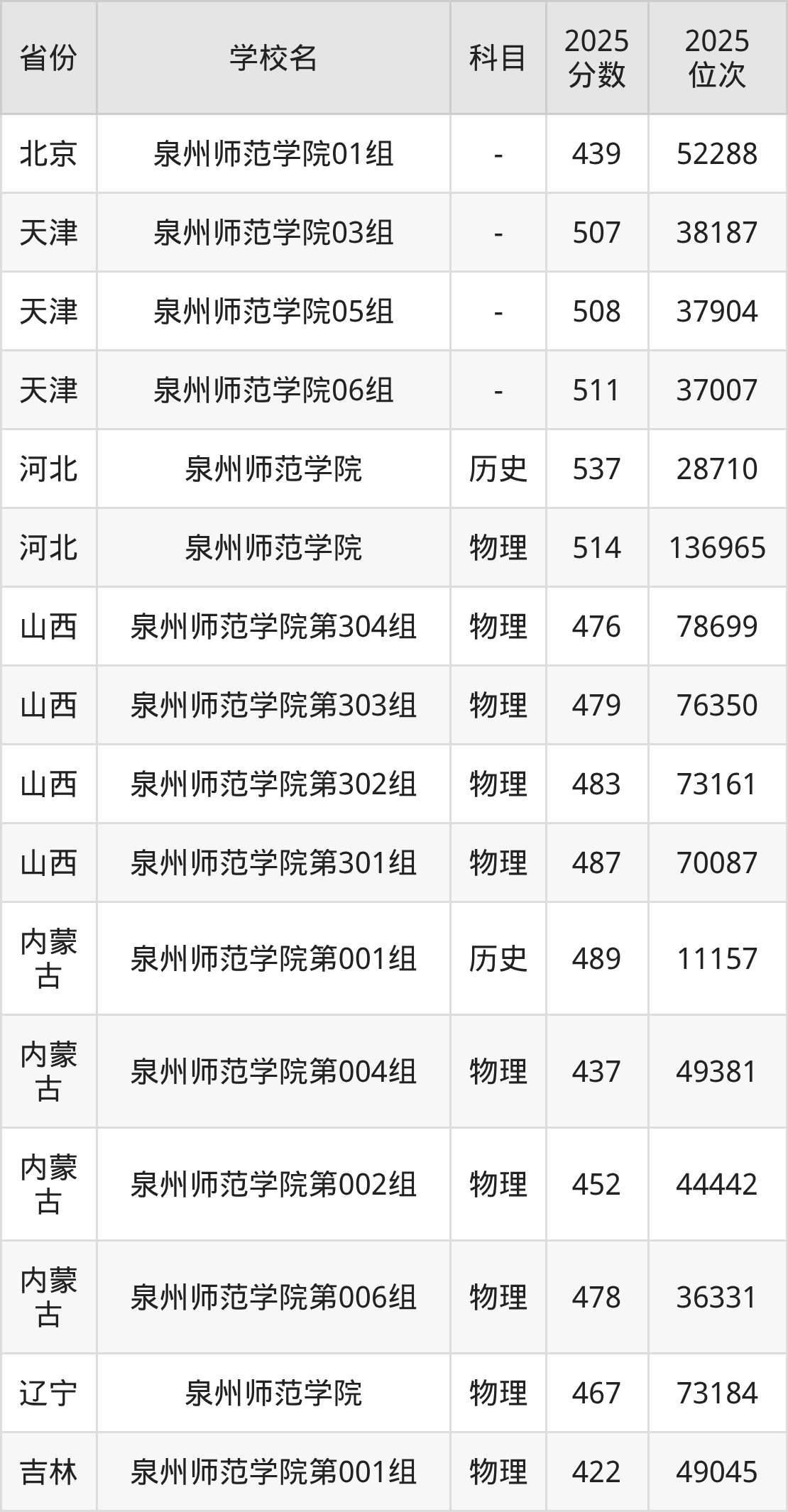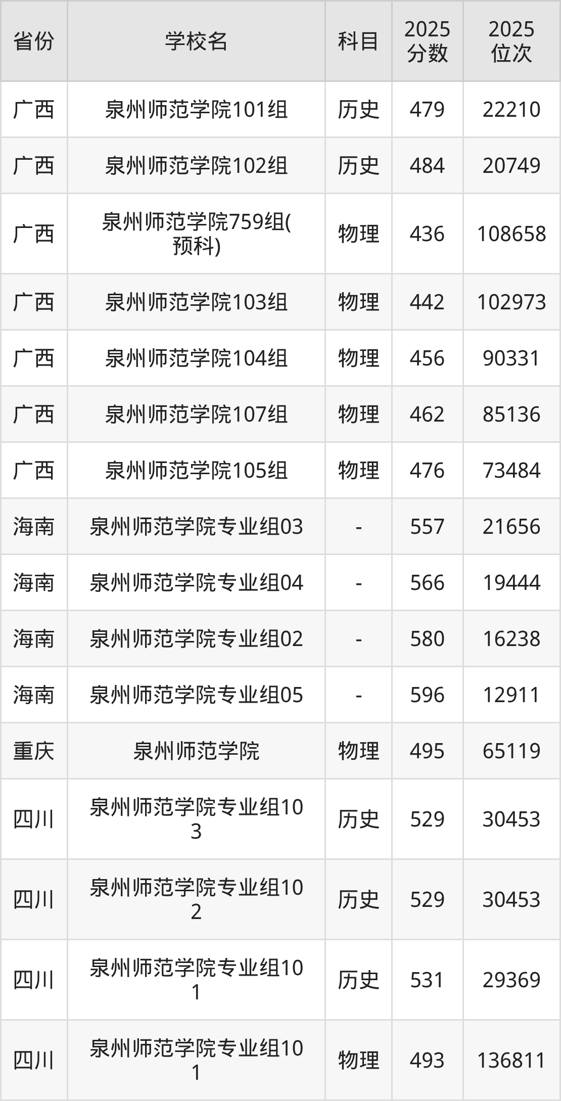2025年泉州师范学院历史类最低分483分(18114名)、物理类最低分486分(81079名)。