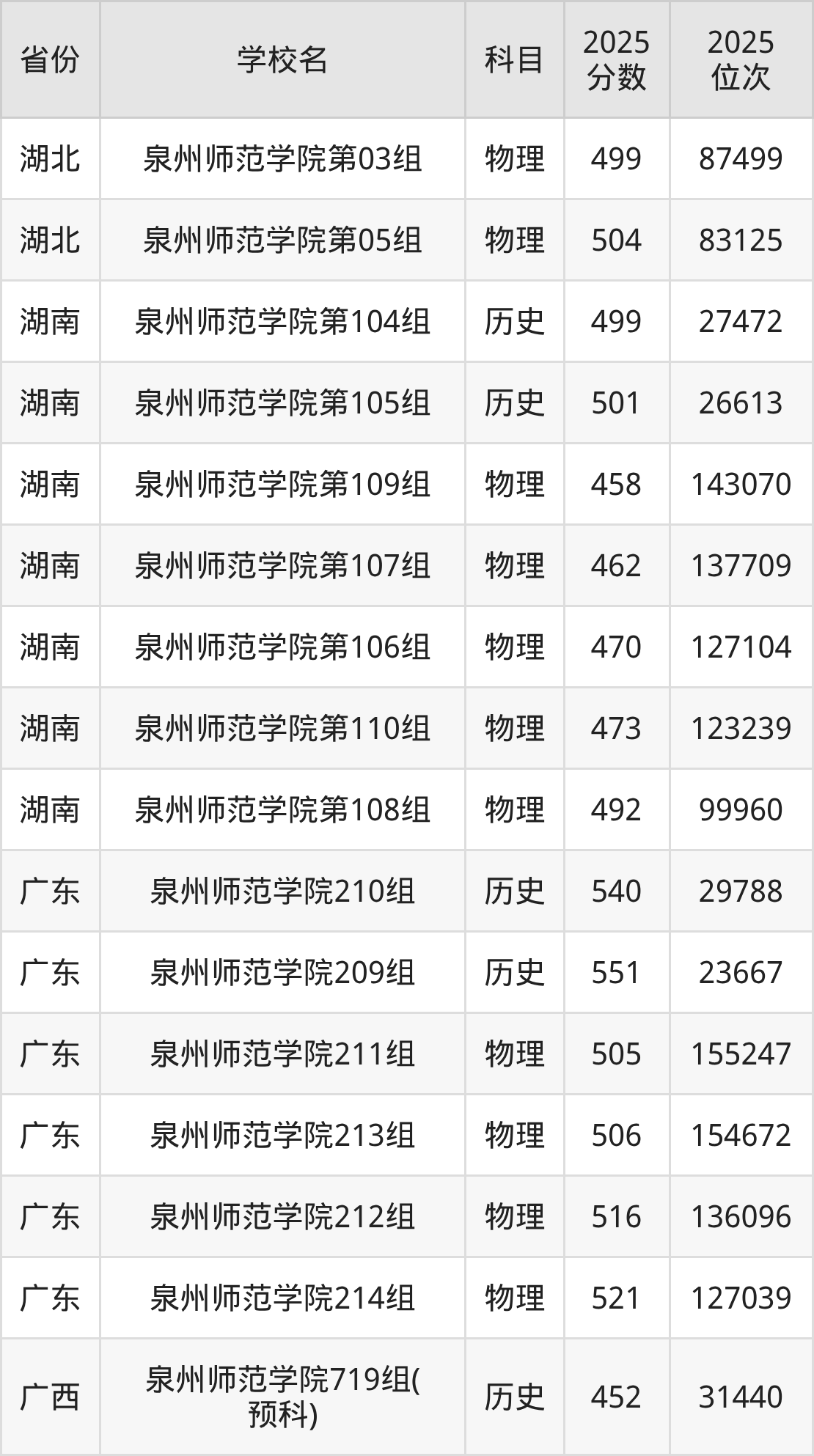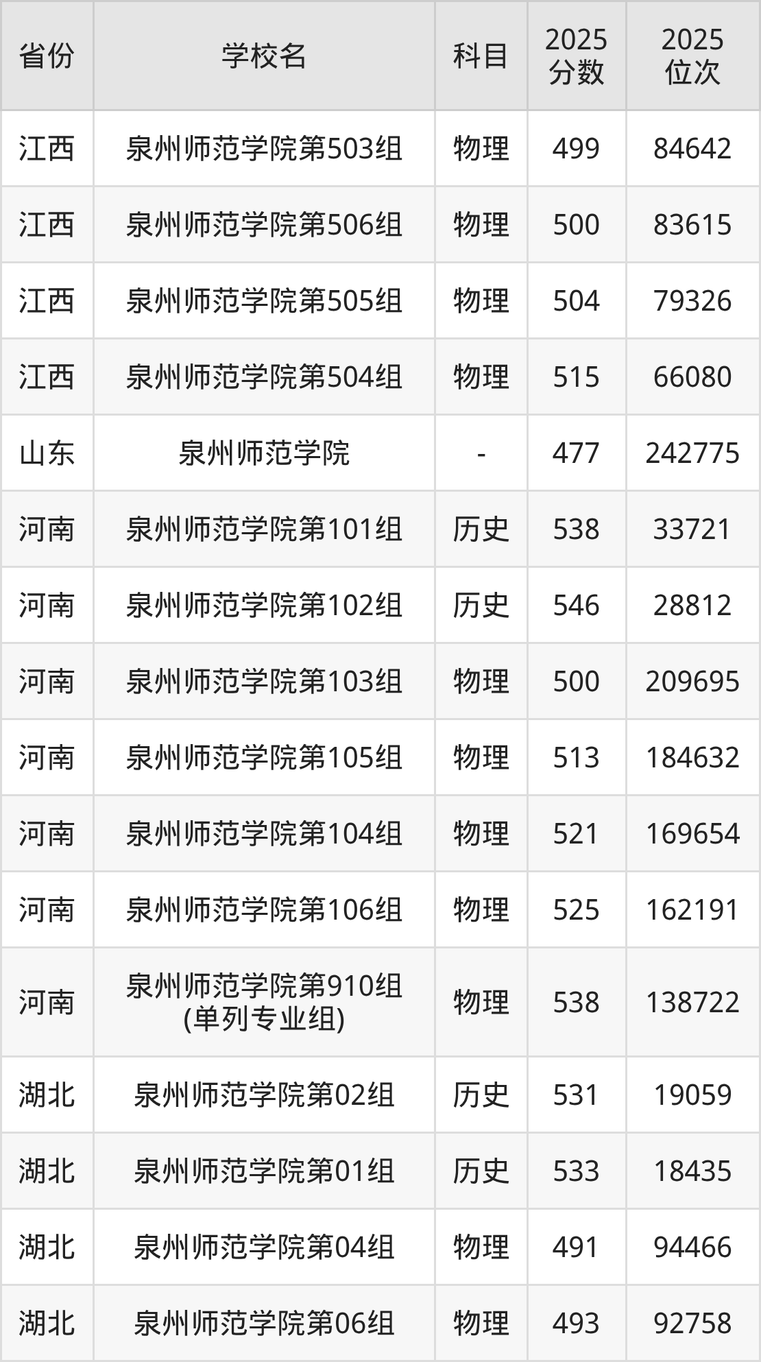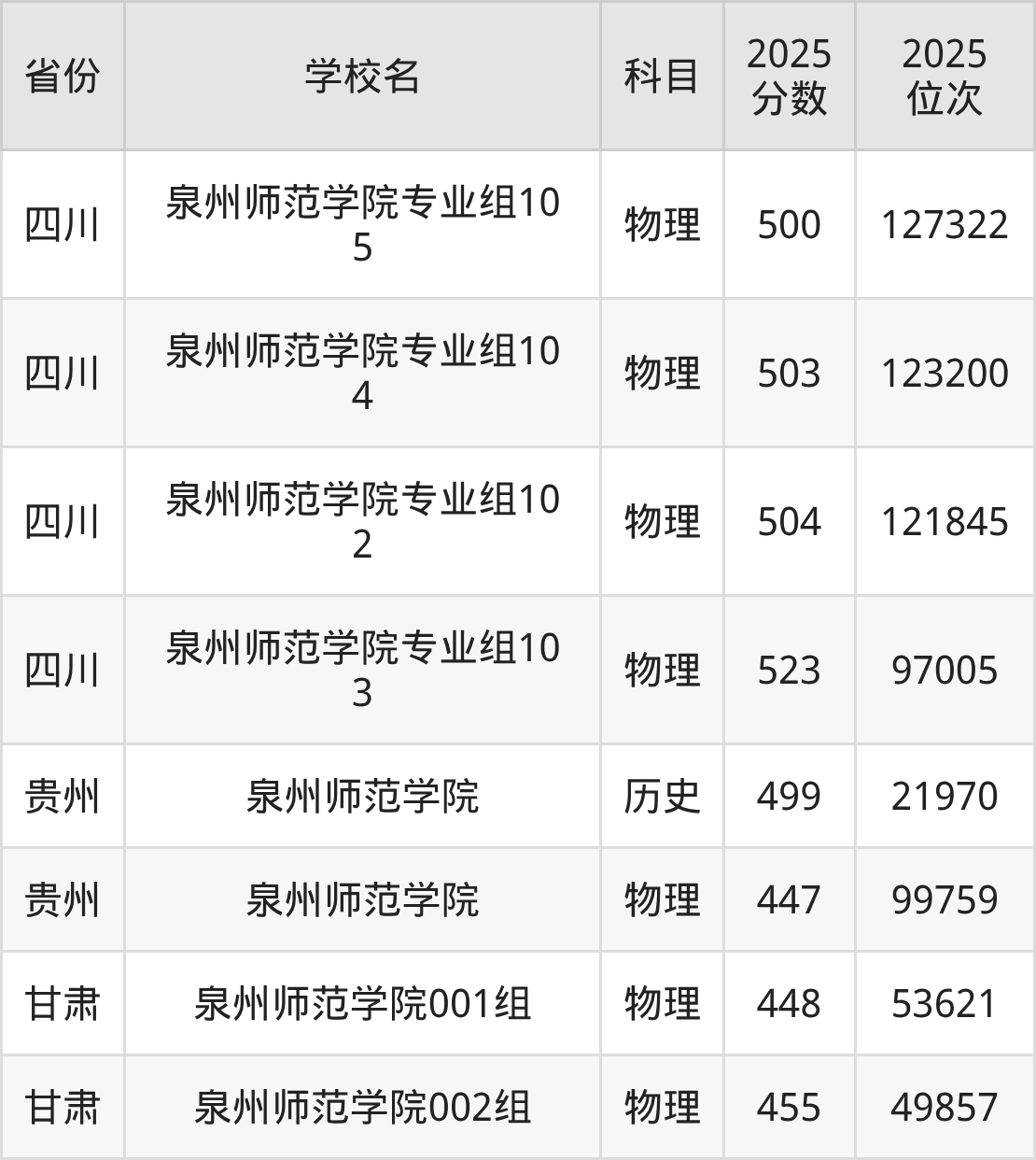 2025年泉州师范学院历史类最低分483分(18114名)、物理类最低分486分(81079名)。