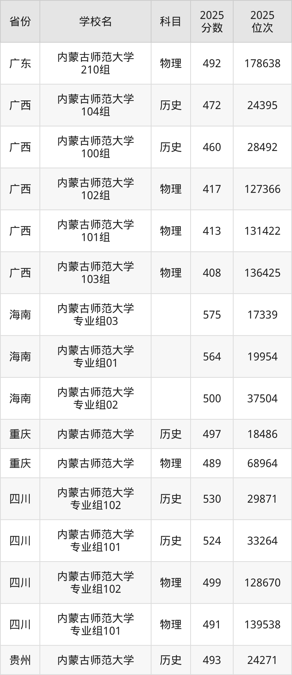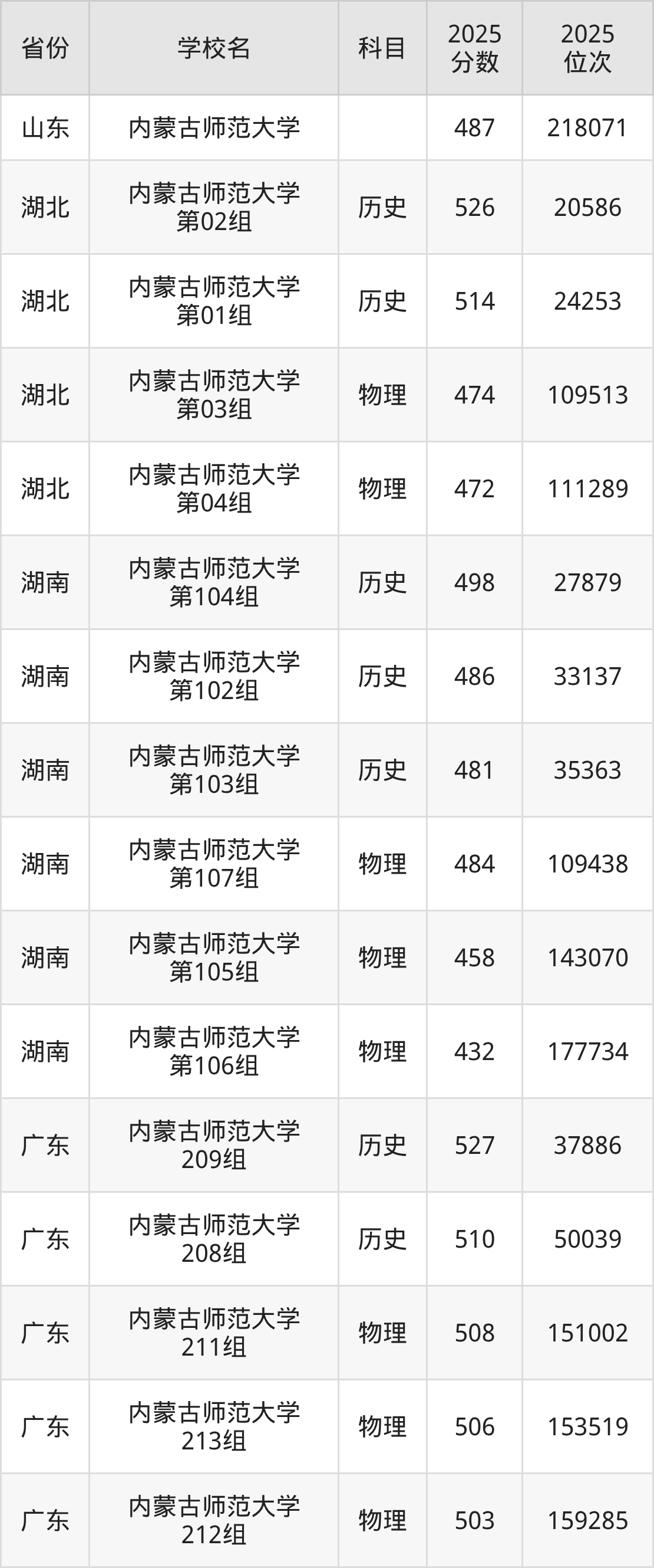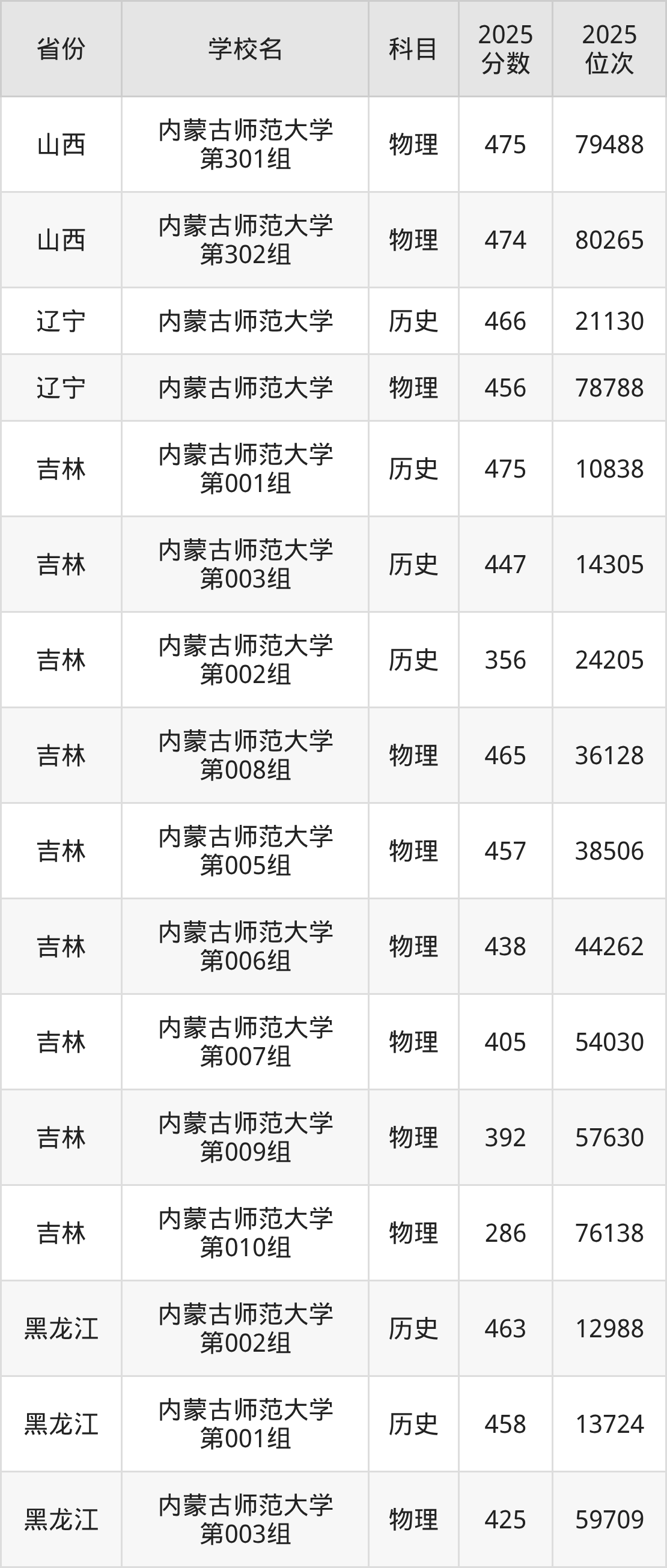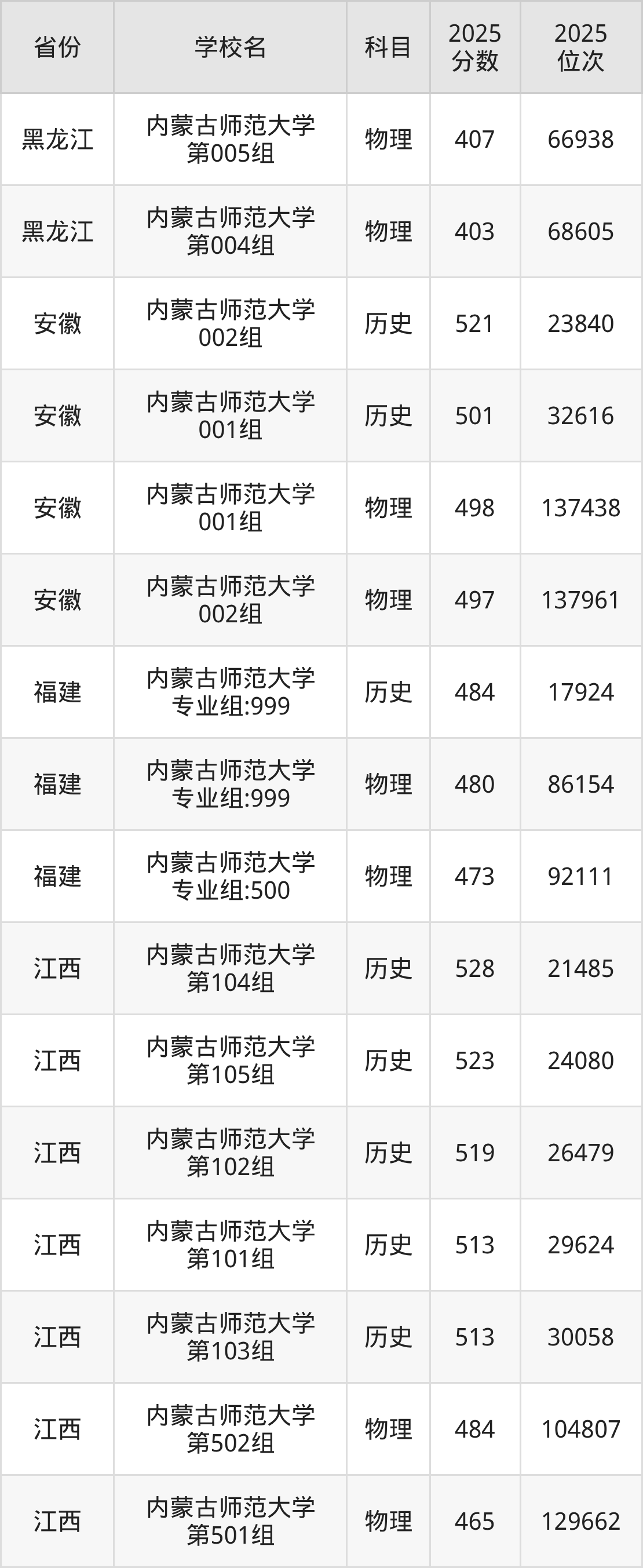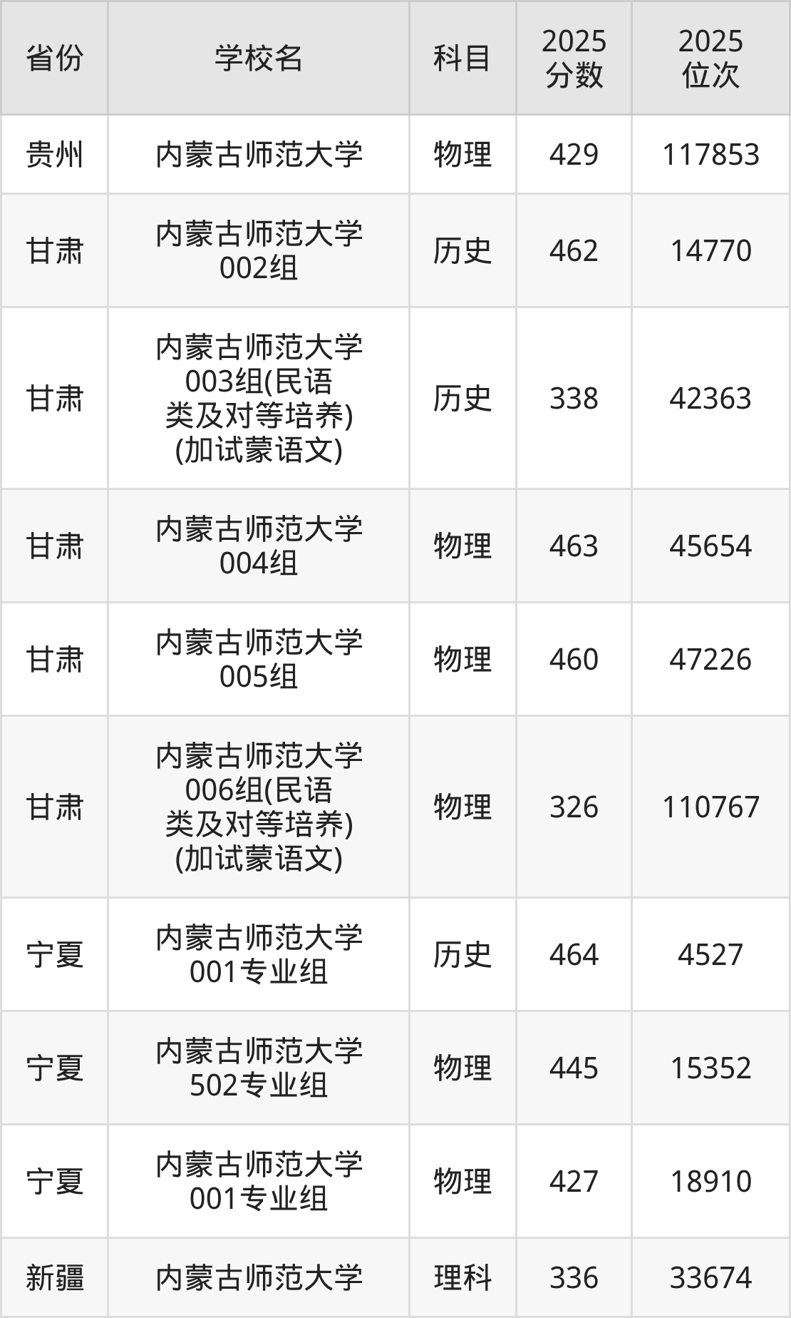 2025年内蒙古师范大学在自治区内分历史物理科目类录取,其中历史类最低分是472分、对应位次是13311名;物理类最低分是399分,对应位次是61601名。