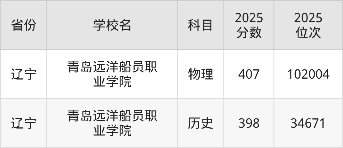 2026年青岛远洋船员职业学院录取分数线预计在400分及以上,在各省录取最低分存在一定差异,如:2025年青岛远洋船员职业学院在辽宁录取最低历史类398分、物理类407分,在山东录取最低分是414分。