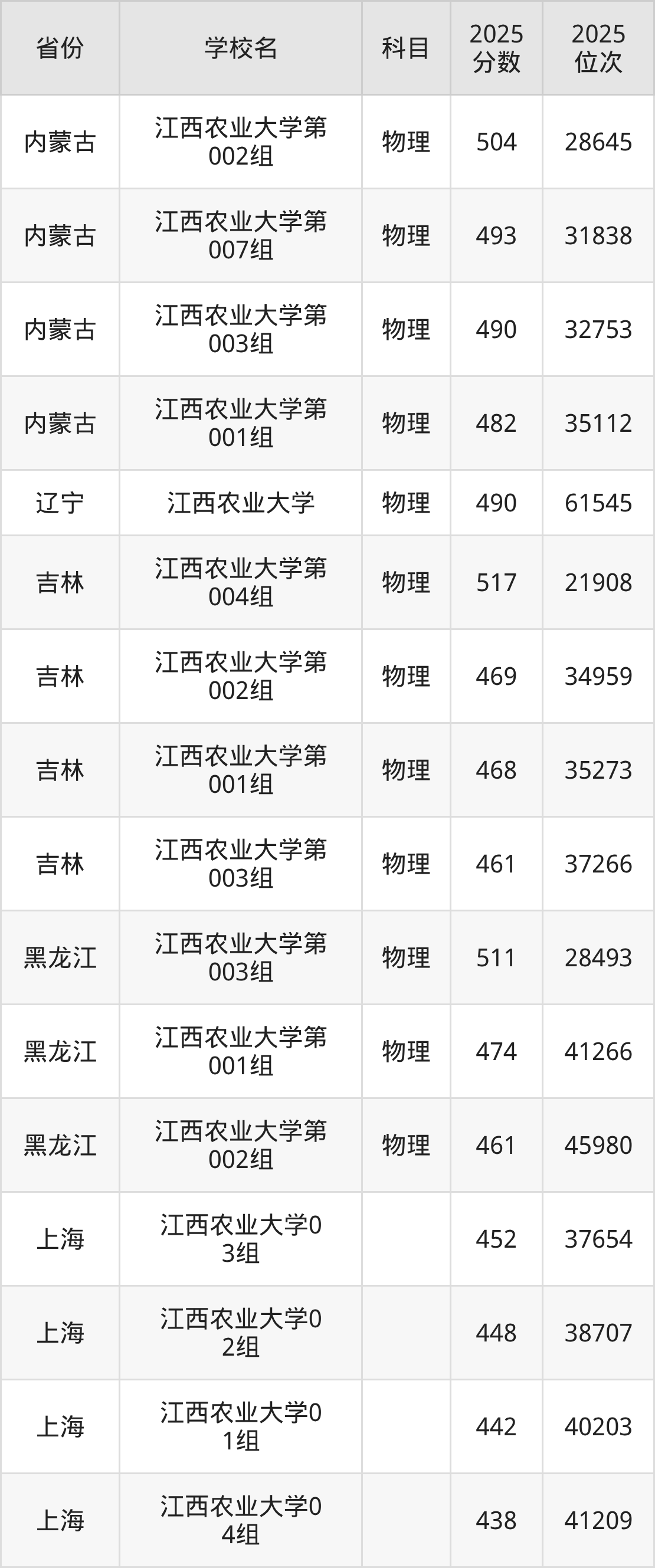 | 江西农业大学第 503组 | 物理 | 511 | 70706 |