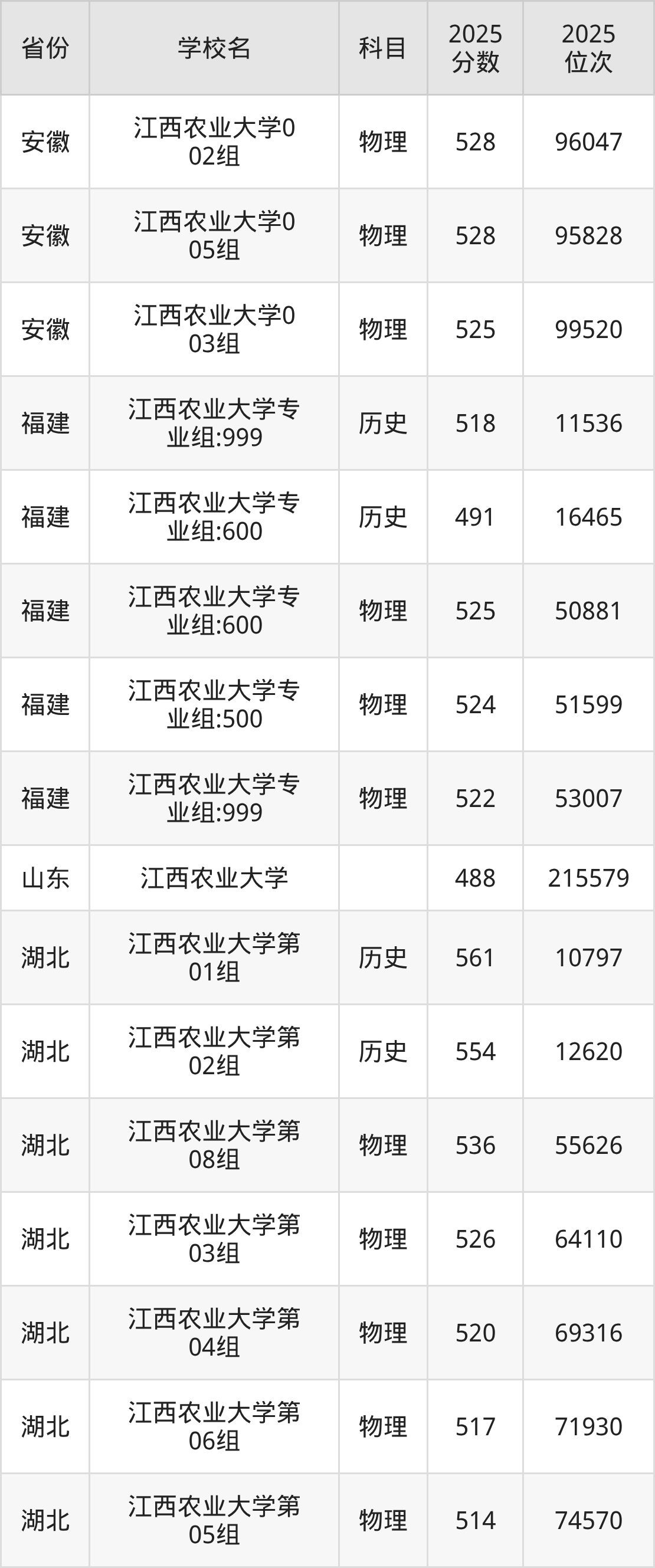 | 江西农业大学第 574组(地方 专项) | 物理 | 518 | 63087 |