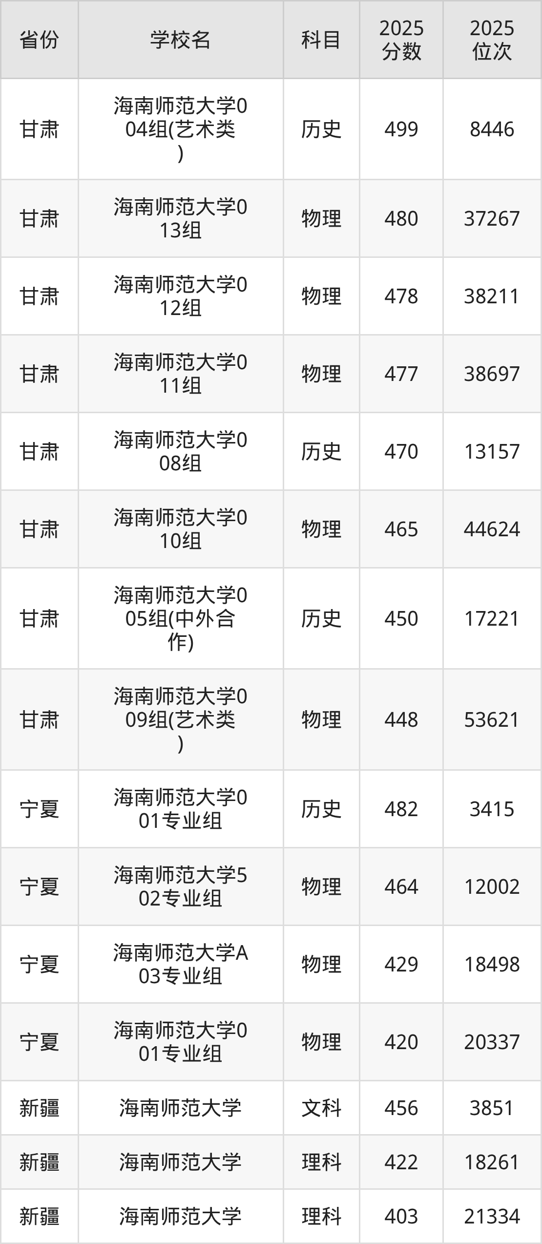2025年海南师范大学在省外录取分数线范围整体位于403分到576分之间,录取分数线最低在新疆理科、录取分数线最高在广东历史(223组)。
