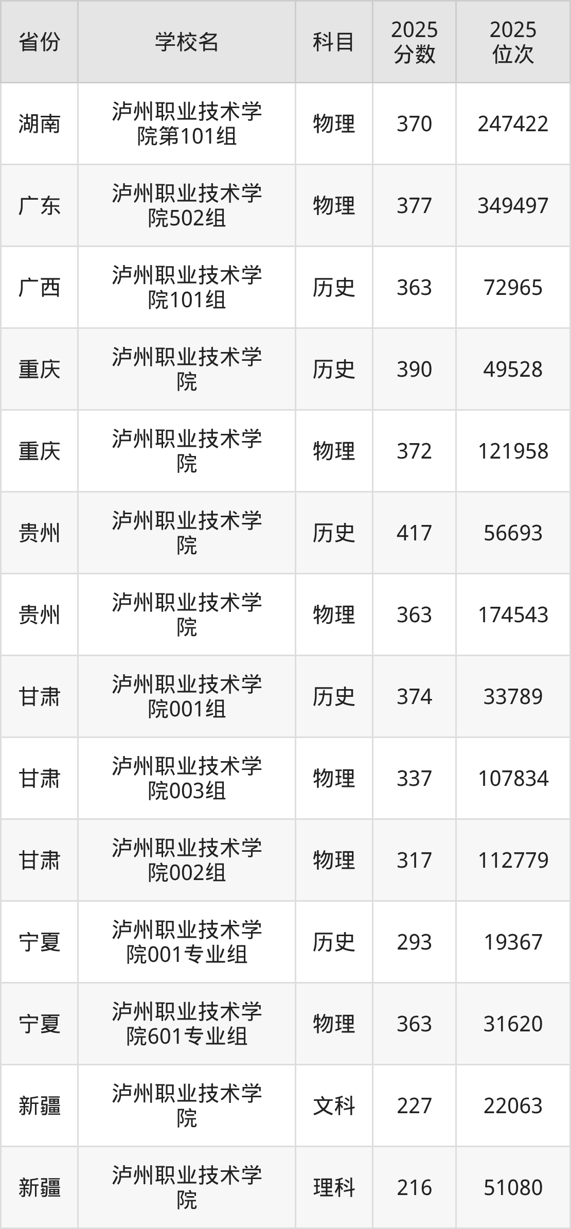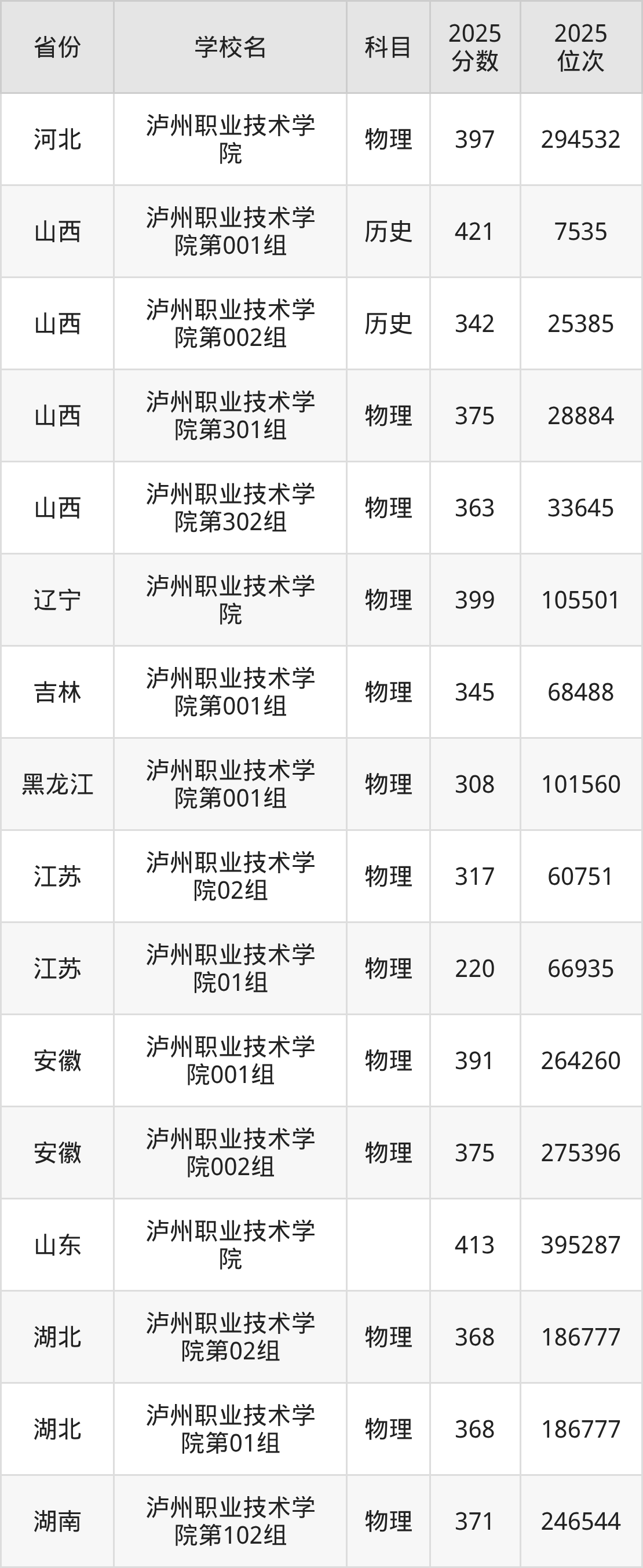 下面是泸州职业技术学院2025年录取分数线各省汇总,一起来了解下吧。