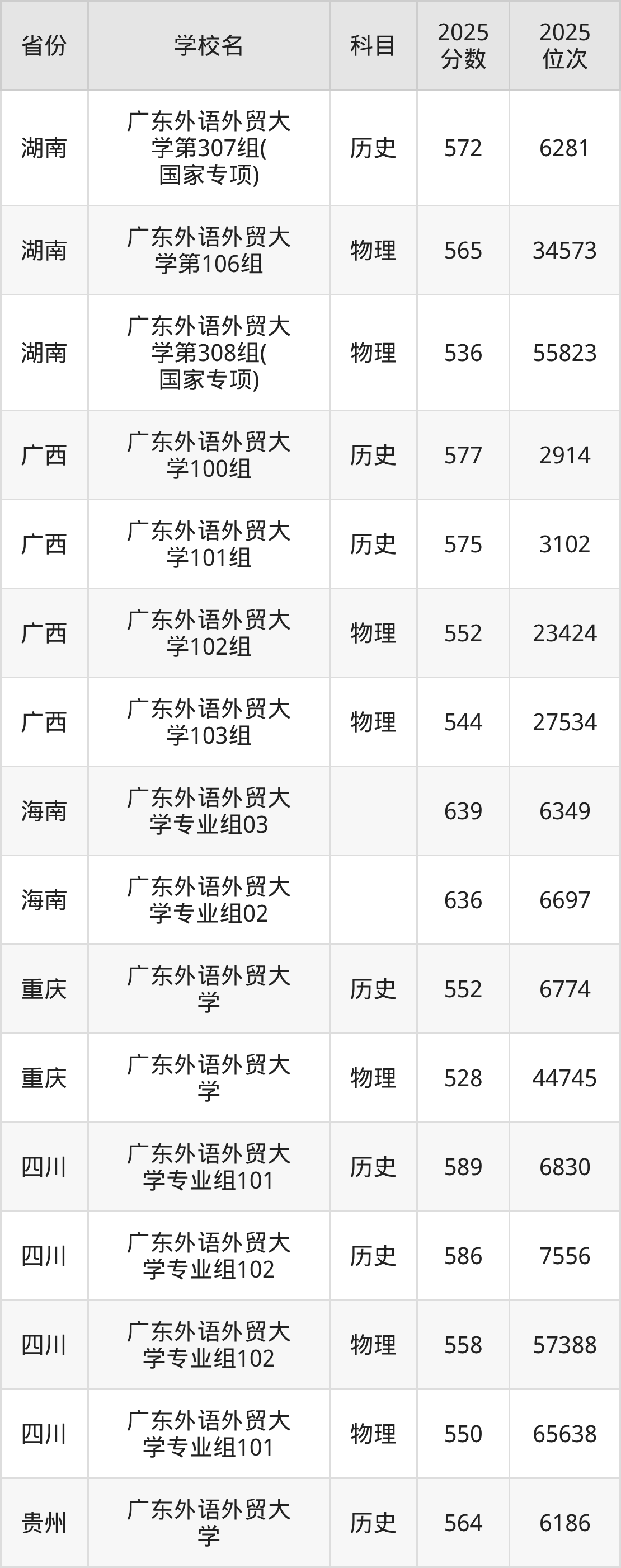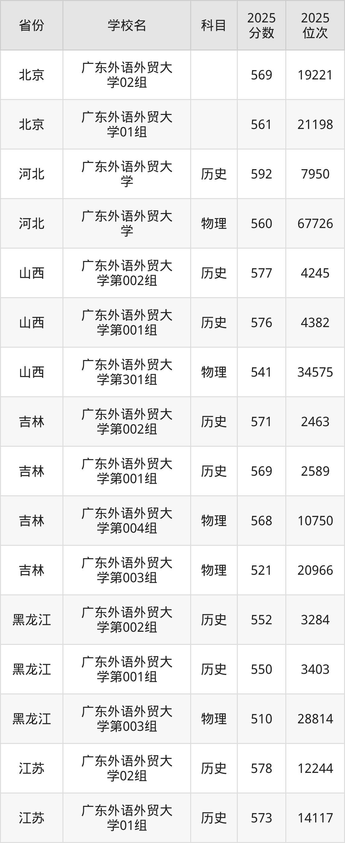 2025年广东外语外贸大学历史类最低分552分(22979名)、物理类最低分536分(102868名)。