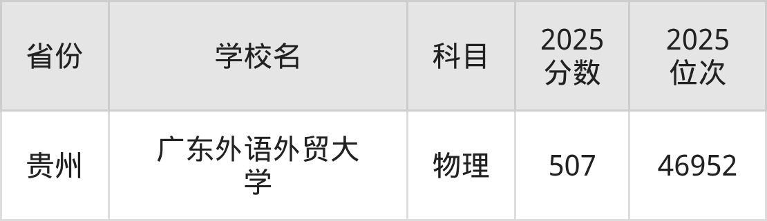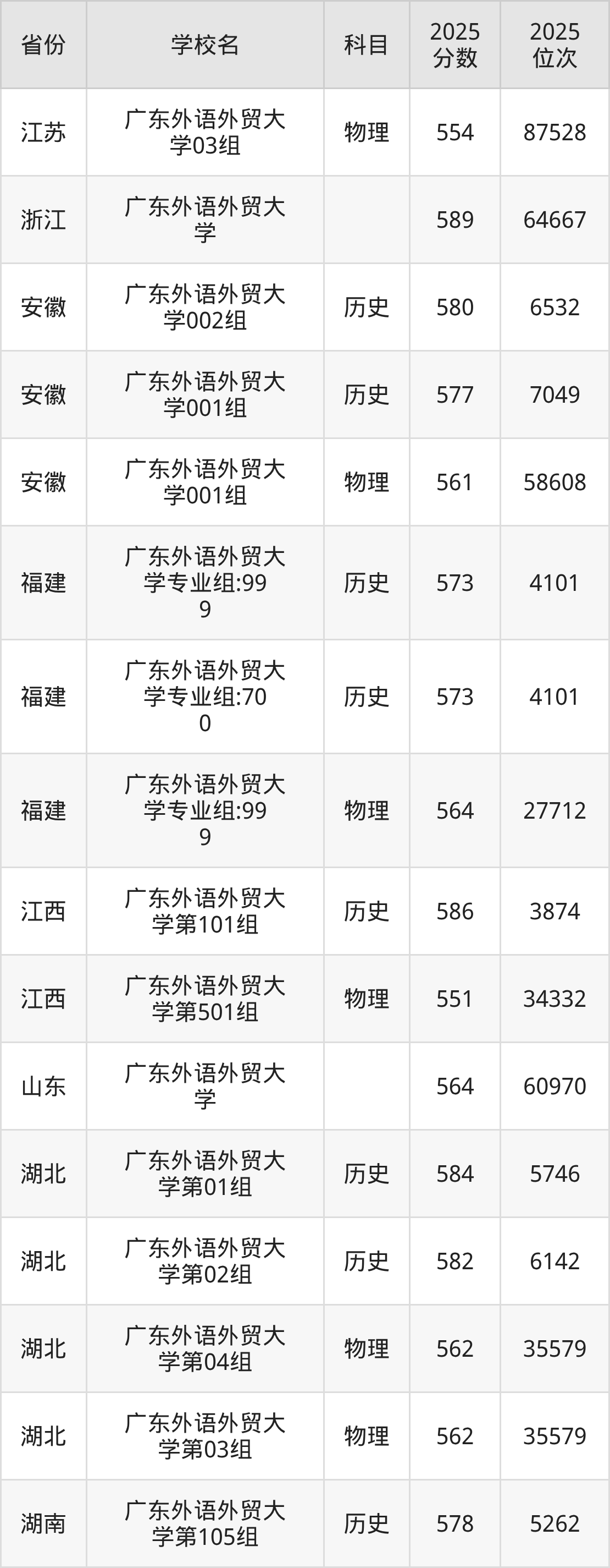 2025年广东外语外贸大学在省内分历史物理科目类录取,其中历史类最低分是552分、对应位次是22979名;物理类最低分是536分,对应位次是102868名。