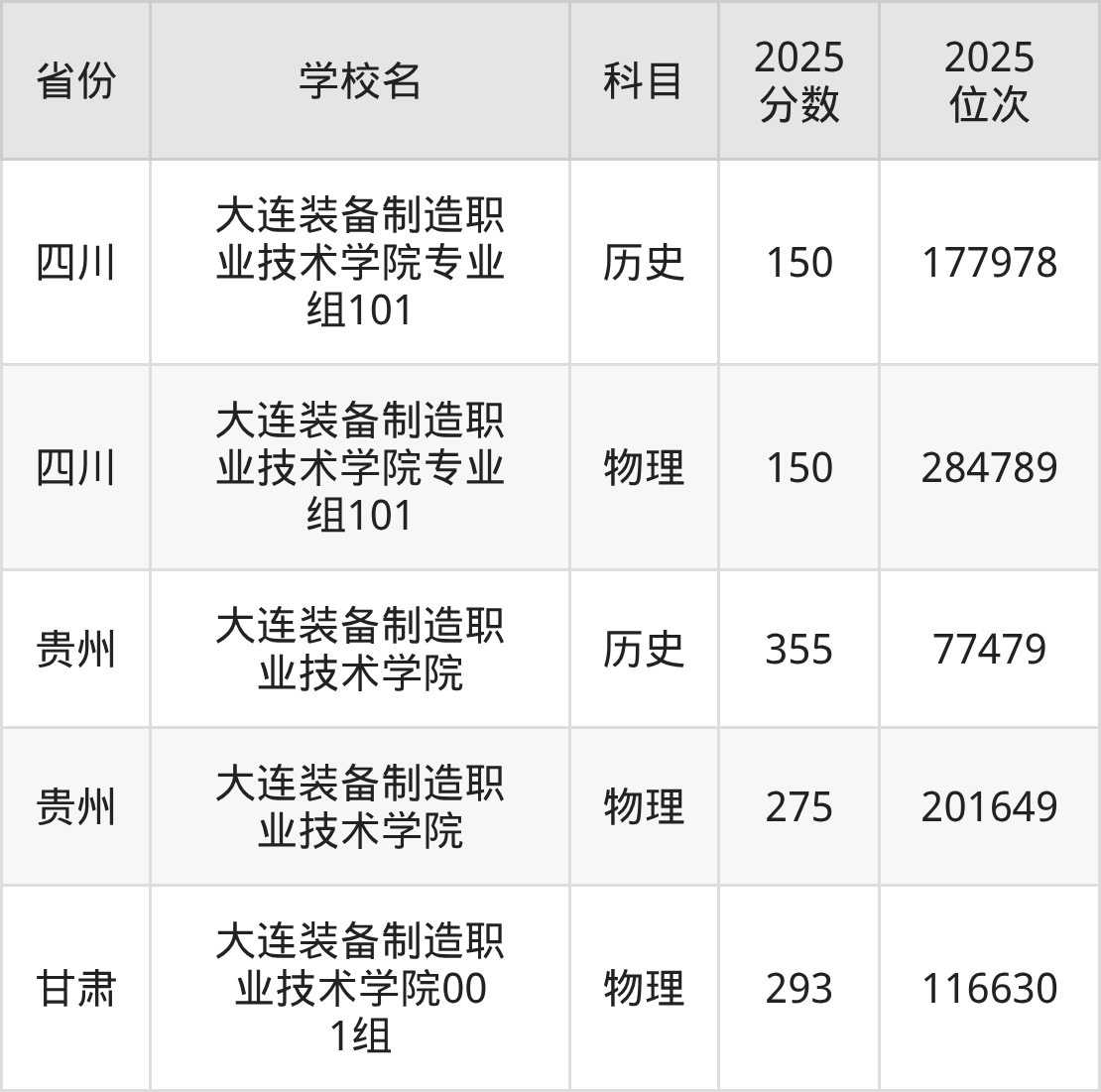 2025年大连装备制造职业技术学院在省内分历史物理科目类录取,其中历史类最低分是275分、对应位次是53099名;物理类最低分是249分,对应位次是141101名。