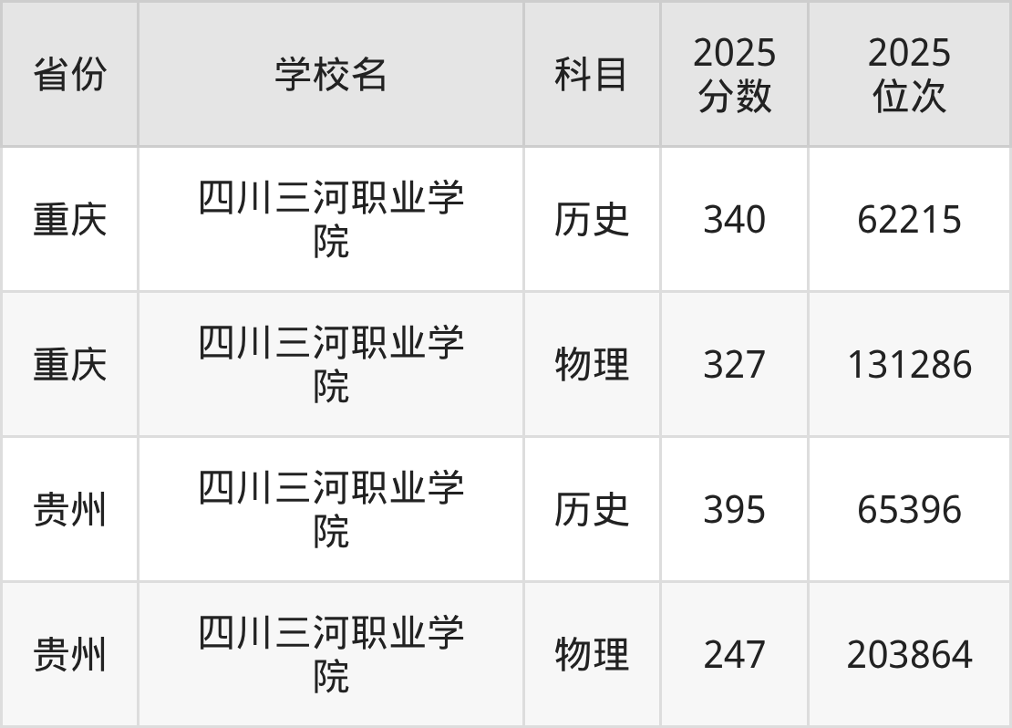 2025年四川三河职业学院在省内分历史物理科目类录取,其中历史类最低分是304分、对应位次是164205名;物理类最低分是150分,对应位次是284789名。
