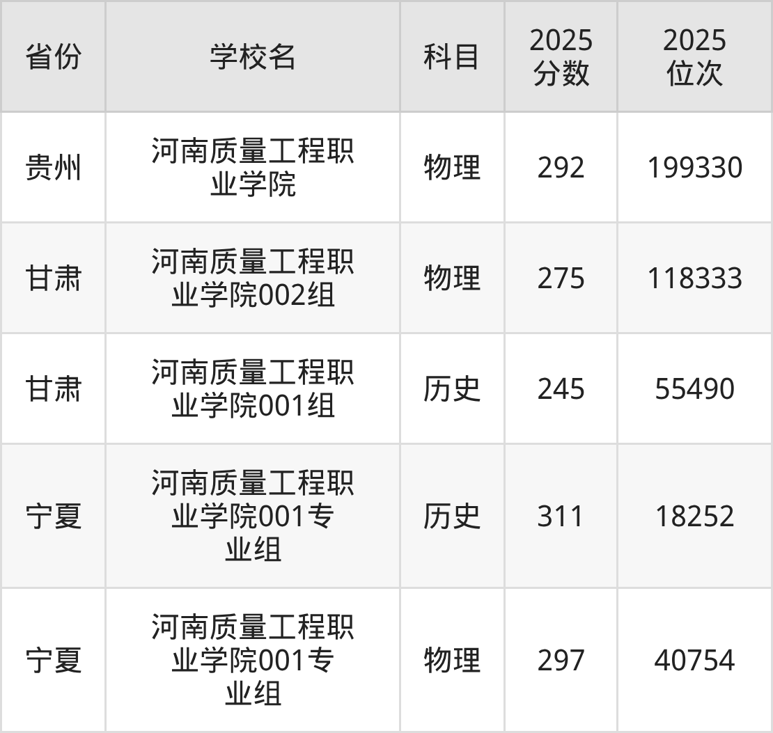2026年河南质量工程职业学院录取分数线预计在280分及以上,在各省录取最低分存在一定差异,如:2025年河南质量工程职业学院在贵州录取最低物理类292分,在甘肃录取最低历史类245分、物理类275分,在宁夏录取最低历史类311分、物理类297分。