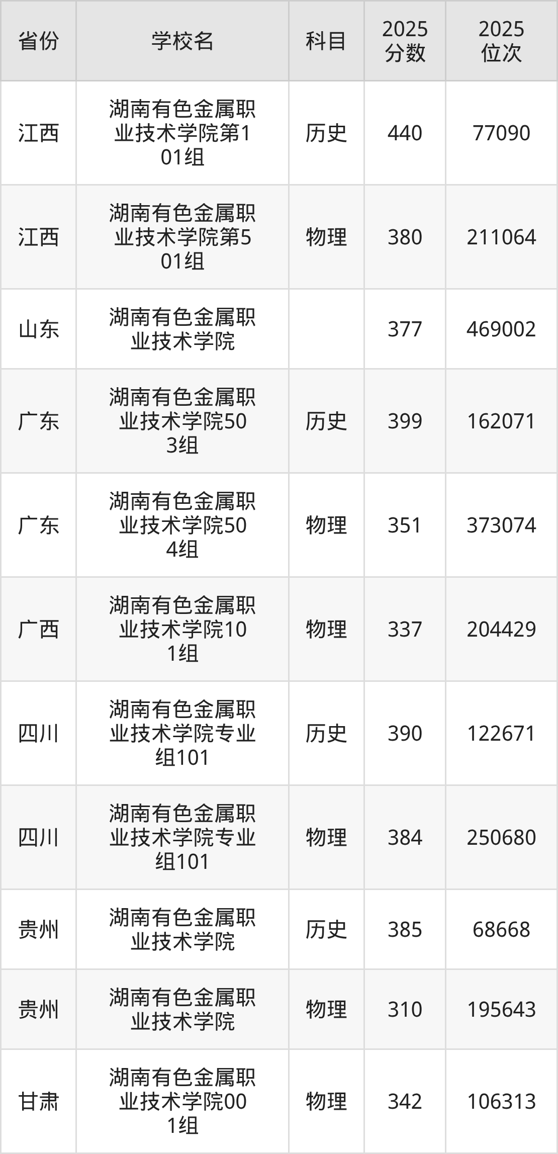 2026年湖南有色金属职业技术学院录取分数线预计在370分及以上,在各省录取最低分存在一定差异,如:2025年湖南有色金属职业技术学院在四川录取最低历史类390分、物理类384分,在贵州录取最低历史类385分、物理类310分,在甘肃录取最低物理类342分。