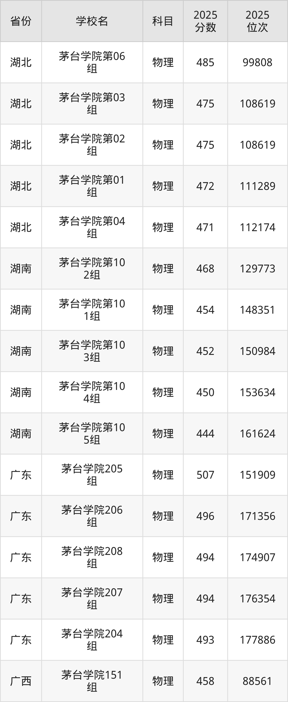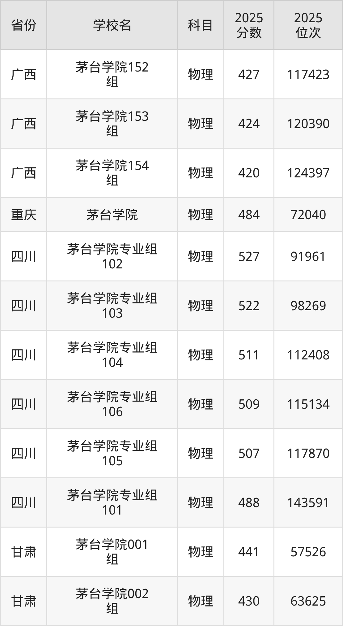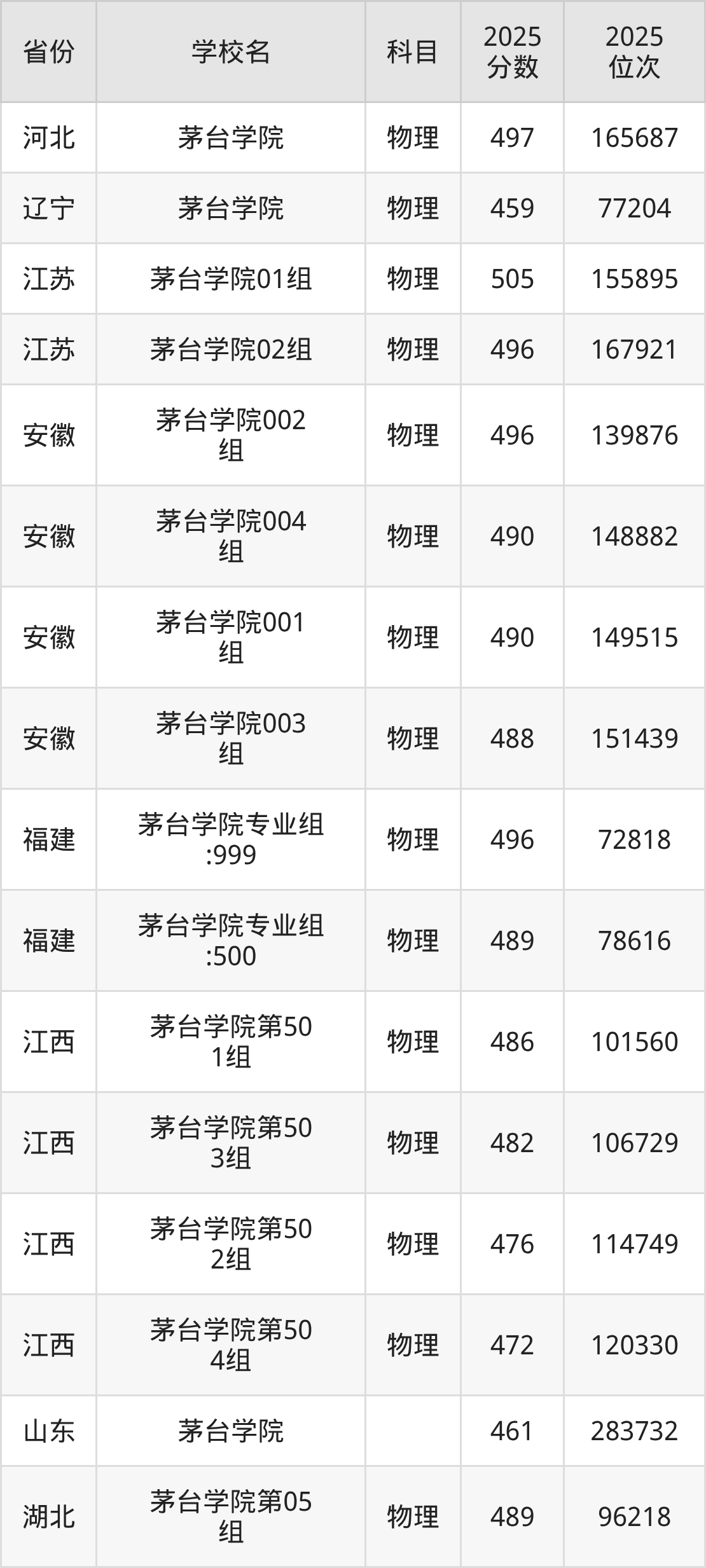 2025年茅台学院在省内分历史物理科目类录取,其中历史类最低分是490分、对应位次是25432名;物理类最低分是436分,对应位次是111289名。