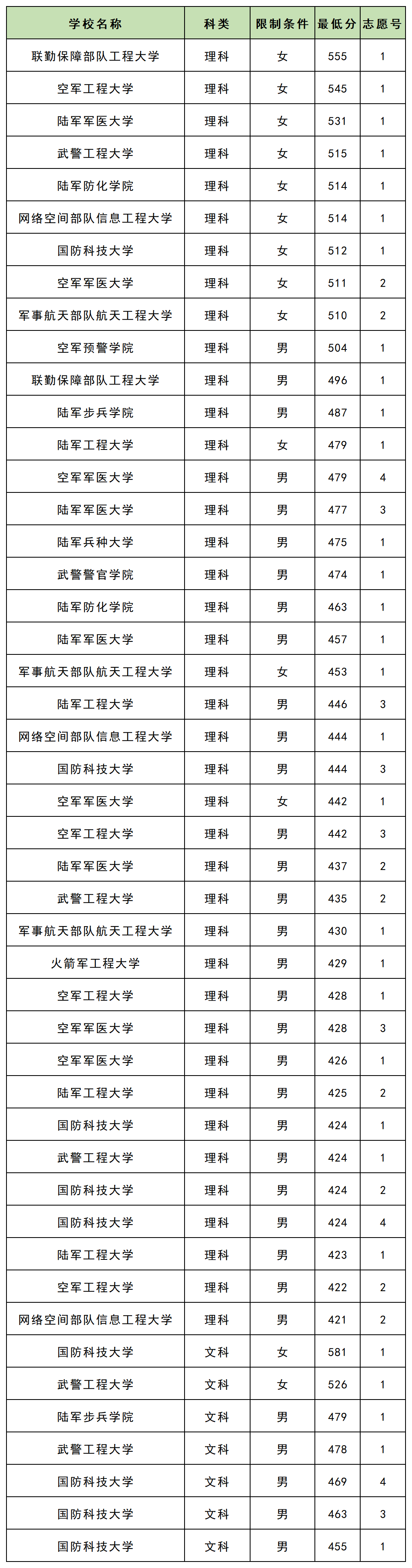 空军军医大学(理科442分)、军事航天部队航天工程大学(理科453分)、陆军工程大学(理科479分)、国防科技大学(理科512分)等。