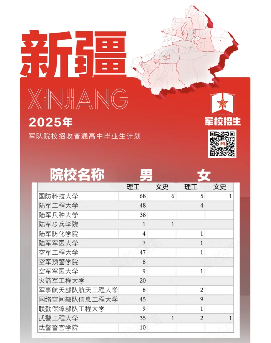 在新疆维吾尔自治区招生的军校有16所,招生计划总数共计407人,其中男生378人,女生29人。国防科技大学计划招生数最多,共有80人,其中男生74人,女生6人。