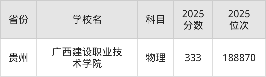 2025年广西建设职业技术学院在壮族自治区内分历史物理科目类录取,其中历史类最低分是334分、对应位次是87843名;物理类最低分是322分,对应位次是216214名。