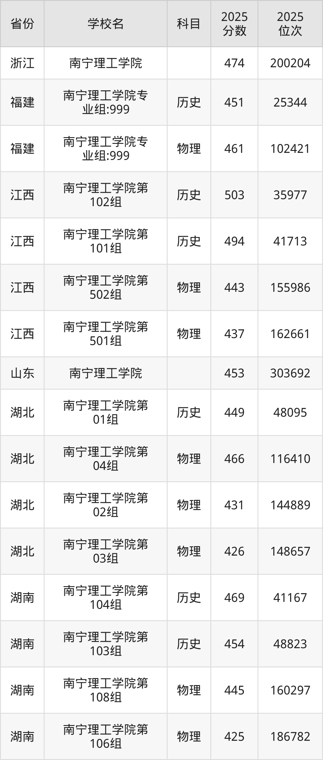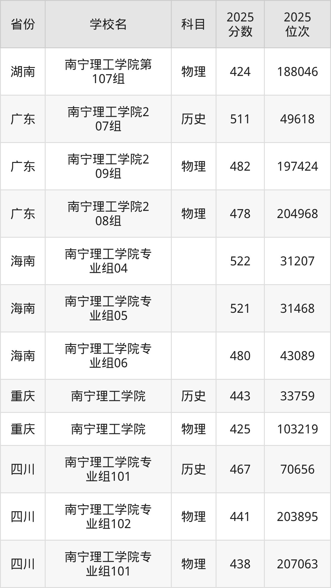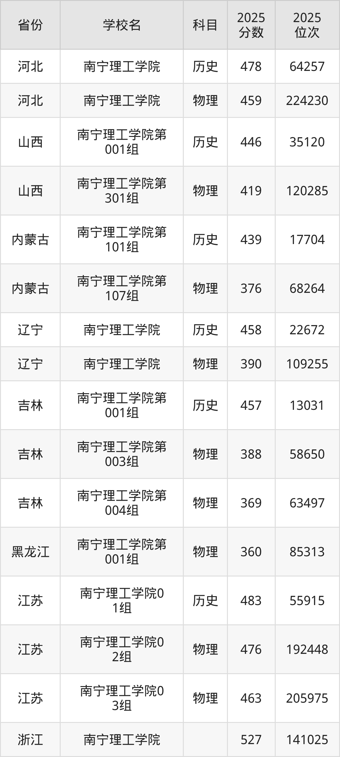 2025年南宁理工学院历史类最低分402分(53085名)、物理类最低分370分(174425名)。
