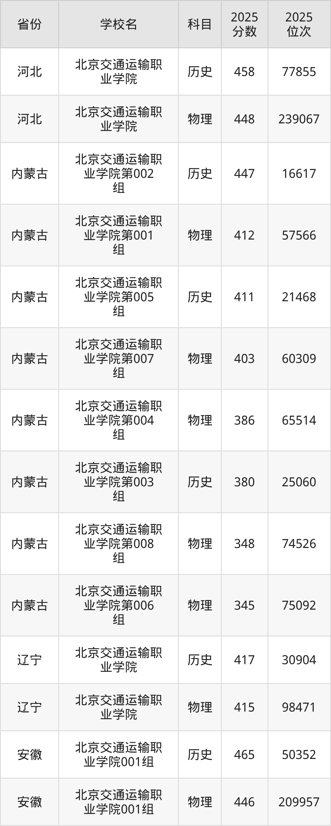 2025年北京交通运输职业学院历史类最低分465分(50352名)、物理类最低分446分(209957名)。