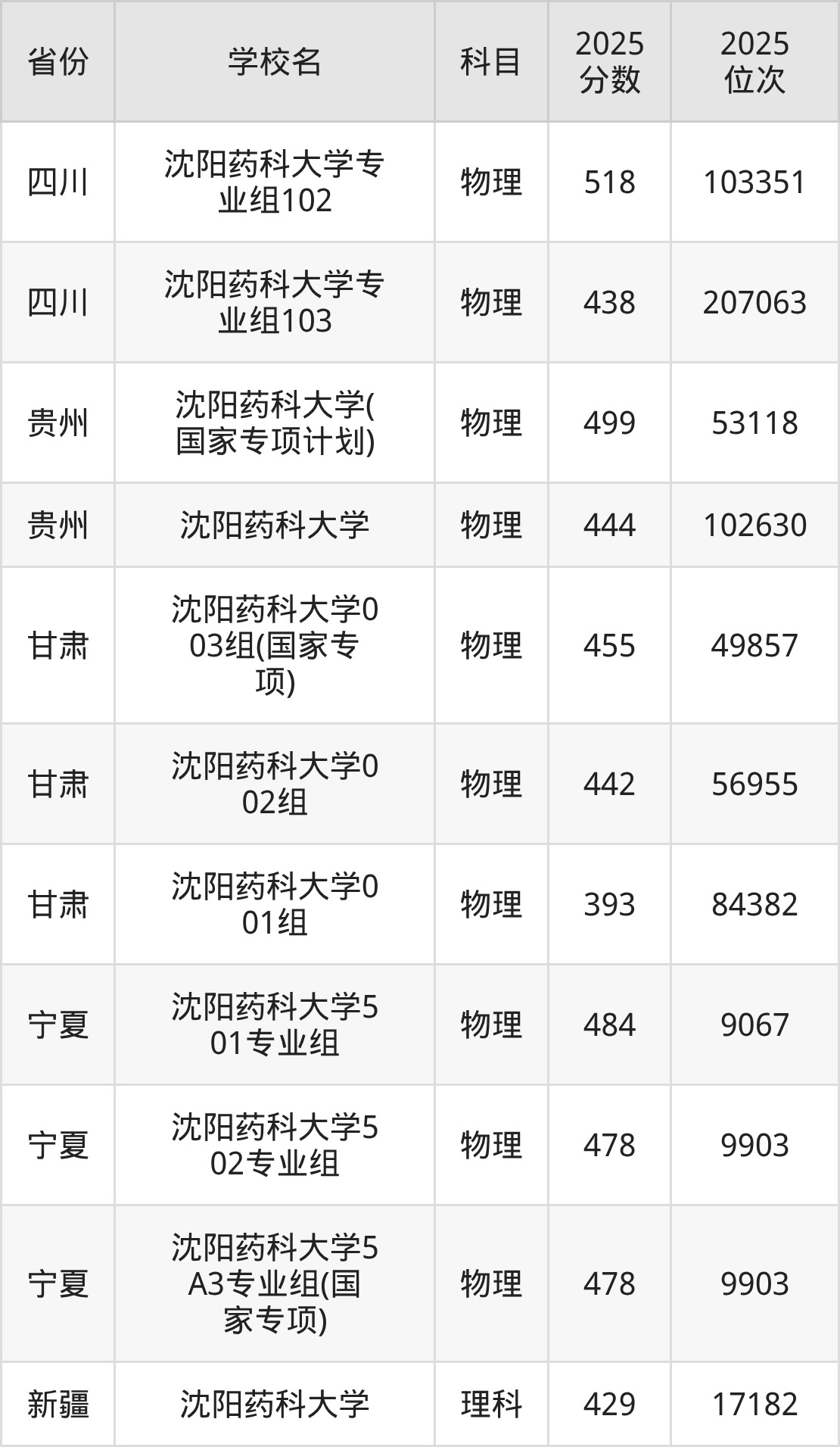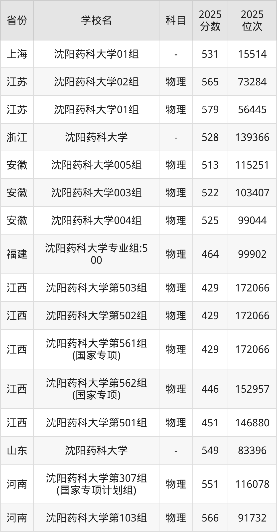 | 沈阳药科大学 | 物理 | 532 | 41074 |