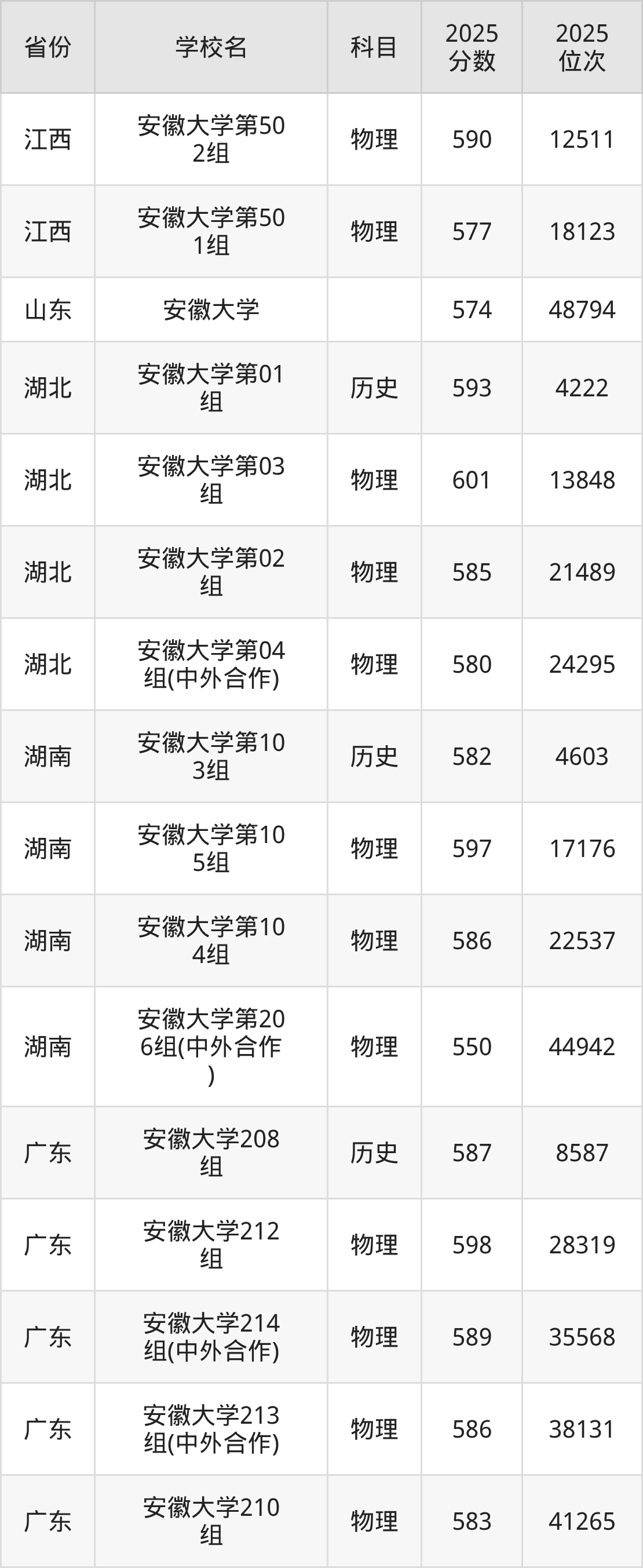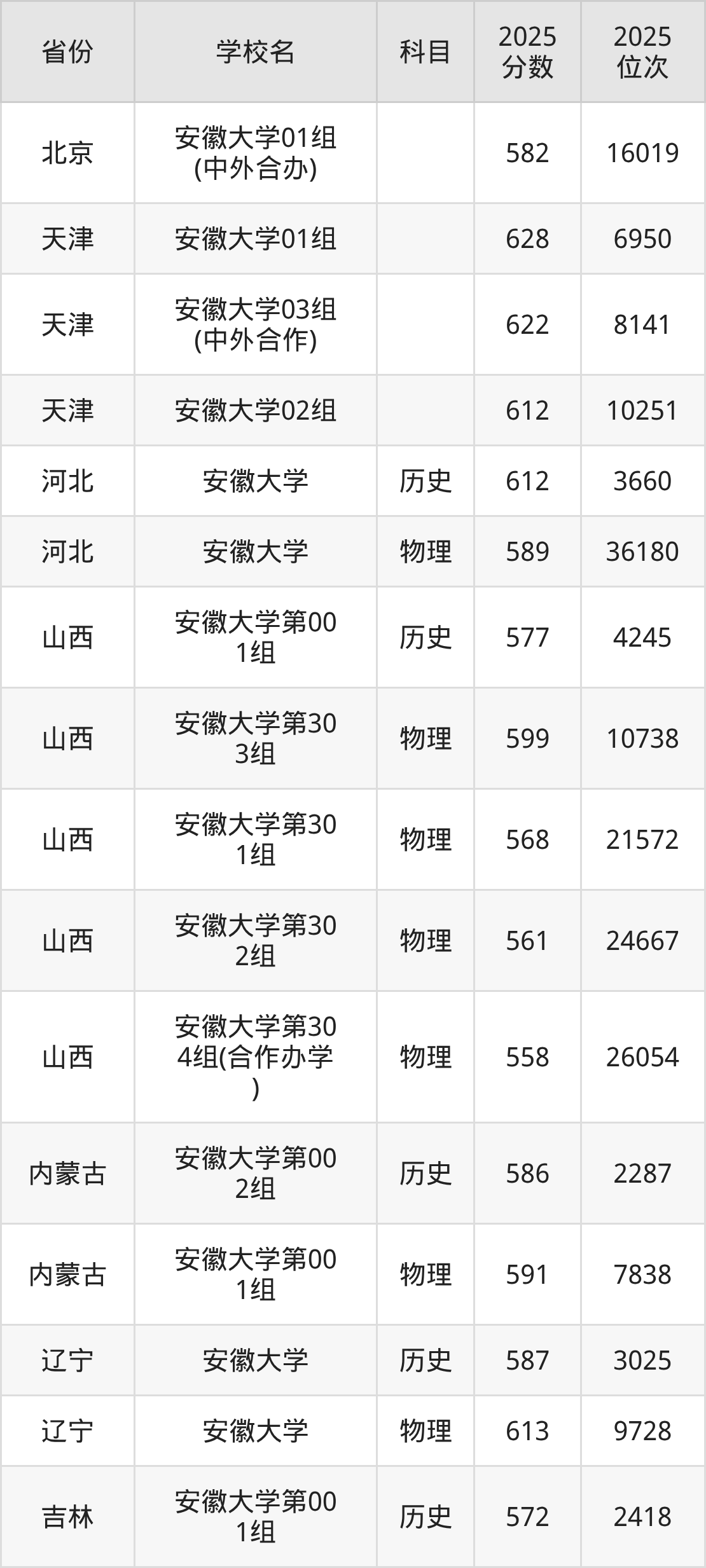 2025年安徽大学在省内分历史物理科目类录取,其中历史类最低分是588分、对应位次是5060名;物理类最低分是594分,对应位次是31136名。