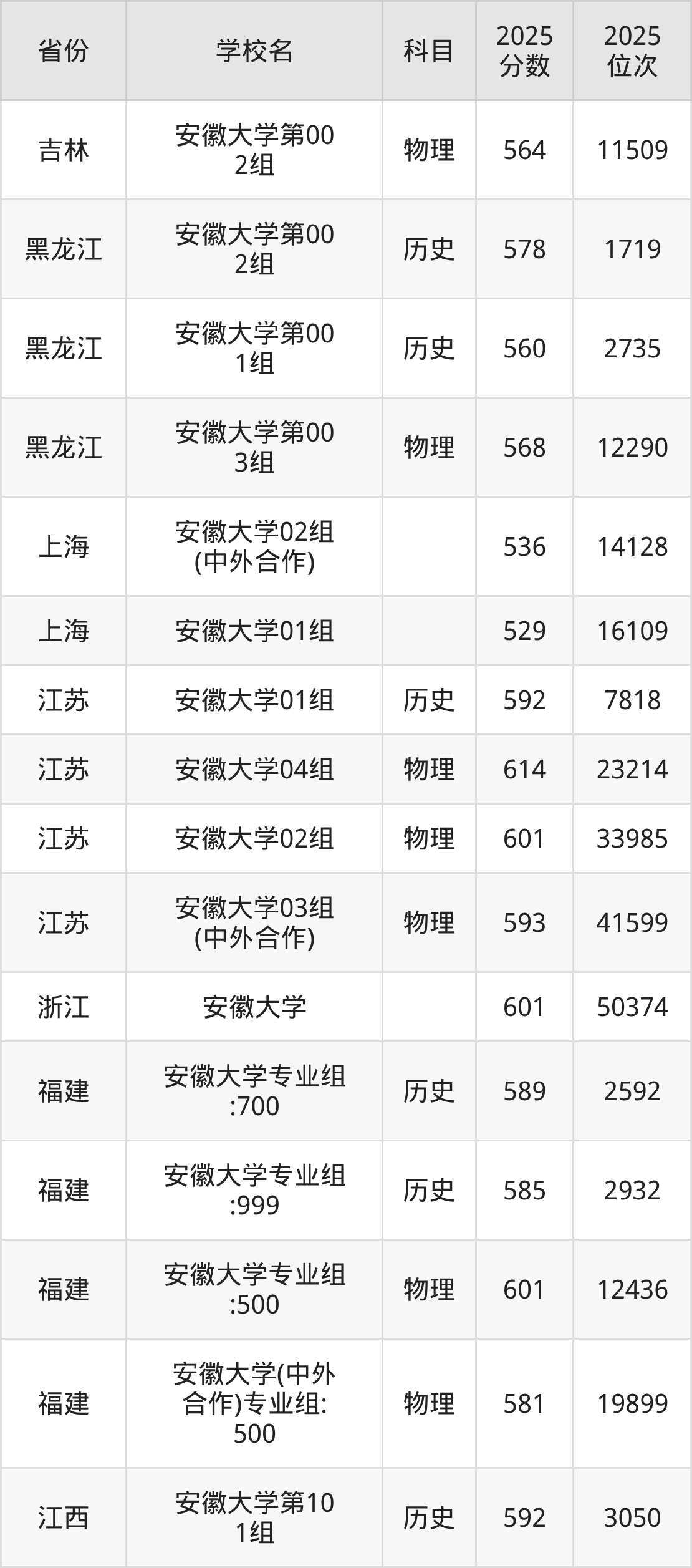 2026年安徽大学录取分数线预计在580分及以上,在各省录取最低分存在一定差异,如:2025年安徽大学在江西录取最低历史类592分、物理类577分,在山西录取最低历史类577分、物理类558分,在吉林录取最低历史类572分、物理类564分。